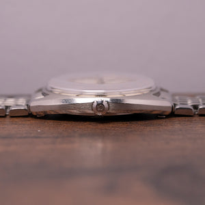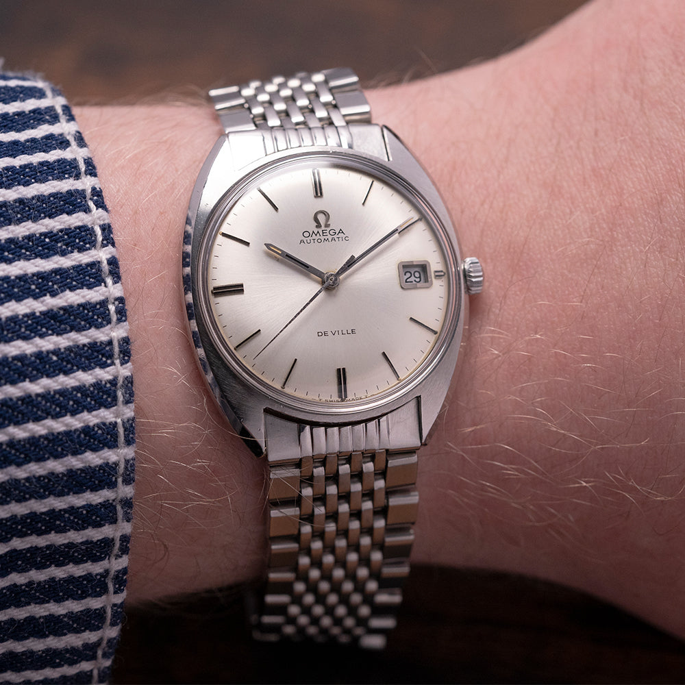 Here we have a 1968 Omega De Ville Automatic 166.029 with a 34.5mm C-shaped stainless steel case curving over your wrist with tapered lugs, in 1967 Omega launched the De Ville as a stand-alone line, a much more streamlined, varied, and younger feel than the Seamaster, it soon became Omega’s best-selling collection. Polished and brushed surfaces transition with crisp lines along chamfered edges leading to a lug-to-lug length of 39.5mm and a case thickness of 10.5mm ensuring a comfortable fit on your wrist. On the right side is a signed crown. The domed crystal sits above a striking sunburst silver dial, an outer minute track has applied single, and double baton indexes and Tritium pips marking the hours. At 3 o’clock a framed date window and elegant baton hands have Tritium tips complemented by a tapered sweeping second hand completing this stunning vintage dress watch. At 12 o’clock we have the Omega motif and “Omega Automatic'' printed underneath and at 6 o’clock “De Ville''. On the reverse a screw-down case back, inside an automatic Omega Cal. 565, 24 jewels, beating at 19,800 beats per hour, the quickset date is done by repeatedly pulling the crown. The watch comes fitted with its original Omega 19mm “Beads of Rice'' stainless steel Omega-signed bracelet with a signed folding clasp and the watch comes with its original vintage red Omega box, outer box, and original paperwork.