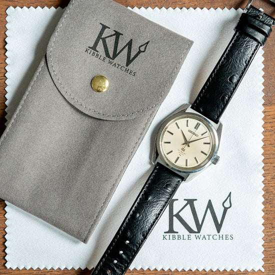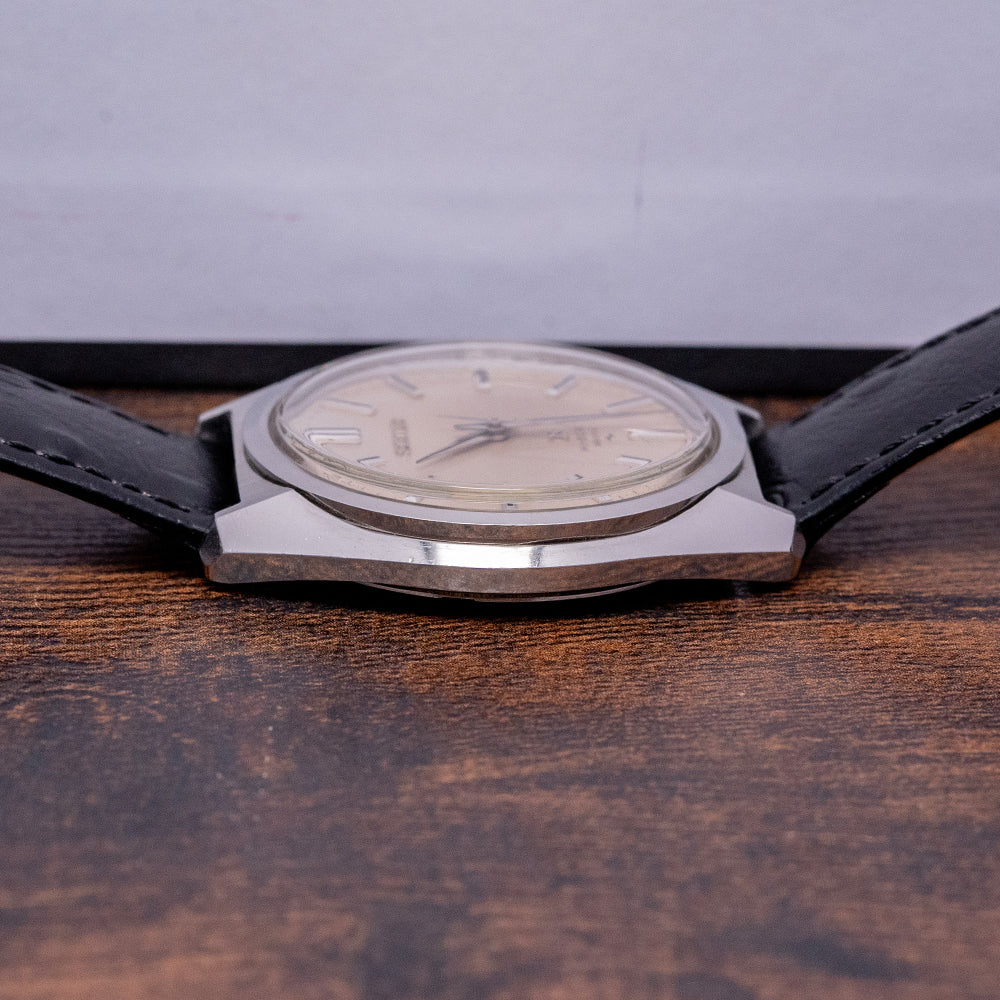 Here we have a classic 1968 Seiko Grand Seiko Hi-Beat 36000 Manual 4520-8000 with a 36mm stainless steel case. The case gently curves over your wrist with stubby lugs, and a lug-to-lug length of 41.5mm and a thickness of 8.5mm ensures a comfortable fit. The case flanks flow effortlessly, with chamfered edges and crisp lines still evident along the lug edges. On the right side is a signed crown. The bezel is recessed into the case for a distinctive profile, with the crystal sitting proud of the dial. The off-white dial has applied facet-edged batons marking the hours that catch the light as you rotate your wrist. Elegant, slender dauphine hands with polished edges are complemented by a tapered second hand. At noon, an applied “Seiko”; at 6 o’clock, an applied “GS” with “Hi-Beat 36000” printed in black text. On the reverse, a screw-down case back with the details of the watch inside the Seiko horseshoe and the Grand Seiko gold medallion embossed in the centre, inside a high-beat manually wound Grand Seiko Cal. 4520A, 25 jewels, beating at 36,000 Beats per hour. This quality “no-date” movement was made at the Daini Seikosha factory between 1968 and 1972, it is much more elegant and has a thinner profile than the Suwa automatic movement of the same time period. The watch comes paired with an 18mm leather strap and pin buckle.