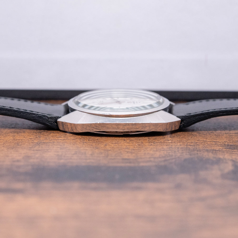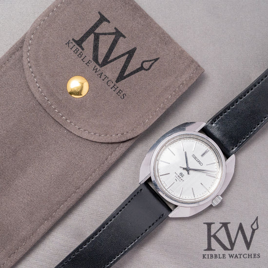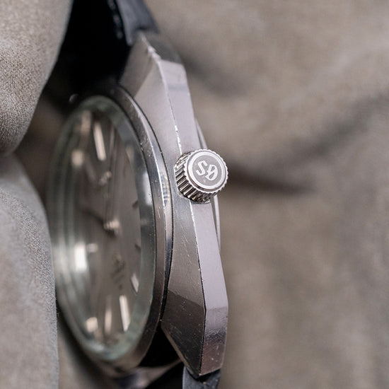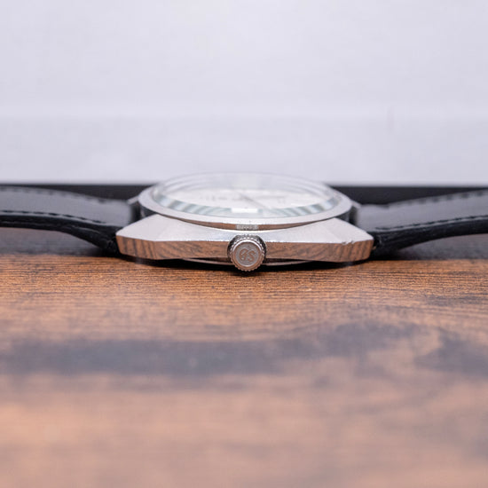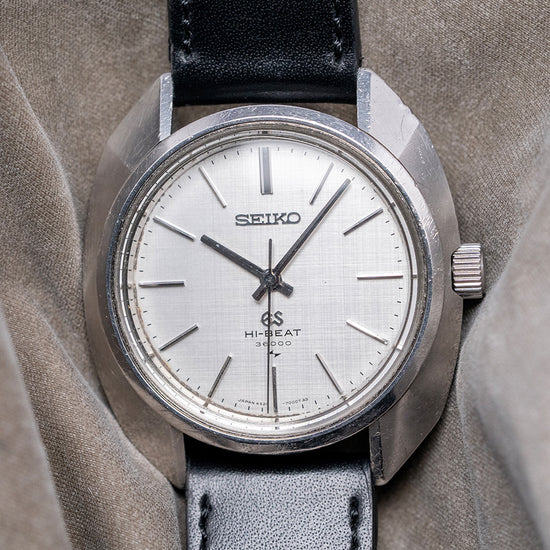Here we have a rare classic 1969 Grand Seiko Hi-Beat Linen Dial Manual 4520-7000. Designed and manufactured at the Daini Seikosha factory from 1968 until 1973. Featuring the distinctive ‘Grammar of Design’ 37mm stainless steel 45GS case, exquisitely polished and radially brushed angled surfaces curve over your wrist toward the thick lugs, its polished curved flanks lead to a lug-to-lug of 4mm and a case thickness of 9mm, giving the watch an impressive wrist presence. On the right side, a recessed, signed, deep knurled crown. The polished, smooth bezel holds a Hardlex crystal above a beautiful white Linen dial. An outer minute track surrounds applied steel baton indexes marking the hours. Polished steel hands are complemented by a tapered sweeping second hand. At noon, we have the applied Seiko motif, and at 6 o’clock, ‘GS Hi-Beat 36000’ completes this incredible dress watch. On the reverse, a screw-down solid case back is engraved with the details of the watch and the Grand Seiko gold medallion in the centre. Inside the legendary manually wound Grand Seiko Cal. 4520, 25 jewels, hi-beat at 36,000 beats per hour. It comes paired with a well-suited 18mm aftermarket strap and pin buckle.