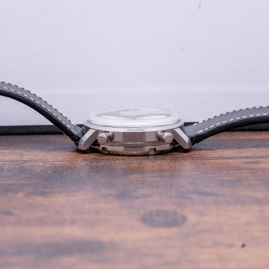 Here, we have a 1969 Hamilton Chrono-Matic Automatic Cal. 11 11002-3 with a 37mm stainless steel case that sits comfortably on your wrist thanks to angled flat-ended lugs, and a lug-to-lug length of 40.5mm and a case thickness of 13.5mm ensure a comfortable fit. We have the piston chronograph pushers on the right side and, on the left, a signed crown with deep knurling for grip. A fine bezel holds a domed crystal above a panda bicompax dial. A black outer Tachymeter chapter ring surrounds a minute track precisely executed with baton indexes and tritium pips marking the hours; at 3 o’clock, a black 30-minute register with white numerals and hand; at 6 o’clock, a framed date window; and finally, at 9 o’clock, a black 12-hour register with white numerals and white hand, slender steel baton hands tipped in Tritium is complemented by a tapered chronograph hand, at 12 o’clock we have the Hamilton motif “Automatic printed underneath and at 6 o’clock “chrono-matic” completes this vintage bicompax chronograph. On the reverse, a solid case back inside is an automatic Hamilton Cal. 11, 17 jewels, beating at 19,800 beats per hour, developed by a consortium of four manufacturers, Heuer, Dubois Dépraz, Breitling and Hamilton-Büren, under the name “Project 99” to create the world's first automatic chronograph with a patent for the chrono-matic filed in 1967 and released by the three brands at the 1969 BaselWorld Fair. The watch comes paired with a well-suited 19mm aftermarket leather strap and pin buckle.