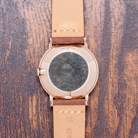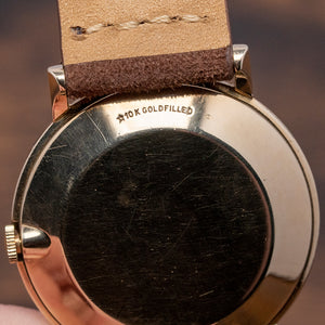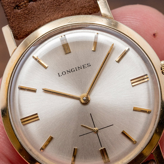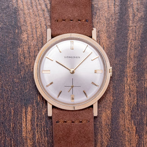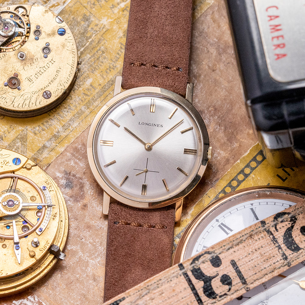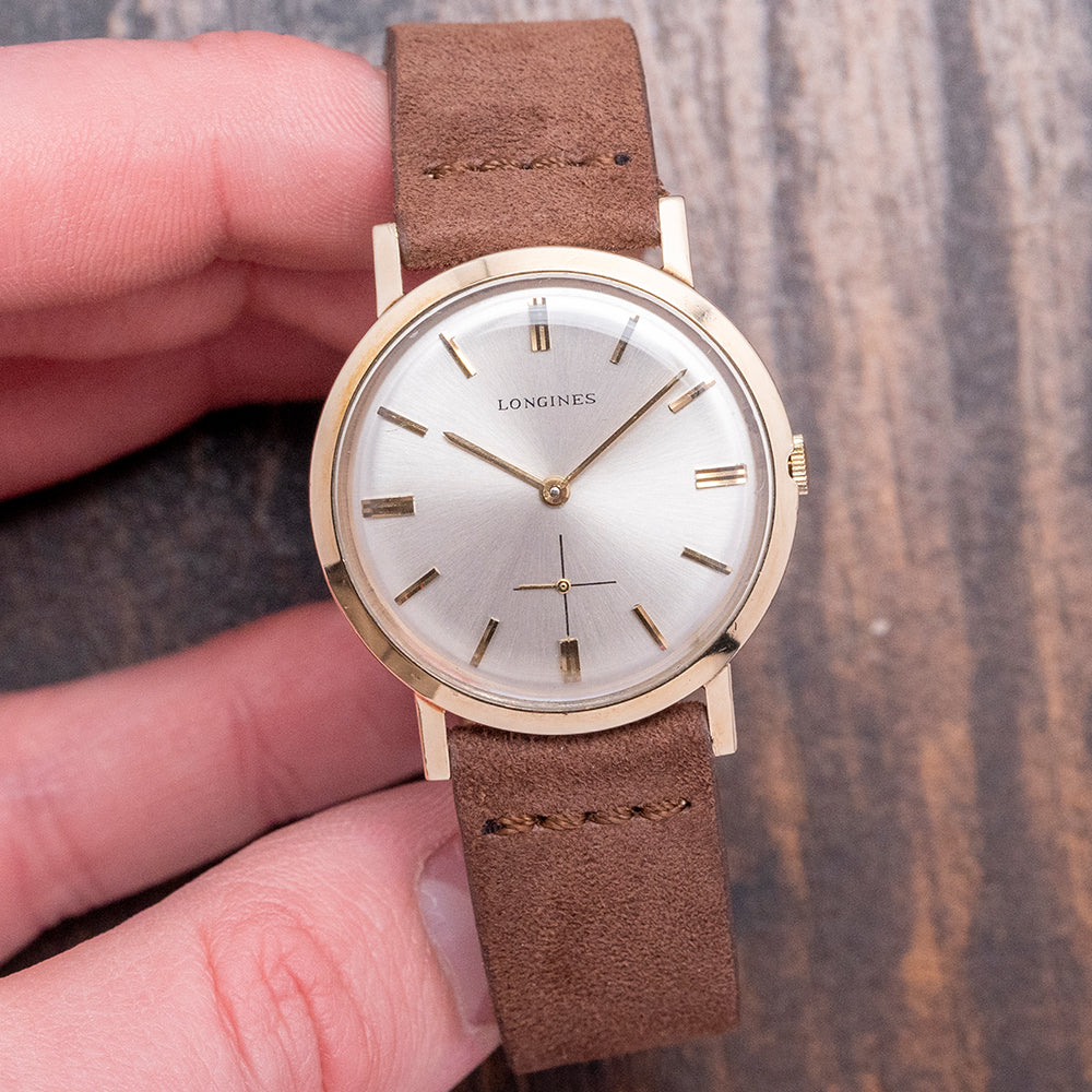 Here we have a 1969 Longines Dress Watch Cal. 370, which has an immaculate 33mm 10K Gold-Filled case with curvaceous sides leading to straight angled lugs. Its 38mm lug-to-lug and 8mm case thickness ensure a comfortable fit on the wrist. The slightly recessed crown is large enough to make adjustment a breeze. A smooth bezel holds a domed crystal. Its sunburst silver dial has applied gold-toned baton indexes with bevelled edges, creating a sophisticated look. Gold-toned stick hands with sub-seconds at 6 o’clock complete the sophisticated dial. On the reverse, a solid 10k gold-filled snap-off case back, inside an manually wound Longines Cal. 370, 17 jewels, 19,800 beats per hour. It comes paired with an 18mm aftermarket suede strap and pin buckle.