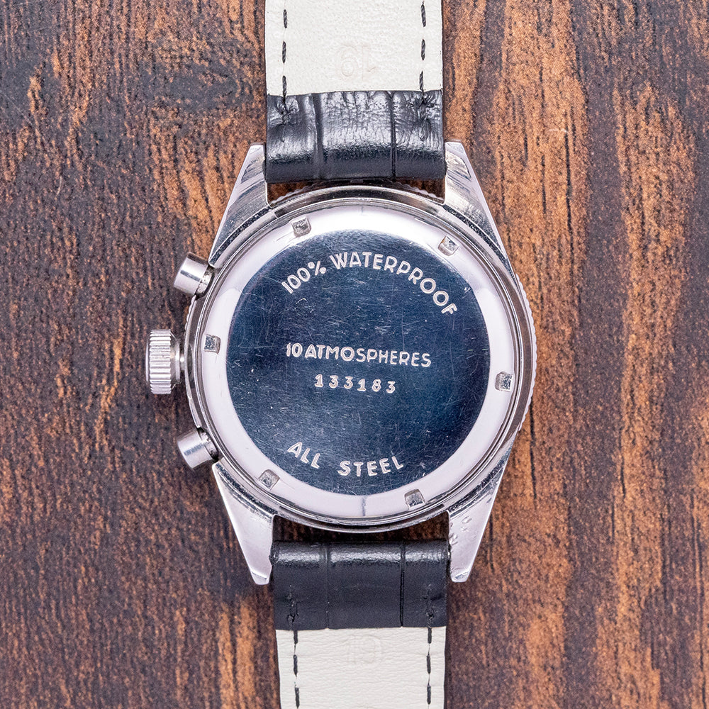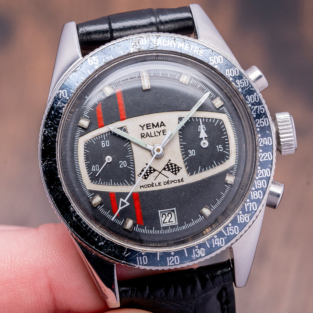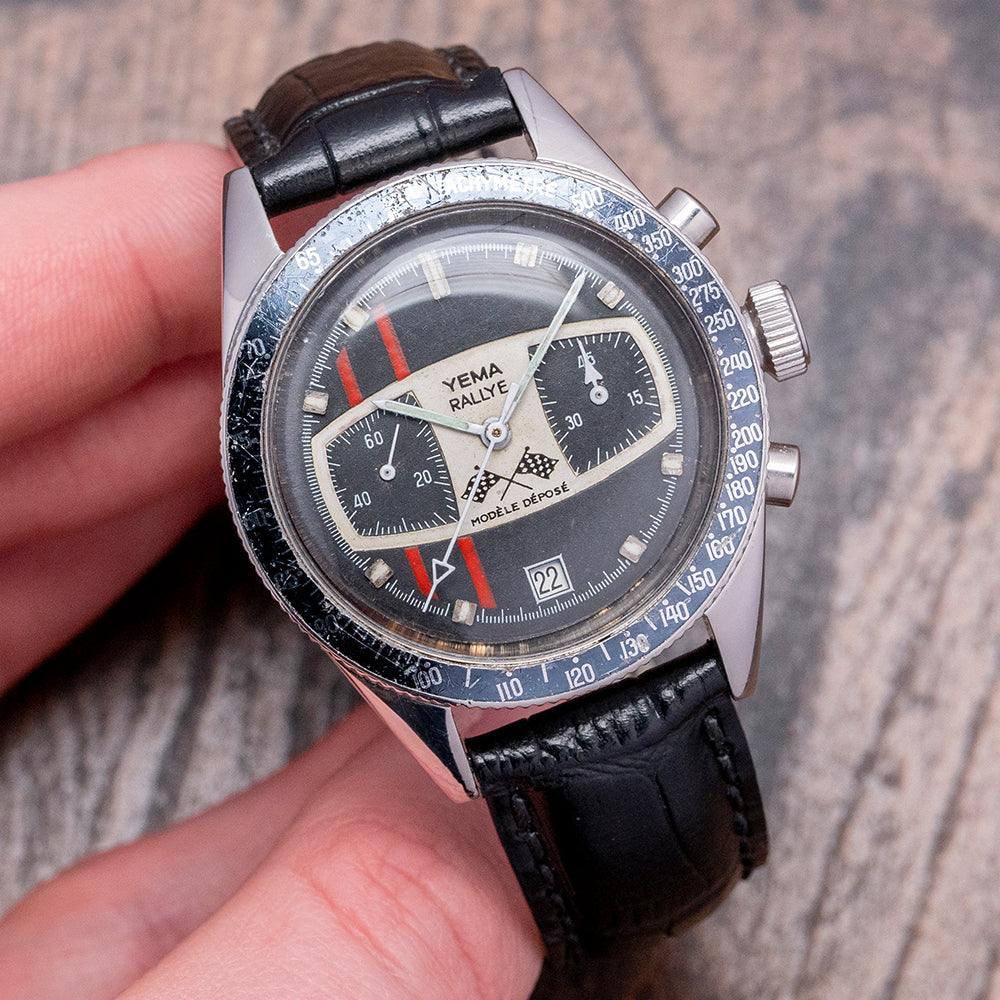 Here we have a 1969 YEMA Rallye “Mario Andretti” Chronograph, he wore this reference at the Indianapolis 500 race where he won after 5 attempts in 1969. The 38.5mm stainless steel case has a distinctive curve towards the thick tapered lugs with a lug-to-lug length of 48mm and a case thickness of 13.5mm ensuring a comfortable fit on your wrist. Down the right side, we have the chronograph piston pushers and a large crown in the centre. The stainless steel bezel has a Tachymeter scale insert that has faded over time. A domed crystal sits above a black dial with two off-set red vertical lines, an outer minute track is precisely executed with applied block and baton indexes infilled with luminance to mark the hours, and at 6 o’clock a framed date window, within a dashboard shape we have a 45-minute register and at 9 o’clock a continuous seconds register. “Yema Rallye”, two chequered flags and “Modele Depose” complete this racing-inspired bicompax chronograph. On the reverse a screw-down case back, inside a manually wound Valjoux 7734, 17 jewels, 18,000 beats per hour, a true workhorse of a chronograph produced in Switzerland until 1974, the top pusher activates Start/Stop, and the bottom pusher Resets. The watch comes fitted on a 19mm leather strap.