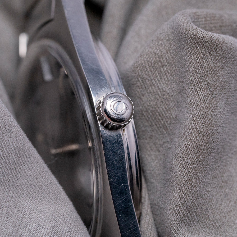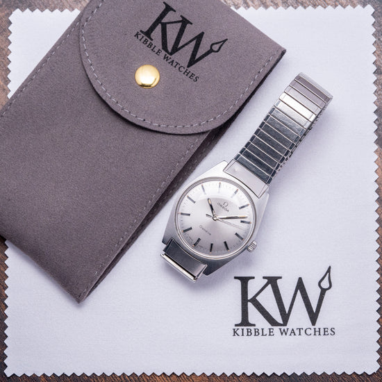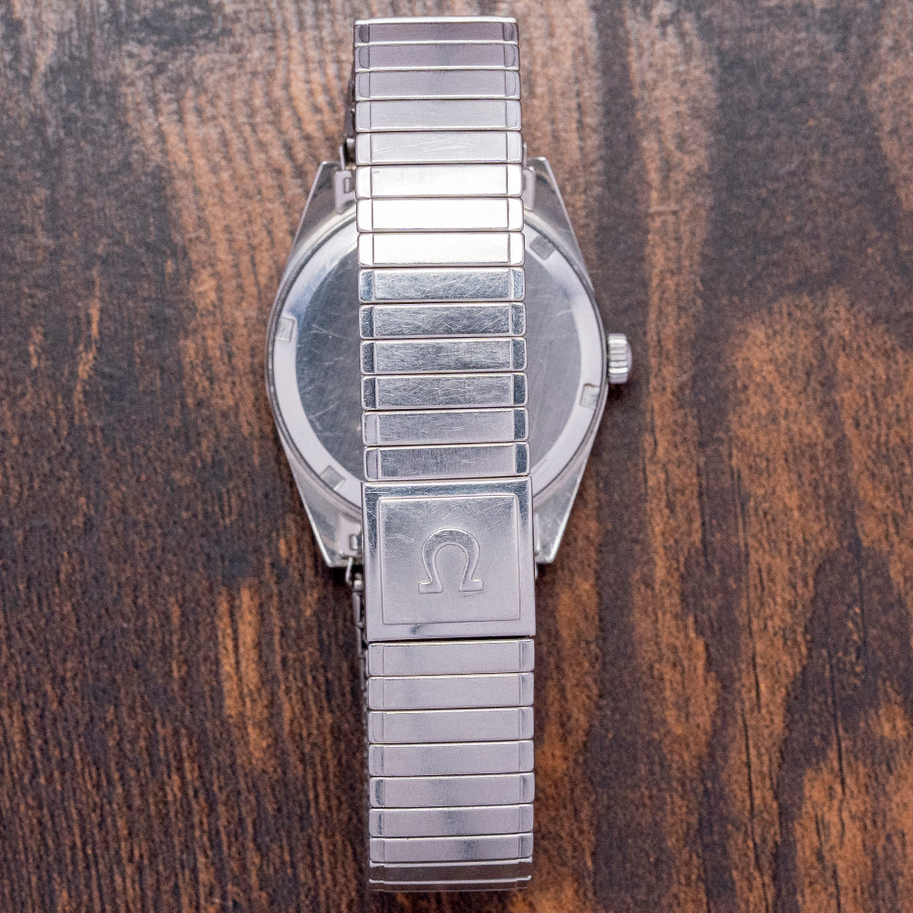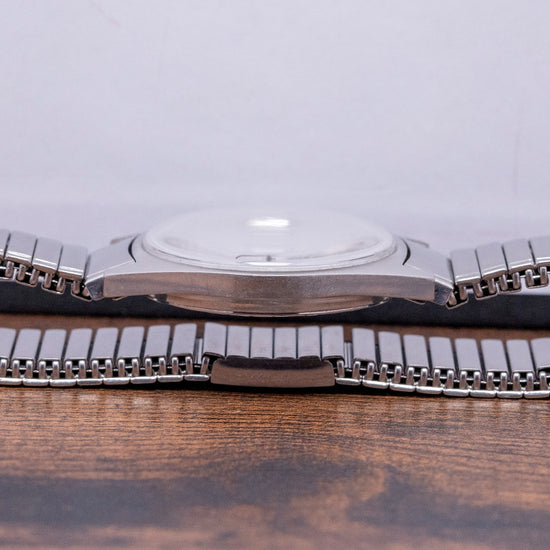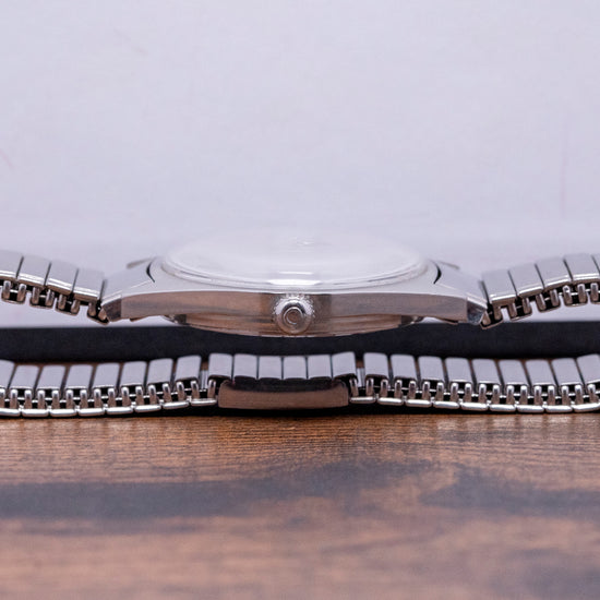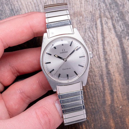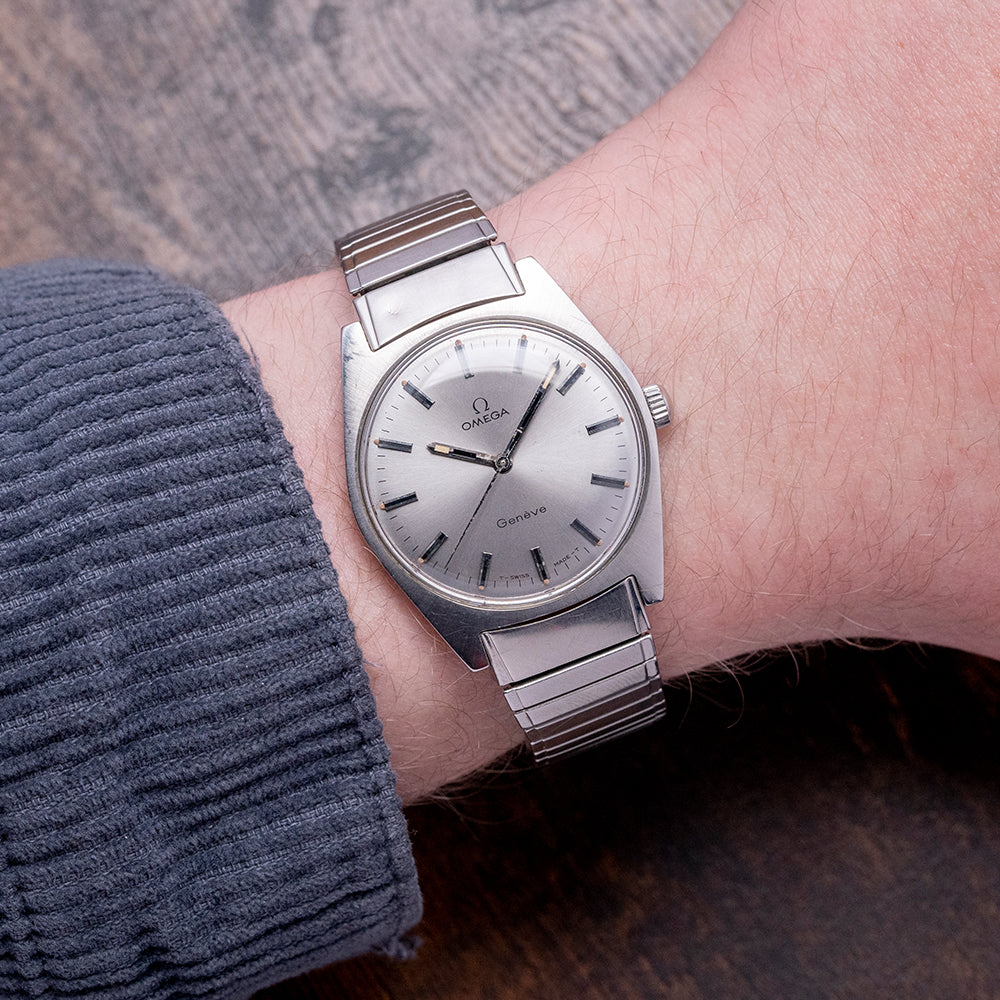 Here we have a 1970 Omega Geneve Manual on a rare Omega Fixo Bracelet 135.041 with a 34.5mm tonneau stainless steel case. The case flows over your wrist with a lug-to-lug length of 40.5mm and a case thickness of 9.5mm, ensuring a comfortable fit on your wrist. On the right side is a signed coin-edged crown. A domed crystal sits above a sunburst silver dial. Applied steel baton indexes with black painted centres mark the hours. Slender sword hands have luminance tips complemented by a tapered second hand. At 12 o’clock, we have an Omega motif, and at 6 o’clock, “Geneve” completes this attractive timepiece. On the reverse, a screw-down case back. Inside a manually wound Omega Cal. 601, 17 jewels, 19,800 beats per hour. It comes paired with a rare uncut 19mm Omega Fixoflex sprung bracelet, ref:1122, which will fit up to a 7.4-inch wrist.