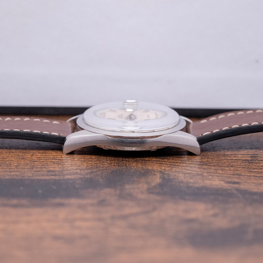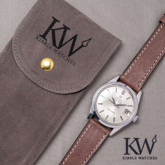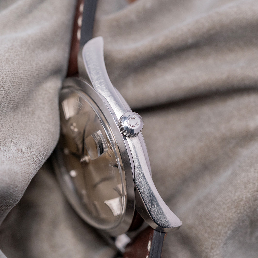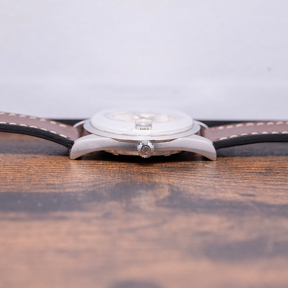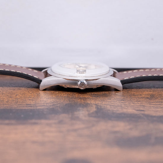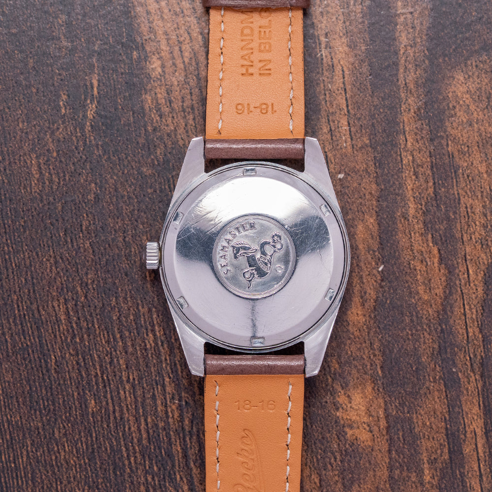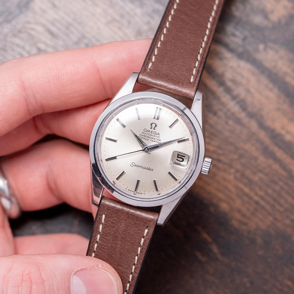 Here we have a 1970 Omega Seamaster 'Chronometer' Automatic 168.024 featuring a curvaceous 35mm brushed and polished stainless steel case. Its curved brushed flanks lead to a lug-to-lug length of 43.5mm with gently curved tapered thick chamfered lugs, and a case thickness of 11mm ensures a comfortable fit on your wrist. On the right side is a signed push/pull crown. A smooth, polished bezel holds the domed crystal above a stunning sunburst silver dial with an outer minute track and chamfered applied chamfered baton indexes marking the hours. At 3 o’clock, a framed date window with a Cyclops magnification and steel sword hands, with onyx filling, complemented by a tapered centre second hand, completes the attractive dial. Text is precisely printed at noon with an applied Omega motif ‘Automatic Chronometer Officially Certified’ and at 6 o’clock, ‘Seamaster’. On the screw-down case back, we have the embossed hippocampus and a seahorse, which represent Neptune, the god of the sea. It was conceived by Pierre Borie after seeing a picture of Neptune riding a chariot pulled by seahorses. It is the reason why the seahorses are wearing a bridle and were first seen on the Seamaster in 1958. Inside an automatic Omega Cal. 564, 24 jewels, beating at 19,800 beats per hour. The watch comes paired with its well-suited aftermarket 19mm leather strap and pin buckle.