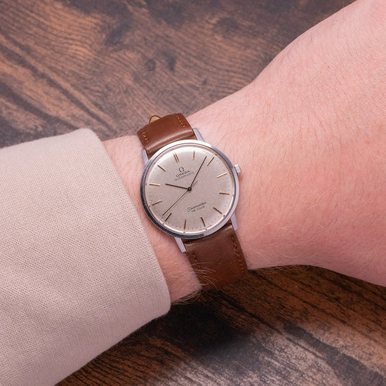 This watch is sold with its original Omega presentation box (the hinges are broken on the box, very common for this age) and paperwork including the original receipt, insurance certificate and service receipt from 1972. The watch comes paired with a nice-fitting 18mm leather strap. The watch is from August 1970 and is sold in worn vintage condition, but is in overall fair vintage condition with an even patina across the dial, as you can see from the photographs. The watch comes with our 12-Months NON-Waterproof Warranty.