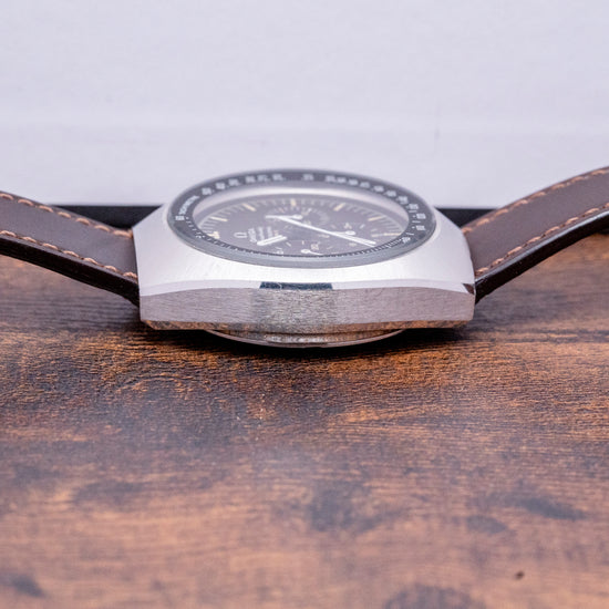 It was 1969, and we had just had one of man's finest achievements: stepping on the moon. Omega felt they needed to design a watch that encapsulated the future, showcasing their commitment to a modernist innovative design; step forward to our 1970 Omega Speedmaster Professional Mark II 145.014 with a 41.5mm tonneau-shaped case, its lines between polished and brushed transition seamlessly, the sides have polished chamfered edges with a brushed centre and radially brushed top surface, making the case a much more dynamic case than you normally find on a Speedmaster. A lug-to-lug length of 45mm and a case thickness of 14mm give the watch an impressive wrist presence. Down the right side, we have pushers and a signed crown that are flusher with the case than on other models. The flowing lines continue as the case encircles the flat crystal without a bezel above the attractive matte Tropical brown dial. The stunning Tropical dial is created by a reaction of the dial to long-term exposure to the sun's UV rays, which is an organic patina, making each watch dial unique and, therefore, collectable. A raised outer Tachymetre chapter ring sits above the white second's track with baton indexes marking the hours coated in Tritium, at 3 o’clock a 30-minute register, at 6 o’clock 12-hour register and finally, a running 60 seconds register at 9 o’clock, each register is slightly recessed creating depth and interest to the dial. Slim white baton hands with Tritium infill complete with a tapered chronograph seconds hand. On the reverse, we have a screw-down case back with an engraved Hippocampus in its centre, a seahorse that represents Neptune, the God of the sea; it was conceived by Pierre Borie after seeing a picture of Neptune riding a chariot pulled by seahorses; it is the reason why the seahorses are wearing a bridle. Inside a manually wound Omega Cal. 861, 17 jewels were based on the Lemania 1873, and it was the direct Calibre replacement to the 361 Omega used on the moon. The watch comes paired with its 20mm aftermarket leather strap and pin buckle.