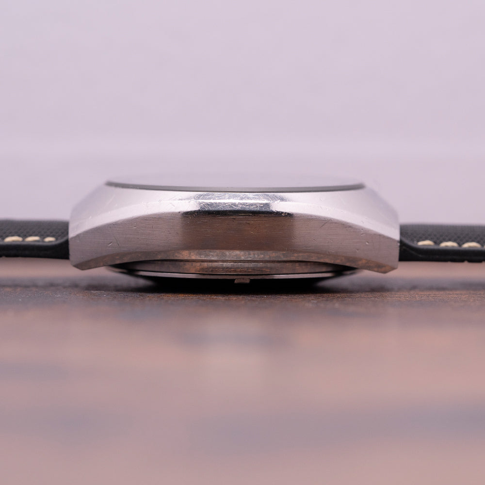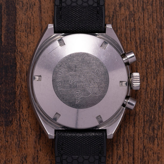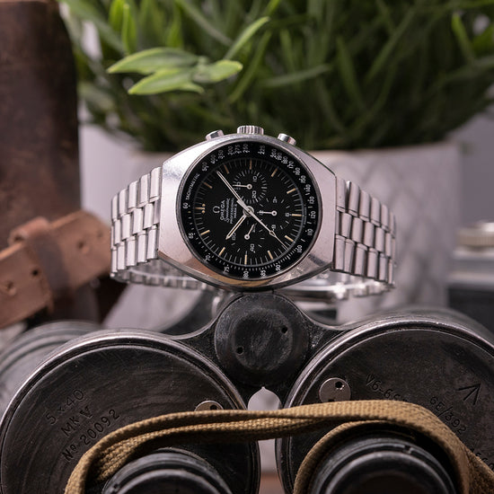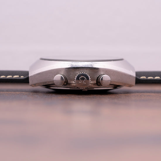 It was 1969 we had just had one of man's finest achievements with stepping on the moon, Omega felt they needed to design a watch that encapsulates the future, showcasing their commitment to a modernist innovative design, step forward to our 1970 Omega Speedmaster Professional Mark II 145.014 with a 41.5mm tonneau-shaped case, its lines between polished and brushed seamlessly transition, the sides have polished chamfered edges with a brushed centre and radially brushed top surface, making the case a much more dynamic case than you normally find on a Speedmaster. A lug-to-lug length of 45mm and a case thickness of 14mm give the watch an impressive wrist presence, down the right side, we have pushers and a signed crown, more flush with the case than on other models. The flowing lines continue as the case encircles the flat crystal without the need for a bezel, the matte black dial has a raised outer Tachymetre above the white second's track with baton indexes marking the hours coated in Tritium, at 3 o’clock a 30-minute register, at 6 o’clock 12-hour register and finally, a running 60 seconds register at 9 o’clock, each register is slightly recessed creating depth and interest to the dial. Slim white baton hands with Tritium infill complete with an arrow point chronograph seconds hand. On the reverse, we have a screw-down case back with an engraved Hippocampus in its centre, a seahorse that represents Neptune the God of the sea, it was conceived by Pierre Borie after seeing a picture of Neptune riding a chariot pulled by seahorses, it is the reason why the seahorses are wearing a bridle. Inside a manually wound Omega Cal. 861, 17 jewels based on the Lemania 1873 and is the direct Calibre replacement to the 361 Omega used on the moon. The watch comes paired with its 20mm original Omega bracelet with a signed folding clasp, the bracelet is full-sized and has never been sized, and the clasp spring bars are still sealed, an additional strap is provided.