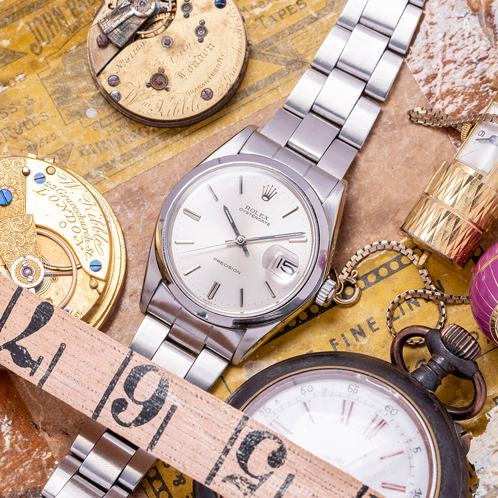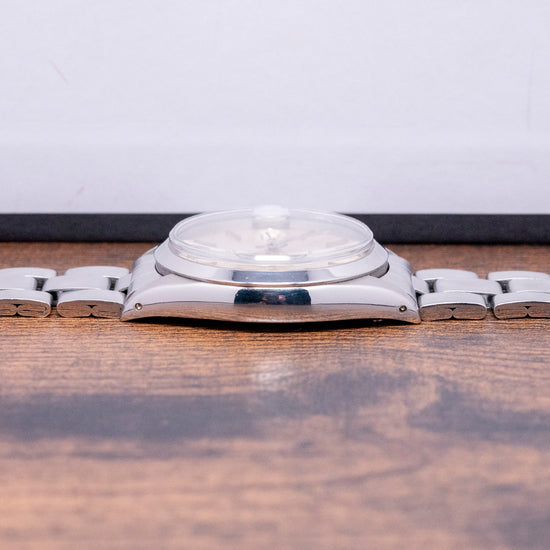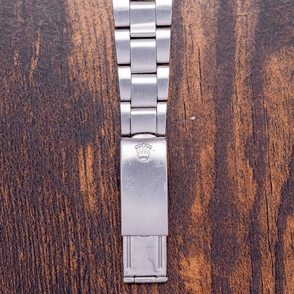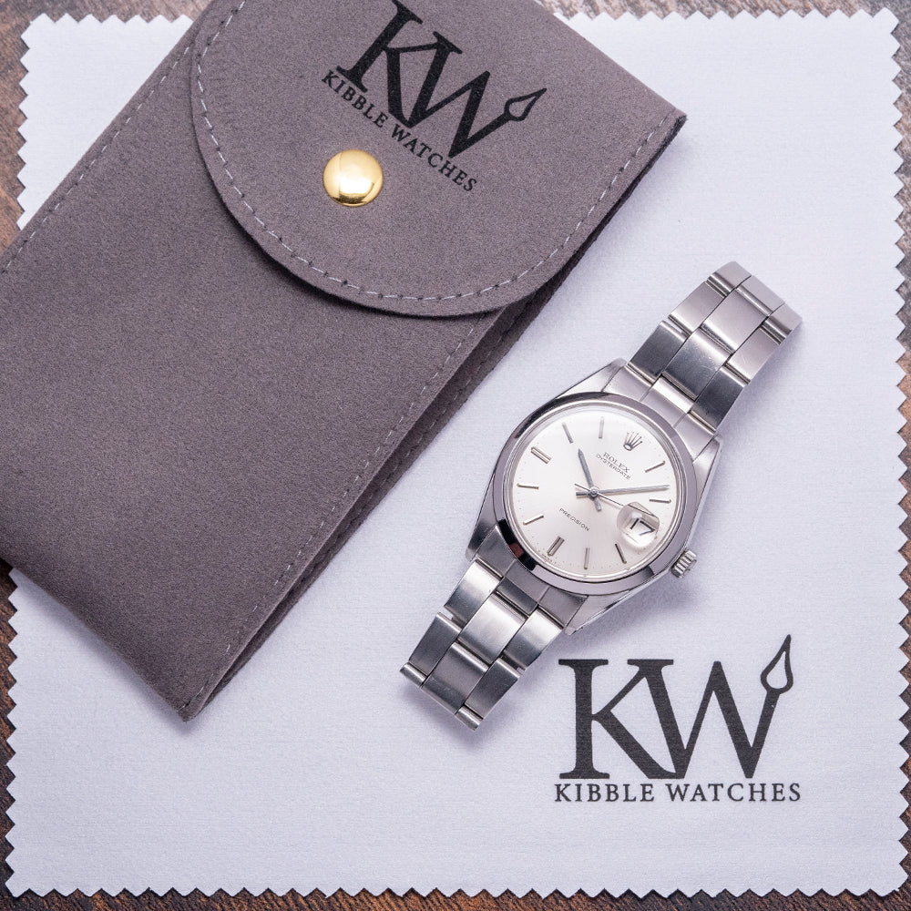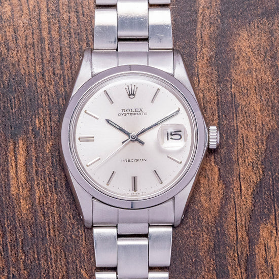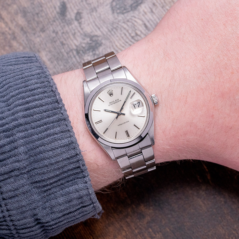 Here we have a 1970 Rolex Oysterdate Precision on Bracelet 6694 with a 34.5mm stainless steel Oyster case, the slender case has a subtle curve towards the satin-finished drilled lugs with a lug-to-lug length of 41.5mm and a thickness of 10mm ensuring a comfortable fit on your wrist, the case profile has polished and brushed surfaces. On the right side, is a signed screw-down crown. The polished chamfered smooth bezel holds a domed acrylic crystal above a sunburst silver dial, an outer minute track with Tritium lume pips and applied bevel-edged baton indexes mark the hours. At 3 o’clock, there is a date window with cyclops magnification on the crystal. Slender sword hands infilled with Tritium are complemented by a tapered centre second hand, text is precisely printed with “Rolex OysterDate” underneath the applied Rolex crown, at 6 o’clock you find printed “Precision”. On the reverse, a coin-edged screw-down case back, inside a manually wound Rolex Cal. 1225, 17 jewels, 21,600 beats per hour. It comes paired with its original 19mm folded link Rolex Oyster stainless steel bracelet that will fit up to a 7.3-inch wrist.