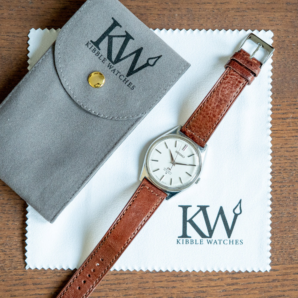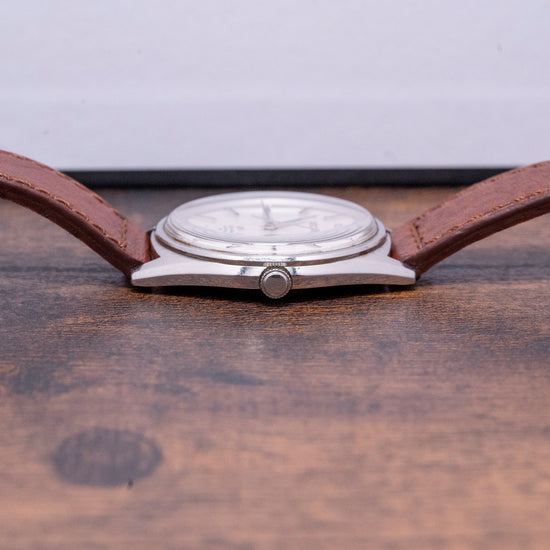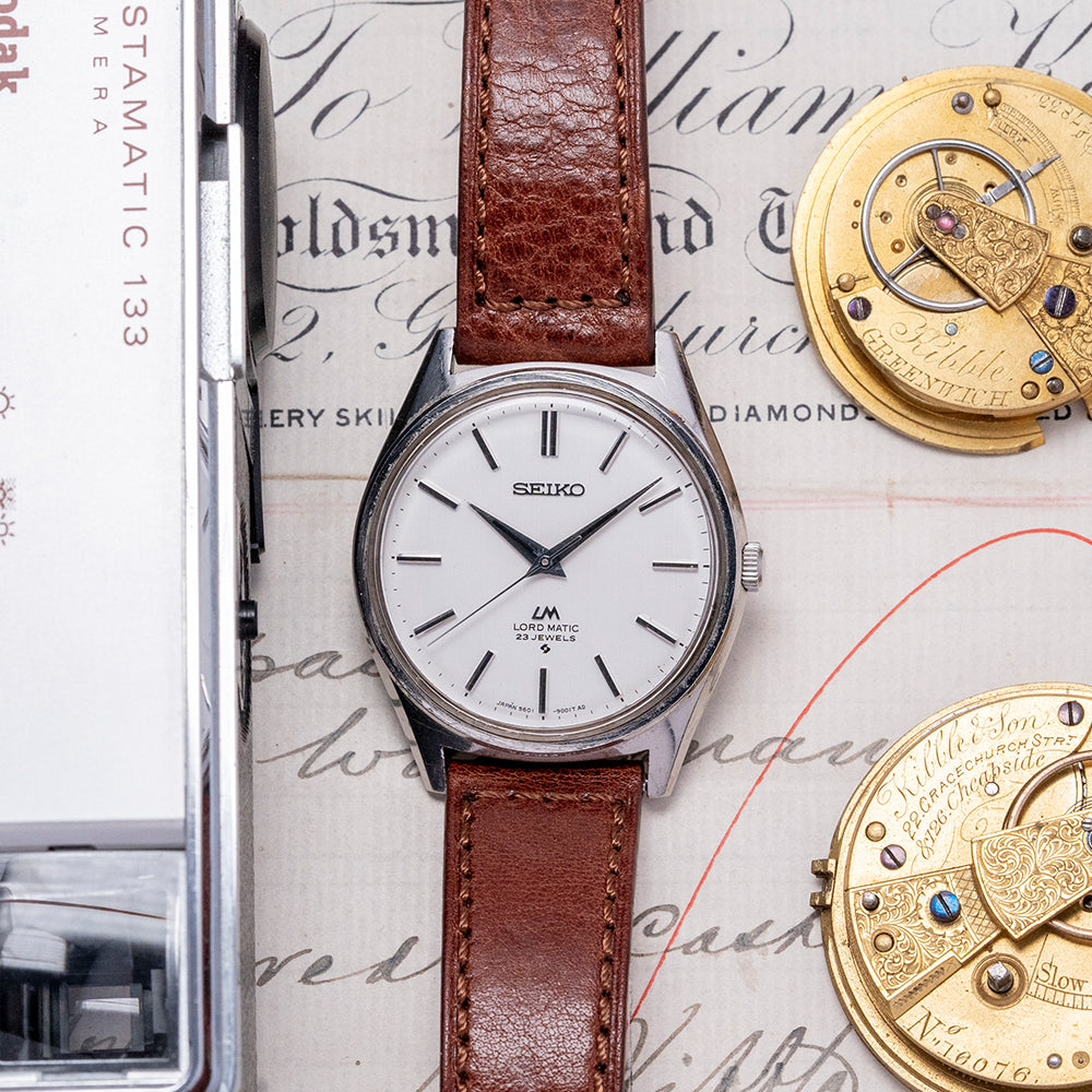 Here we have a 1970 Lord Matic 5601-9000 that has a 36mm unpolished case with beveled lugs and crisp lines, the case is a monocoque design cast from a single block of steel, this means to access the movement you have to pop the crystal from the front with a special tool. Seiko introduced the Lordmatic in 1968 from their Suwa Seikosha and Daini factories, the Suwa factory used the 5601A, 5605A, 5606A, and 5619A movements from 1968 to 1974. The movements had either 23 or 25 jewels, 21,600 BPH. The Daini Factory made use of the 5106 movement which was in production from 1967 to 1970 and was used in the Seikomatic-p. It had 33 jewels at 19,800 BPH. The 5146 was used in the Presmatic and had 27 or 30 jewels and was a 28,800 BPH movement. In the Daini Factories, the 52xx movements replaced the 51xx movements. The 5206 movement was in production from 1970-1976. They were either 23 or 25 jewels, 28,800 BPH, and were used in their King Seiko line. The factory rivalry took Seiko from just a Japanese watch manufacturer to the very cutting edge of horological innovation, competing with, and often beating, the best the Swiss could offer. A beveled bezel encircles the domed acrylic crystal that protects a white dial with a subtle vertical line pattern, slim applied baton indexes for the hour markers, and elegant Dauphine hands with chamfered edges. On the case back we have an inscription that says “20th Anniversary-Completed Construction of New Factory- To Commemorate”, inside we have an automatic Seiko Cal. 5601, 23 jewels, 21600 beats per Hour, and the watch comes paired with a brown leather 18mm strap.