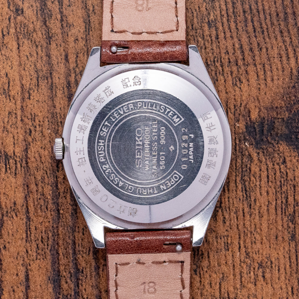 This wonderfully affordable Seiko Lordmatic automatic 36mm reference 5601-9000 features a subtle textured dial that really plays with the light, the caseback also features a commemorative engraving which only adds to the intrigue!