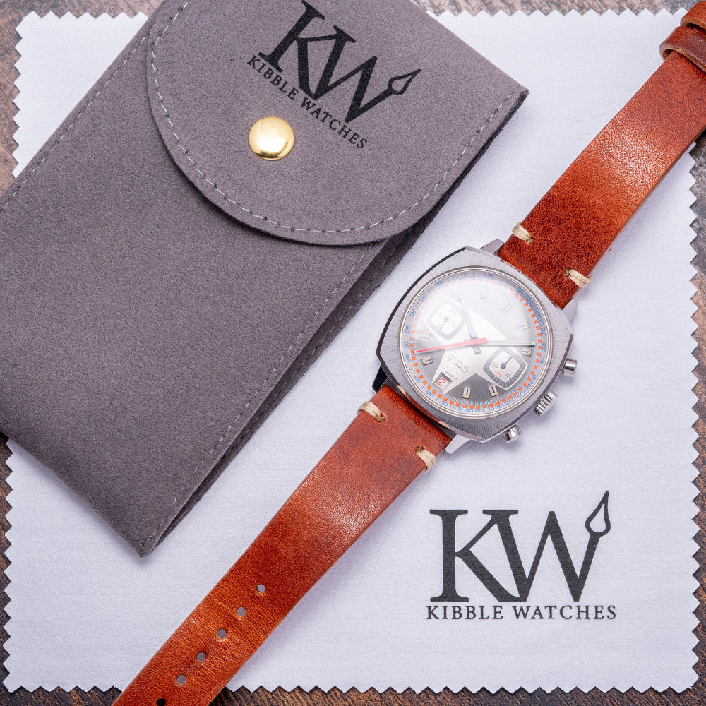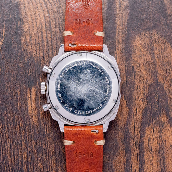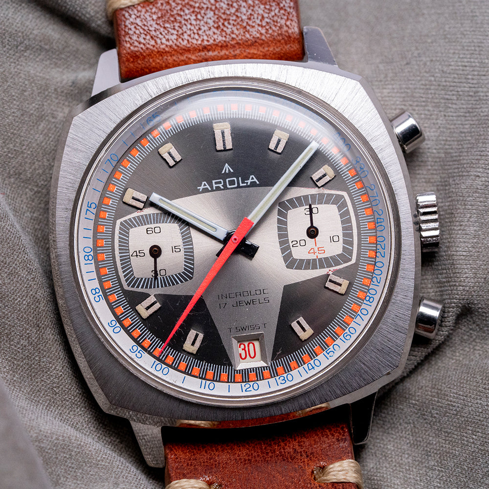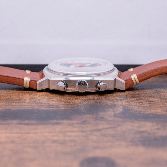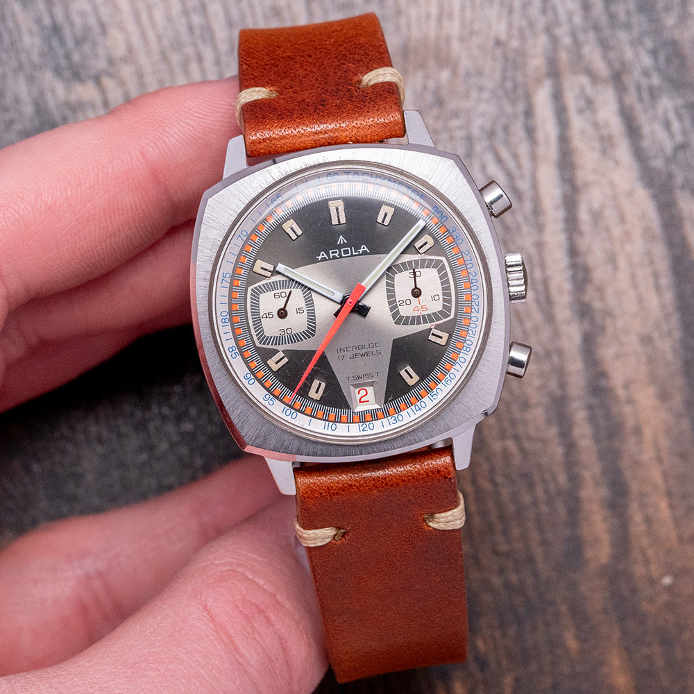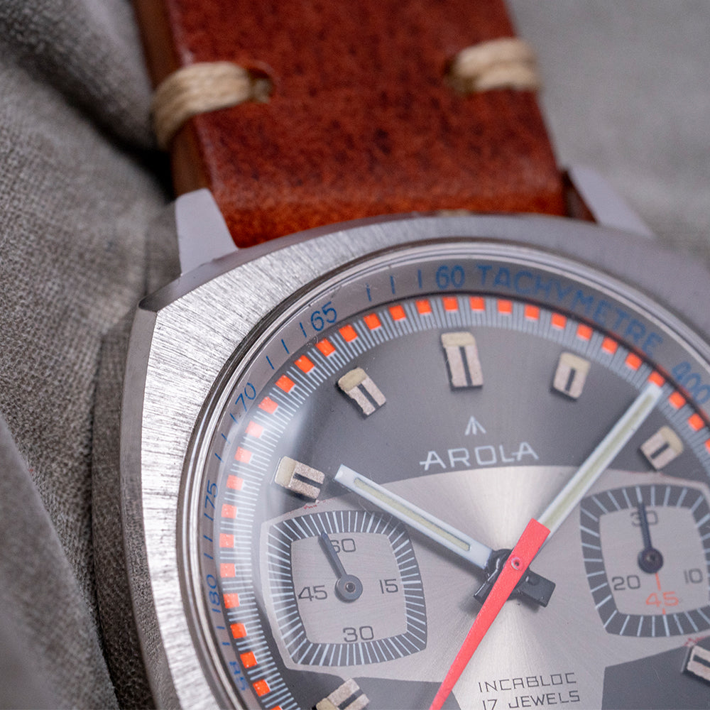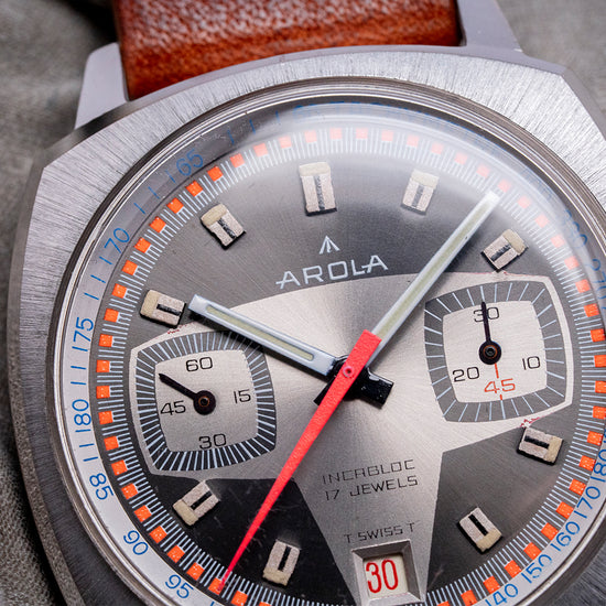 Here we have a 1970s Arola 'Camaro' Chronograph Valjoux 7734. It's 37mm polished and brushed chrome-plated cushion-shaped case curves over your wrist thanks to the straight-angled lugs. Heuer, BWC, Glycine, and many others used this sporty case aesthetic during the same time period. The curved flanks lead to a comfortable lug-to-lug length of 43mm and a case thickness of 12mm. Down the right side, we have the chronograph pushers and a coin-edged crown in the centre. A radially brushed top surface encircles a domed crystal sitting above a sunburst two-tone black and silver dial. An outer blue Tachymeter scale chapter ring surrounds a precisely executed red accent minute track, applied block indexes tipped with Tritium mark the hours; at 3 o’clock, a 30-minute register; at 6 o’clock, a framed date window; and at 9 o’clock, a small seconds register, at 12 o’clock we have the Arola motif and at 6 o’clock “Incabloc 17 Jewels T Swiss T” completes this sports chronograph, the way the dial design is configured reminds us of a racing car dashboard. White baton hands filled with Tritium are complemented by a red tapered chronograph hand. On the reverse, a stainless steel solid case back, inside a manually wound Valjoux Cal. 7734, 17 jewels, beating at a leisurely 18,000 beats per hour. It comes paired with a well-suited Watch Gecko 19mm leather strap and pin buckle.