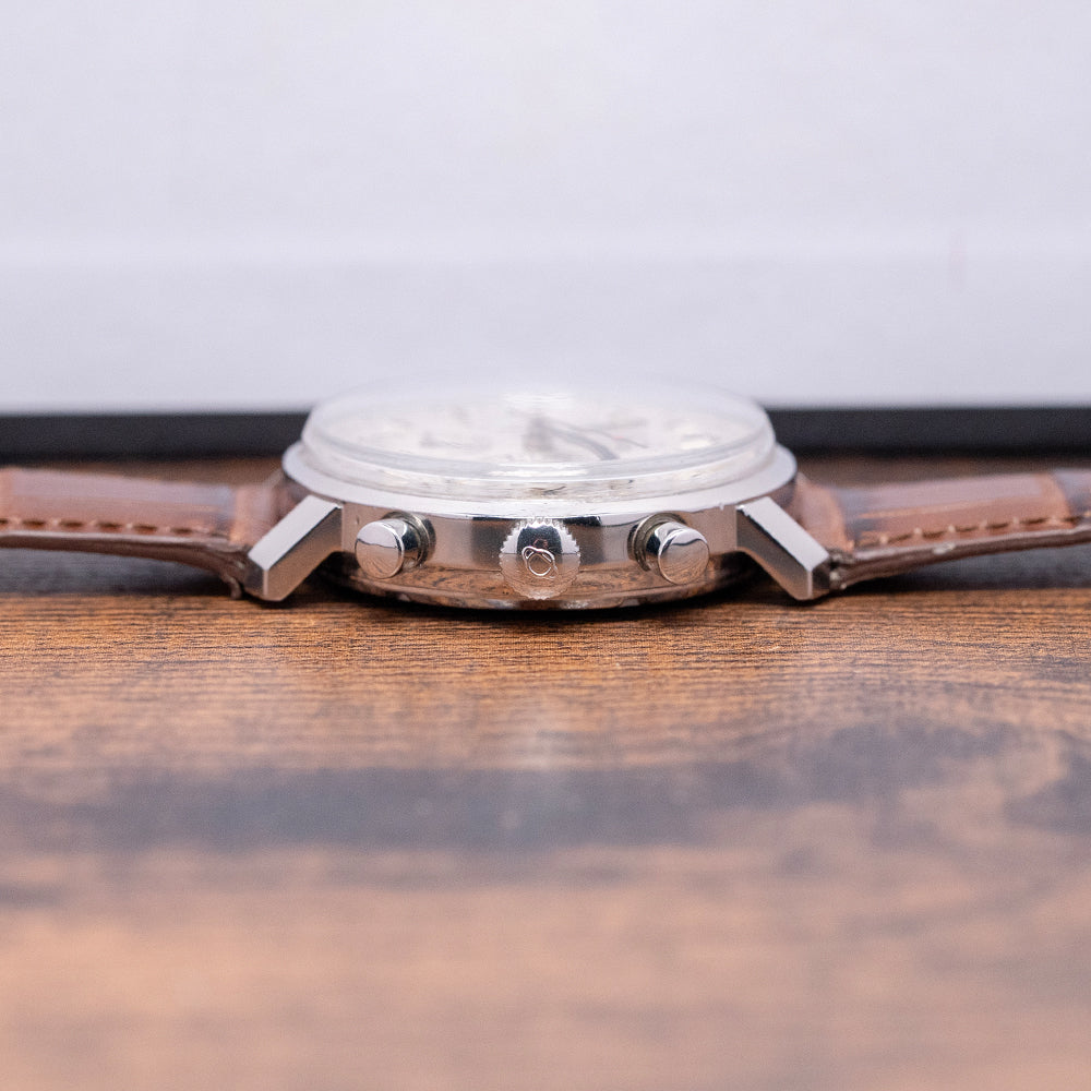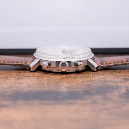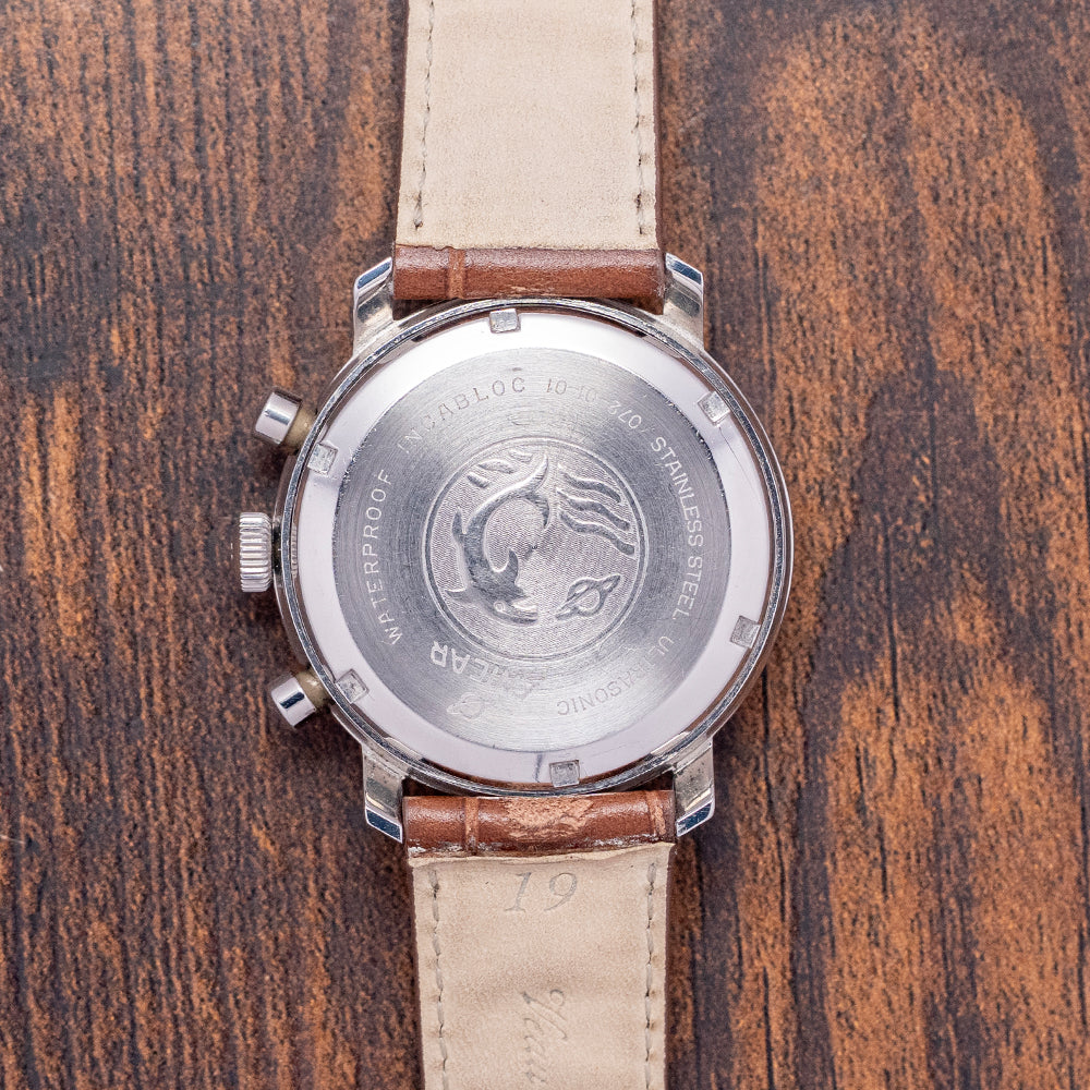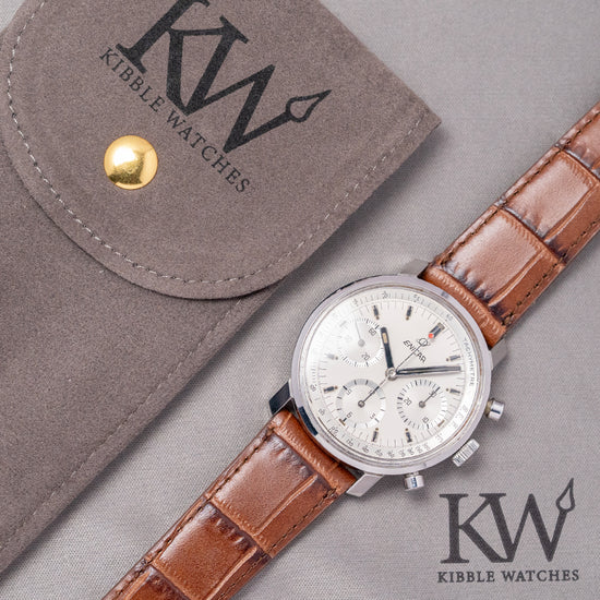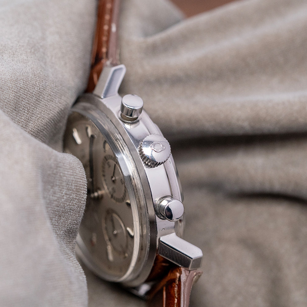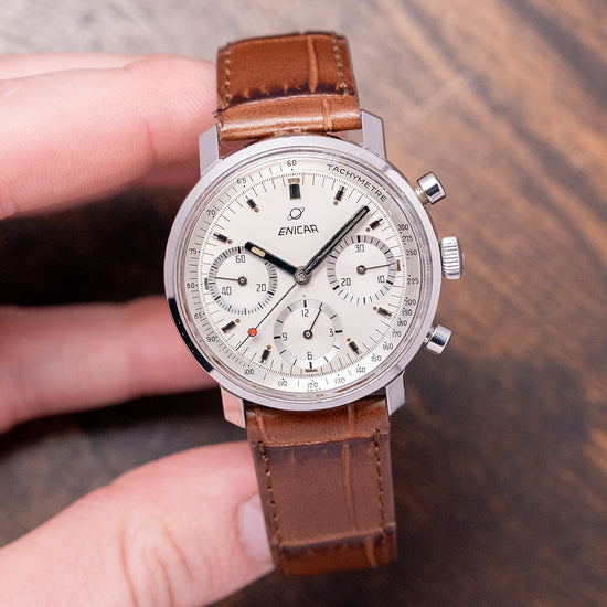Here we have a 1970s Enicar 'Garnix' Chronograph Silver Dial Valjoux 72, the collector's nickname Garnix is German for ‘Nothing’, with reference to its minimalist design and lack of model name on the dial. Featuring a 36.5mm round stainless steel case that sits comfortably on your wrist, thanks to the sharp-angled flat-ended lugs. Its curved, chamfered flanks lead to a lug-to-lug length of 41mm and a case thickness of 12mm. On the right side, we have the piston pushers and a signed coin-edged crown in the centre. The stepped smooth bezel holds a box-shaped crystal above a striking silver tricompax dial. A Tachymeter scale surrounds a precisely executed minute track above applied baton indexes and lume pips marking the hours. The chronograph consists of a 30-minute, a 12-hour and finally a running seconds, each sitting recessed with a concentric circular pattern and a stick hand. Slender baton hands are filled with lume and complemented by a red lollipop chronograph hand. At noon, we have the Enicar Saturn motif completing this distinctive minimalist vintage chronograph. On the reverse, a screw-down solid case back is engraved with the details of the watch and a round wave pattern, shark and Saturn in the centre. Inside a manually wound Valjoux 72, 17 jewels, 18,000 beats per hour. First introduced in 1938, this column wheel movement was made more robust than the earlier Valjoux 22. It comes paired with a well-suited 19mm strap and pin buckle.