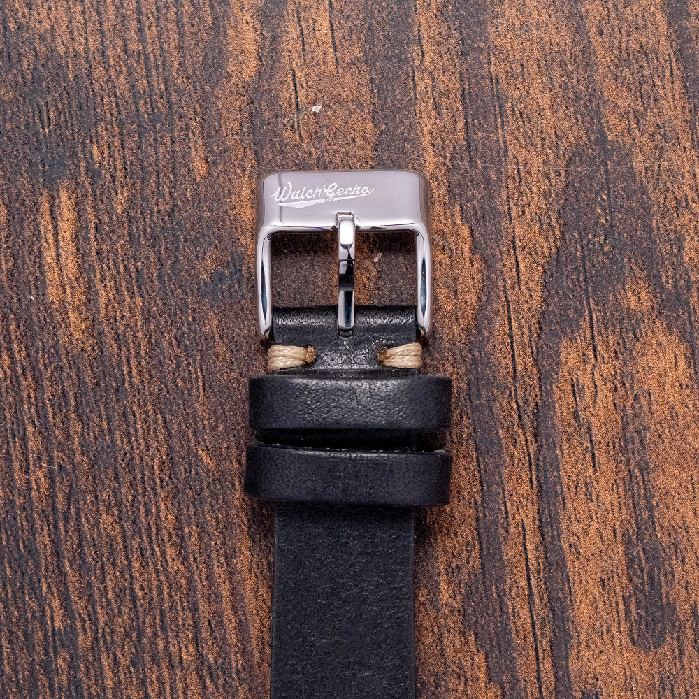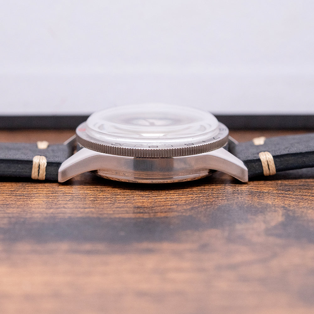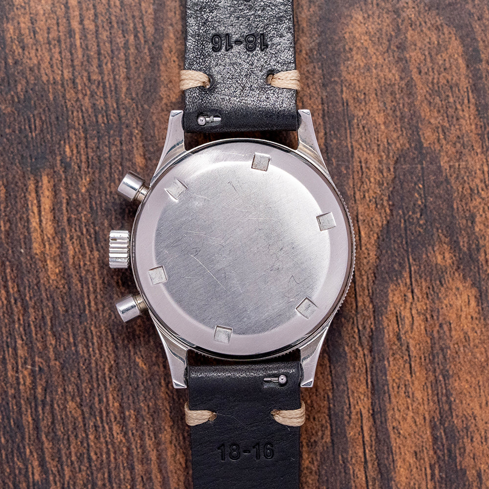 Here is a rare classic 1970s Gallet Flying Officer with a Black Dial. The Flying Officer was created in 1938 for the United States Army Air Corps and remained in production until the 1970s. It was worn by Harry S. Truman, who served as a Senator from Missouri, was a Reserve Field Artillery Officer, and later became the 33rd President of the United States. Featuring a polished 36mm stainless steel case that curves over your wrist with finely tapered flat-ended lugs. Its curved flanks lead to a lug-to-lug length of 44.5mm and a case thickness of 13.5mm, ensuring a comfortable fit. Down the right side, there are piston pushers and a large, deep knurled crown in the centre. The bidirectional stainless steel bezel features a coin-edge and an engraved 12-hour scale with a red ‘12’ and black painted numerals. A high-domed crystal sits above a dynamic matte black dial. World Time Cities in alternating red and white surround a white 60-minute track, precisely executed above Tritium-coated Arabic numerals marking the hours. At 3 o’clock, a white 30-minute register and at 9 o’clock, a white running seconds register. Elegant Alpha hands filled with Tritium are complemented by a tapered chronograph hand. At noon, we have the Gallet motif, and at 6 o’clock, ‘Flying Officer’ completes this stunning traveller's chronograph. On the reverse, a screw-down case back and inside a cam switching manually wound Landeron Cal. 149, 17 jewels, beating at a leisurely 18,000 beats per hour. It comes paired with a well-suited 18mm vintage-style strap and pin buckle.