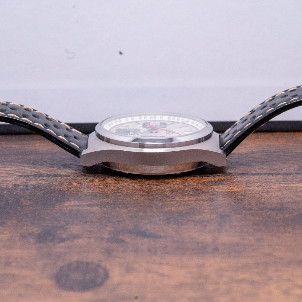 Here we have a 1970s Heuer Chronograph Incabloc 1611 Valjoux 7765 with a 38mm tonneau-shaped brushed stainless steel case that curves over your wrist with flat-ended lugs, and a lug-to-lug length of 44mm and a case thickness of 12.5mm ensures a comfortable fit. Down the right side, we have the piston chronograph pushers and a signed crown in the centre, and a smooth polished bezel holds a domed crystal above a dynamic white dial. An outer Tachymeter scale chapter ring surrounds baton indexes filled in black marking the hours, at 12 o’clock a 30-minute register, at 3 o’clock a framed date window and at 9 o’clock a small seconds register, each black outline filled in blue with white markings, slender baton hands are tipped with Tritium and complemented by a tapered orange chronograph hand. At 6 o’clock we have the Heuer motif completing this distinctive quintessential 1970s sports tool watch. On the reverse, a screw-down solid case back engraved with the details of the watch, inside a manually wound Valjoux Cal. 7765, 17 jewels, beating at 28,800 beats per hour, this cam-switching chronograph movement has a quick-set date for your convenience. The watch comes paired with an 18mm leather strap and signed Heuer pin buckle.