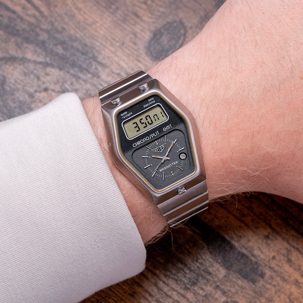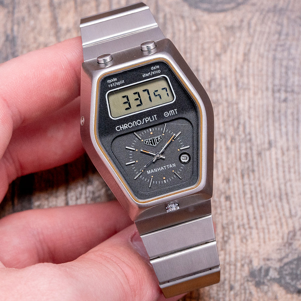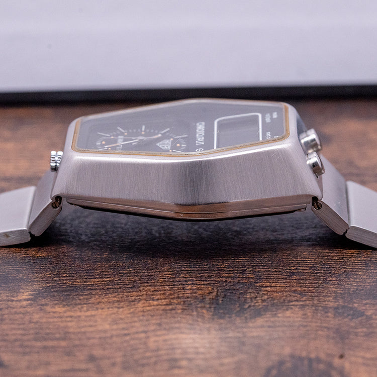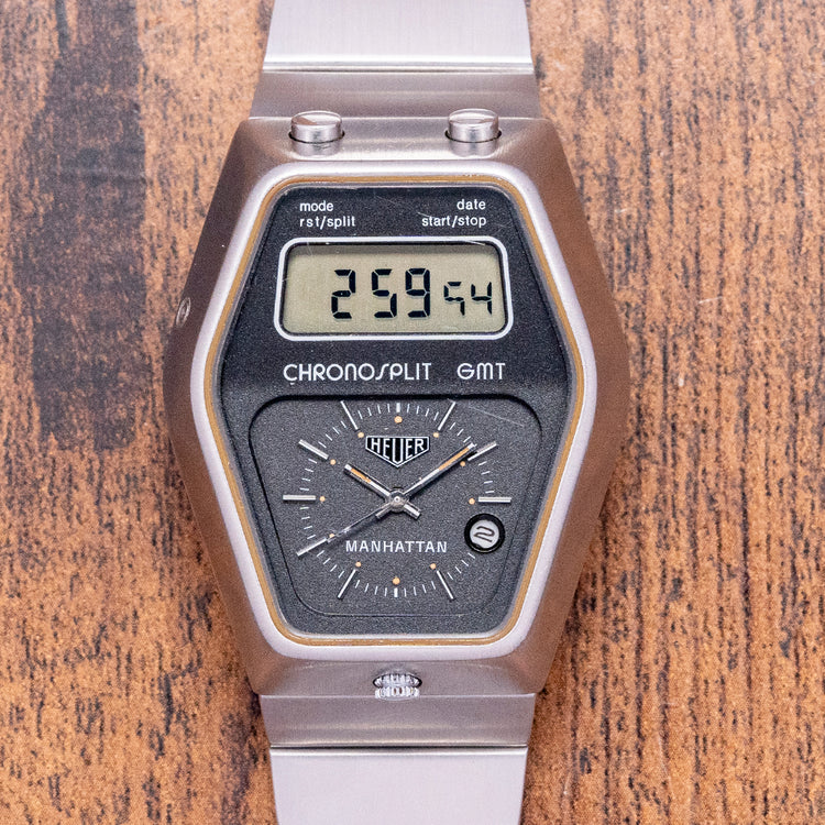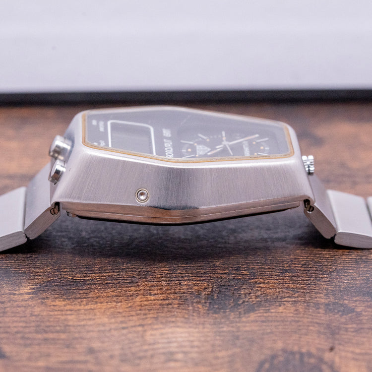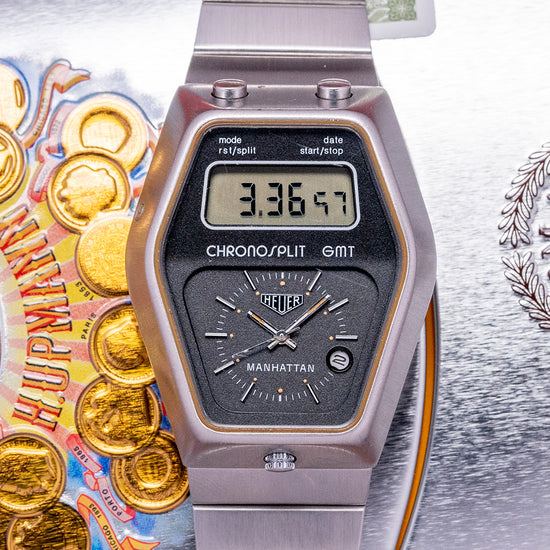 Here we have a funky 1970s Heuer Chronosplit GMT Manhattan Quartz 104.403 introduced in 1977 with its unusual coffin-shaped stainless steel case that seamlessly sits on your wrist thanks to the integrated bracelet. The soft rounded edges lead to the top edge labelled digital pushers, on the left side a recessed pusher for setting the quartz display and at 6 o’clock a crown to set the GMT analogue dial and date. A slim bezel holds a flat crystal above the Chronosplit dial. A digital display shows the time, split-time chronograph, and date. The lower recessed section holds the analogue GMT dial, an outer minute track with Tritium pips and stick indexes marking the hours, and a round date window at 4 o'clock. White baton hands are complemented by a white second hand. “Chronosplit GMT” and “Manhattan” are printed in white, completing this unapologetically best-of-both-worlds 1970s sports GMT. On the reverse a screwed-down solid case back, inside an early Quartz Cal. 107 / ESA 935.102 developed by Citizen. The watch comes paired with its 21mm integrated brushed stainless steel tapered bracelet secured by a signed folding clasp, will fit up to a 7-inch wrist and comes with its Tag Heuer instruction booklet.