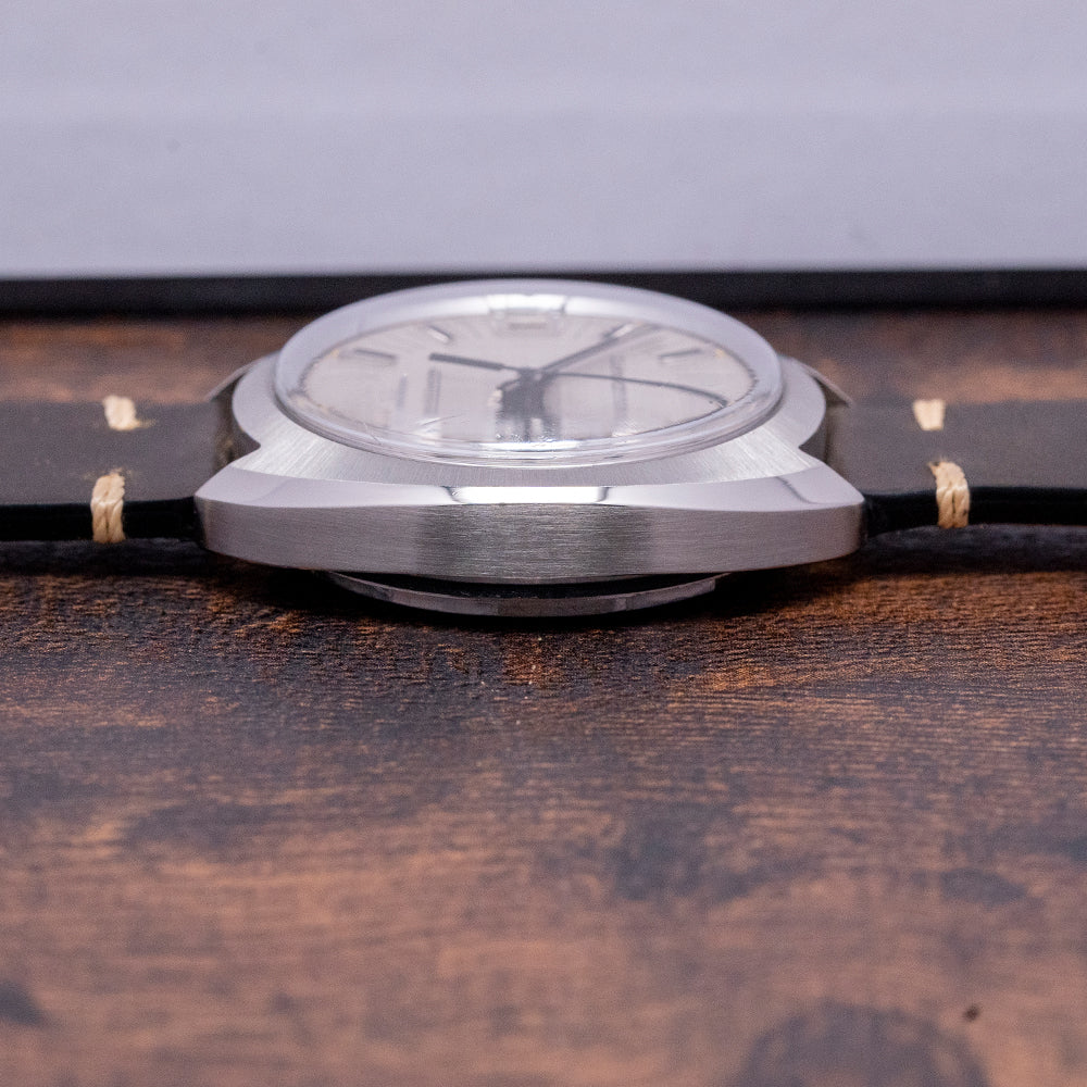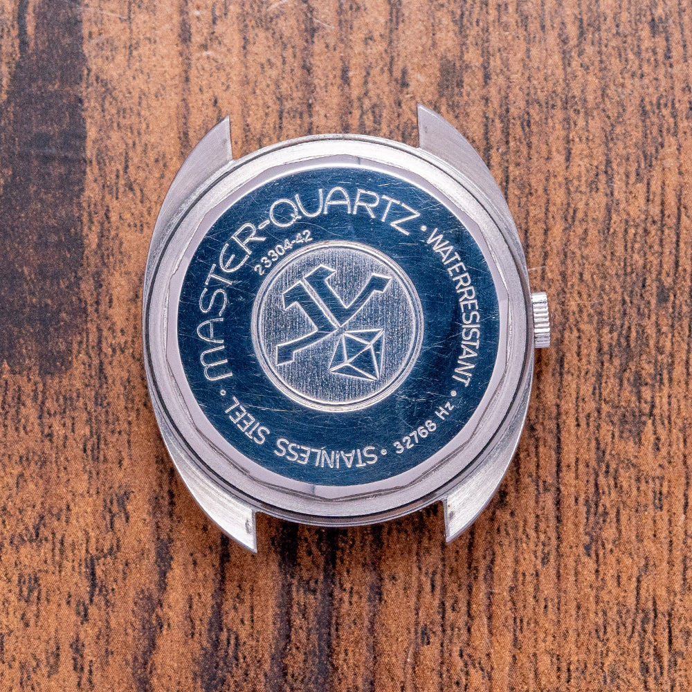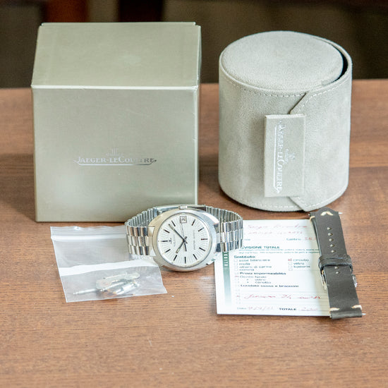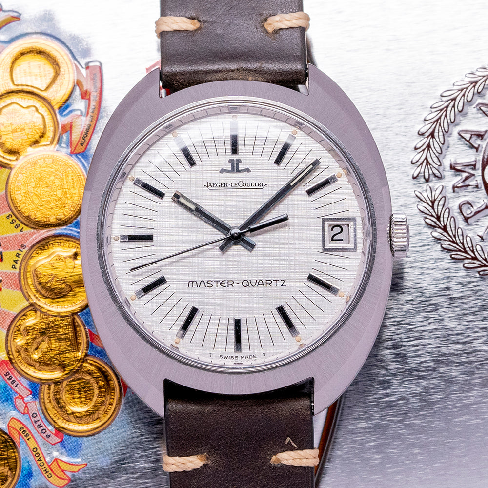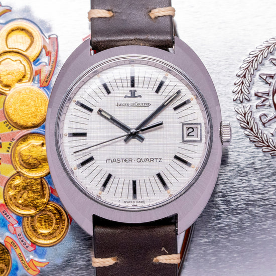 Here, we have a classic 1970s Jaeger-LeCoultre Master-Quartz 23304-42 with a 38mm C-shaped stainless steel case. The polished chamfered edge leads to a lug-to-lug length of 43mm and a case thickness of 13mm, ensuring a comfortable fit on your wrist. Brushed and polished surfaces transition with crisp lines. On the right side is a coin-edged signed crown. A domed crystal sits above a white crosshatch textured dial, an outer minute track has Tritium pips surrounding applied black painted baton indexes marking the hours, at 3 o’clock, a colour matched framed date window, slender black painted baton hands tipped with Tritium are complemented by a black tapered second hand. At noon, we have the Jaeger-LeCoultre motif, and at 6 o’clock, Master-Quartz. On the reverse, a screw-down solid case back with the details of the watch engraved around the edge and an embossed “JL” in the centre, inside a quality early Quartz Favre-Leuba Cal. 353. It comes paired with an 18mm JLC stainless steel bracelet secured by a signed folding sprung clasp, made by NSA, which will fit up to a 6.75-inch wrist without the spring clasp being activated, and it also comes with a JLC service box.