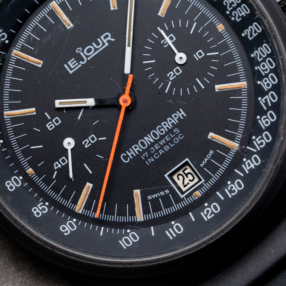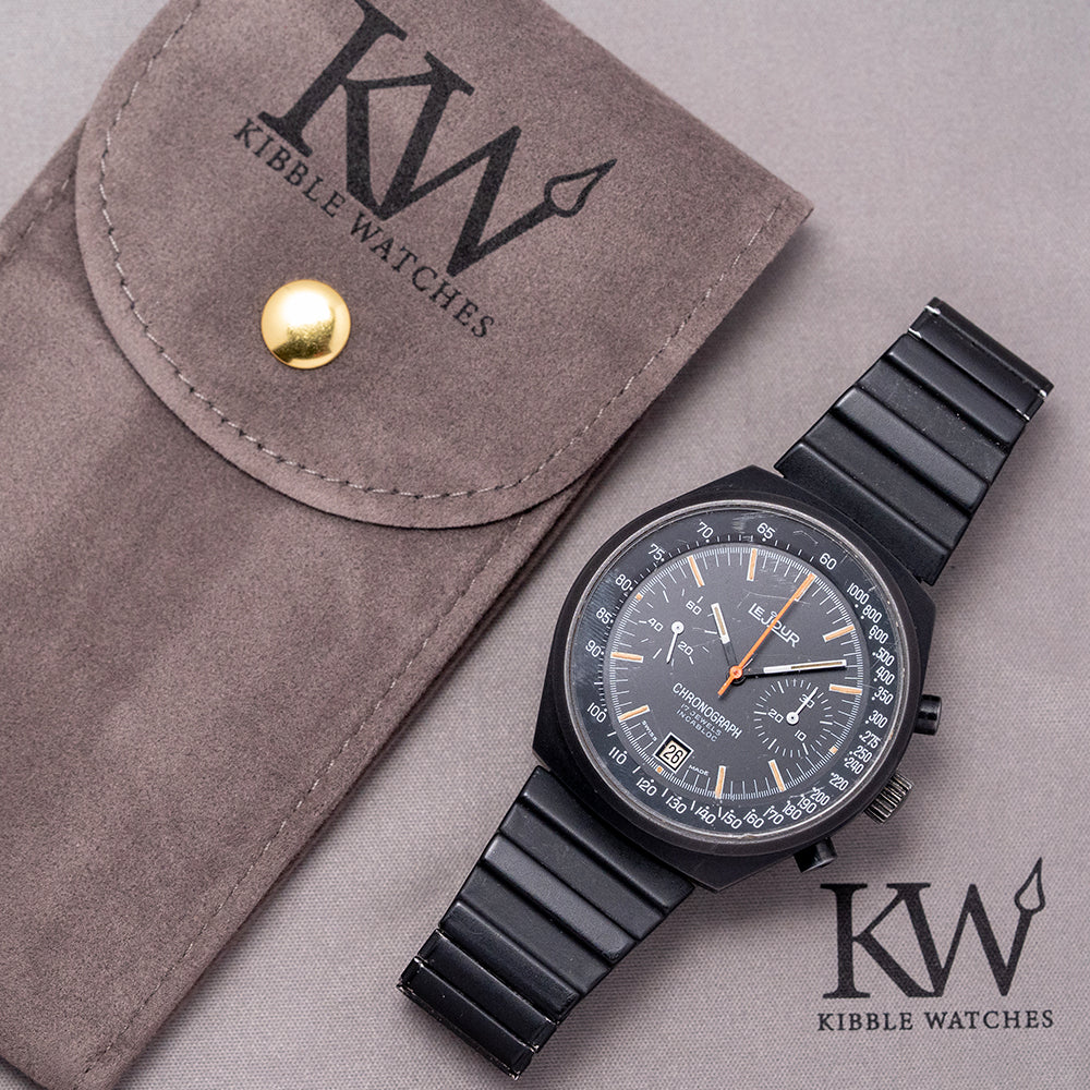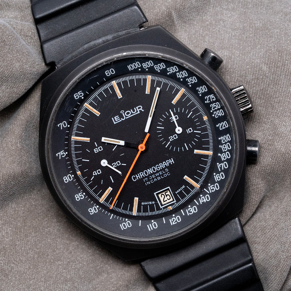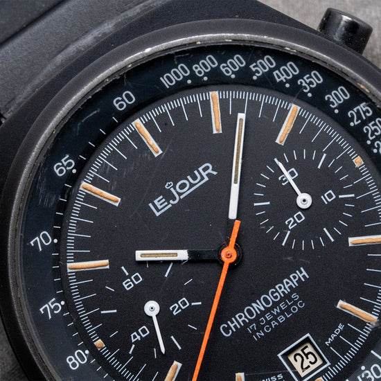 Here we have a 1970s LeJour Black PVD Chronograph, featuring a black PVD-coated tonneau-shaped case that sits comfortably on your wrist, with hooded lugs, nicknamed the ‘Poor-Man's Heuer’. Its curved flanks lead to a lug-to-lug length of 42mm and a case thickness of 13mm. Down the right side, we have the chronograph pushers and a coin-edged crown in the centre. Its domed crystal sits above a dynamic matte black bicompax dial. An outer sloped Tachymeter scale chapter ring surrounds a precisely executed minute track with Tritium-coated baton indexes marking the hours, at 3 o’clock a 30-minute register, at 6 o’clock a framed date window and finally at 9 o’clock a running seconds, black and white baton hands filled with Tritium are complemented by an orange tapered chronograph hand. At noon, we have the LeJour motif, printed underneath and at 6 o’clock, ‘Chronograph’ ‘17 Jewels’ ‘Incabloc’ completes this stealthy vintage bicompax. On the reverse, a screw-down stainless steel case back is engraved with the details of the watch and inside a manually wound Valjoux 7734, 17 jewels, beating at a leisurely 18,000 beats per hour. It comes paired with its rare 19mm black PVD-coated Spidel sprung bracelet, which will fit up to a 7.1-inch wrist.