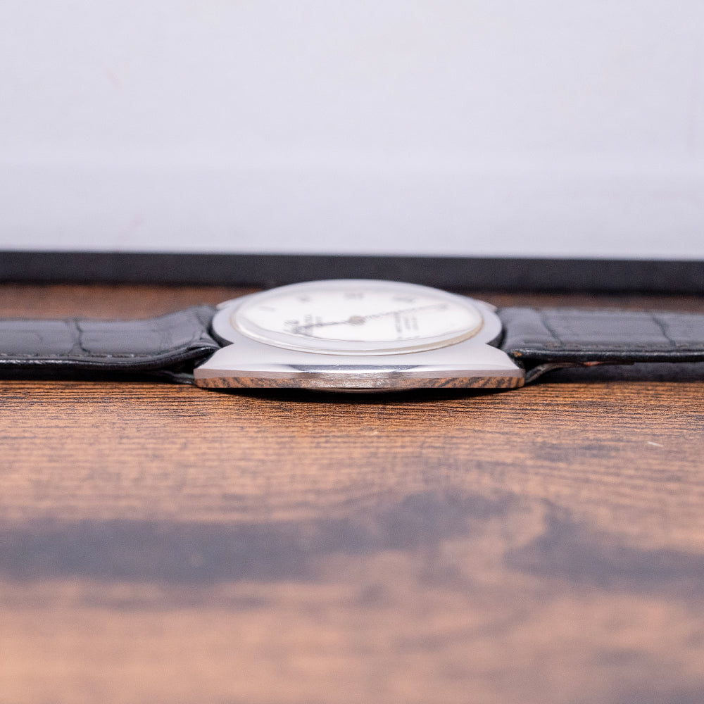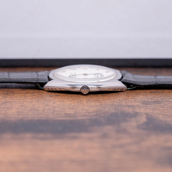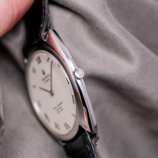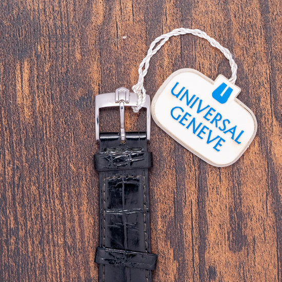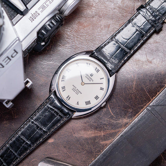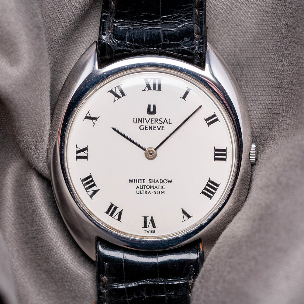 Here we have the classic 1970s Like-NOS Universal Geneve White Shadow Auto 866101. Launched in 1966, this collection was designed by the innovative mind of Gerald Genta. Featuring a curvaceous 35mm C-shaped stainless steel case. The polished curved flanks lead to a lug-to-lug length of 37.5mm and a case thickness of just 7mm, ensuring a comfortable fit. On the right side, there is a coin-edged signed crown. The thin, polished, smooth bezel holds a domed crystal above a stunning, crisp white dial. Attractive Black Roman numerals mark the hours, and stick hands sit majestically in the centre. At noon, we have the Universal Geneve motif, and at 6 o’clock, ‘White Shadow Automatic Ultra Slim’ completes this sophisticated, minimalist dress watch. On the reverse, a solid snap-off case back, inside a Micro-Rotor Automatic UG Cal. 2-66, 25 jewels, beating at 19,800 beats per hour. This in-house 2.5mm movement was the thinnest automatic in the world at that time; it was designed by Gerard Berret, who joined Patek Philippe in 1968. It comes paired with its original Universal Geneve 18mm leather strap and signed pin buckle. This watch is sold with its original Universal presentation box, swing tag and booklets; papers are signed but faded.