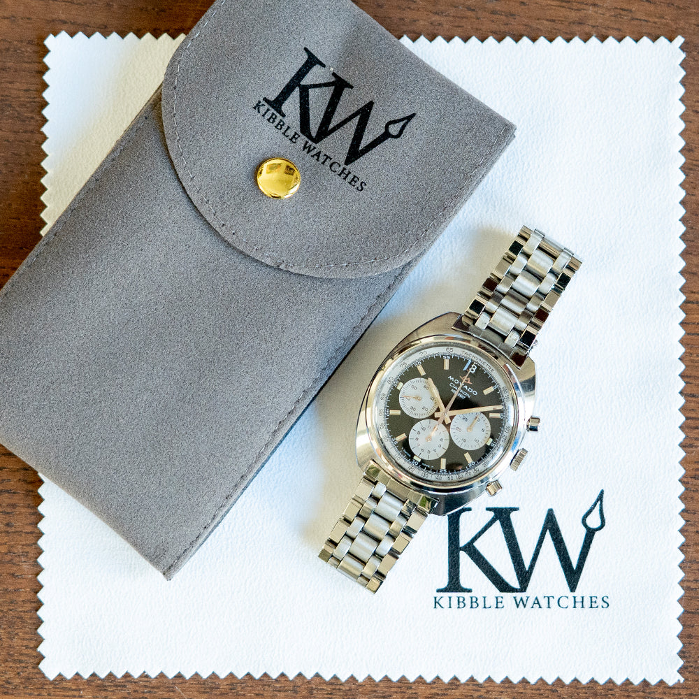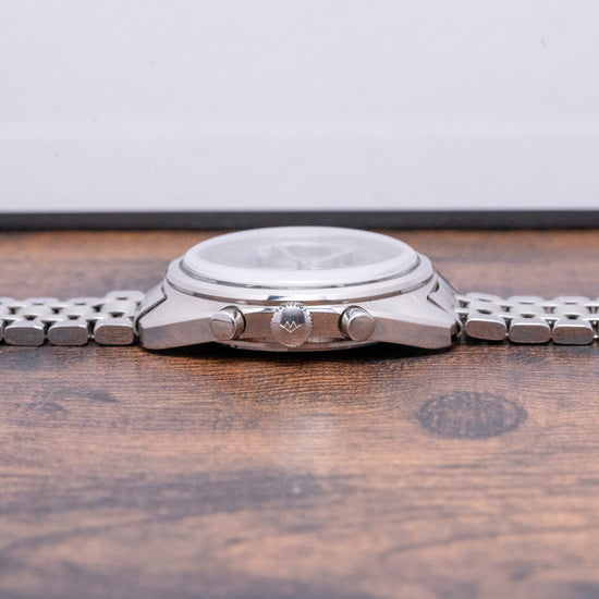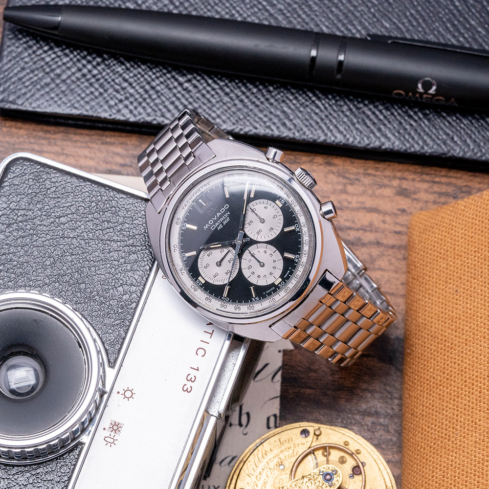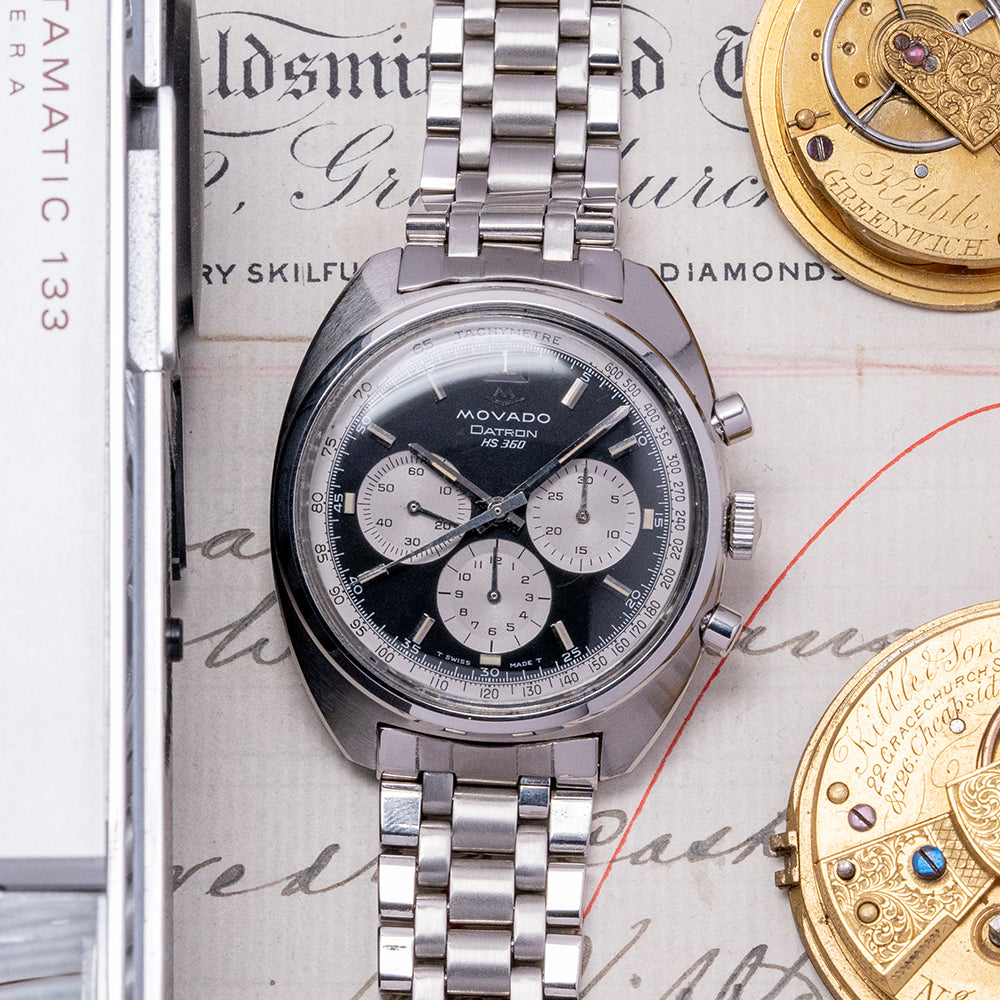 Here we have a 1970s Movado Datron HS 360 Sub Sea El Primero with a curvaceous 37.5mm C-shaped stainless steel case, Movado originally named the watch “Datachron”, an early model that sneakily found its way into space under the space suit of Commander Gerald P. “Jerry” Carr whilst wearing the official Omega Speedmaster on the outside of his suit, successfully boarding NASA's Skylab 4 mission in 1973, transferring from the workhorse Saturn 1B rocket used from 1966 until 1975. Carr joined the Astronaut Corps in 1966 and was one of only 19 candidates selected out of 5000 applicants. The curved flanks have a bevel edge that leads to a lug-to-lug length of 42.5mm and a case thickness of 12mm ensuring a comfortable fit, down the right side, we have the recessed piston chronograph pushers and a signed crown in the centre. The stepped bezel holds a domed plexiglass crystal above a black and white “Reverse Panda” dial. An outer Tachymeter scale surrounds a minute track precisely executed with applied chamfer-edged baton indexes filled with Tritium marking the hours, unusually at 12 o’clock a date window is black with white numerals. The white recessed sub-dials consist of a 30-minute, a 12-hour and a small seconds, slender steel hands lined with Tritium are complemented by a tapered chronograph hand, at 12 o’clock we have the applied Movado motif and “Datron HS 360” printed underneath completing this very dynamic chronograph. On the reverse a screw-down case back with Sub Sea engraved into it, inside a quality automatic Zenith El. Primero 3019PHC, beating at 36,000 beats per hour, Movado modified the movement to incorporate the date, released in 1969 this was one of the first automatic chronographs and was used in the Rolex Daytona. At the time Zenith, Movado and Mondia belonged to the same holding company from 1969 until 1984 and therefore used each other's movements, cases and dials. The watch comes paired with its original brushed and polished 18mm Movado stainless steel bracelet with a signed folding clasp.
