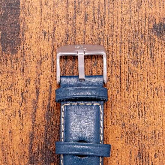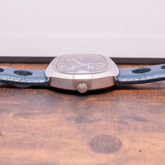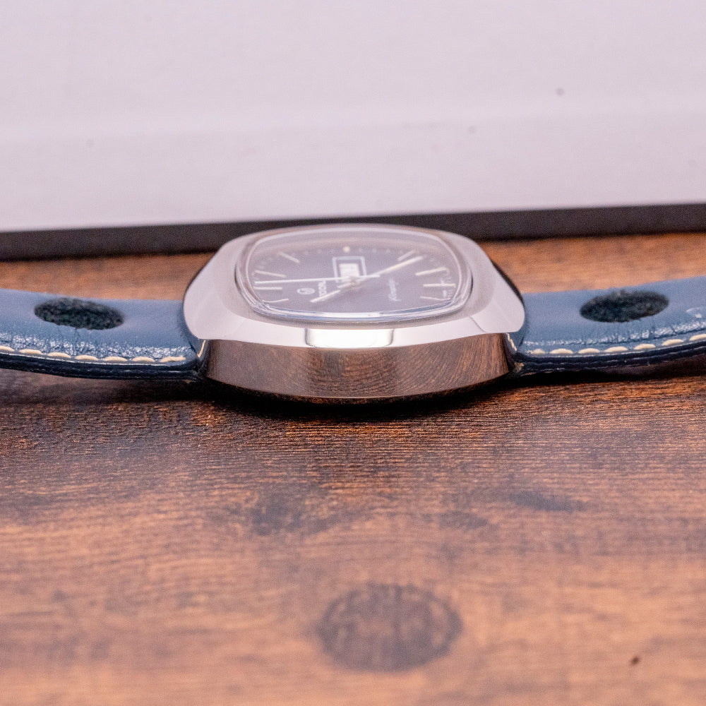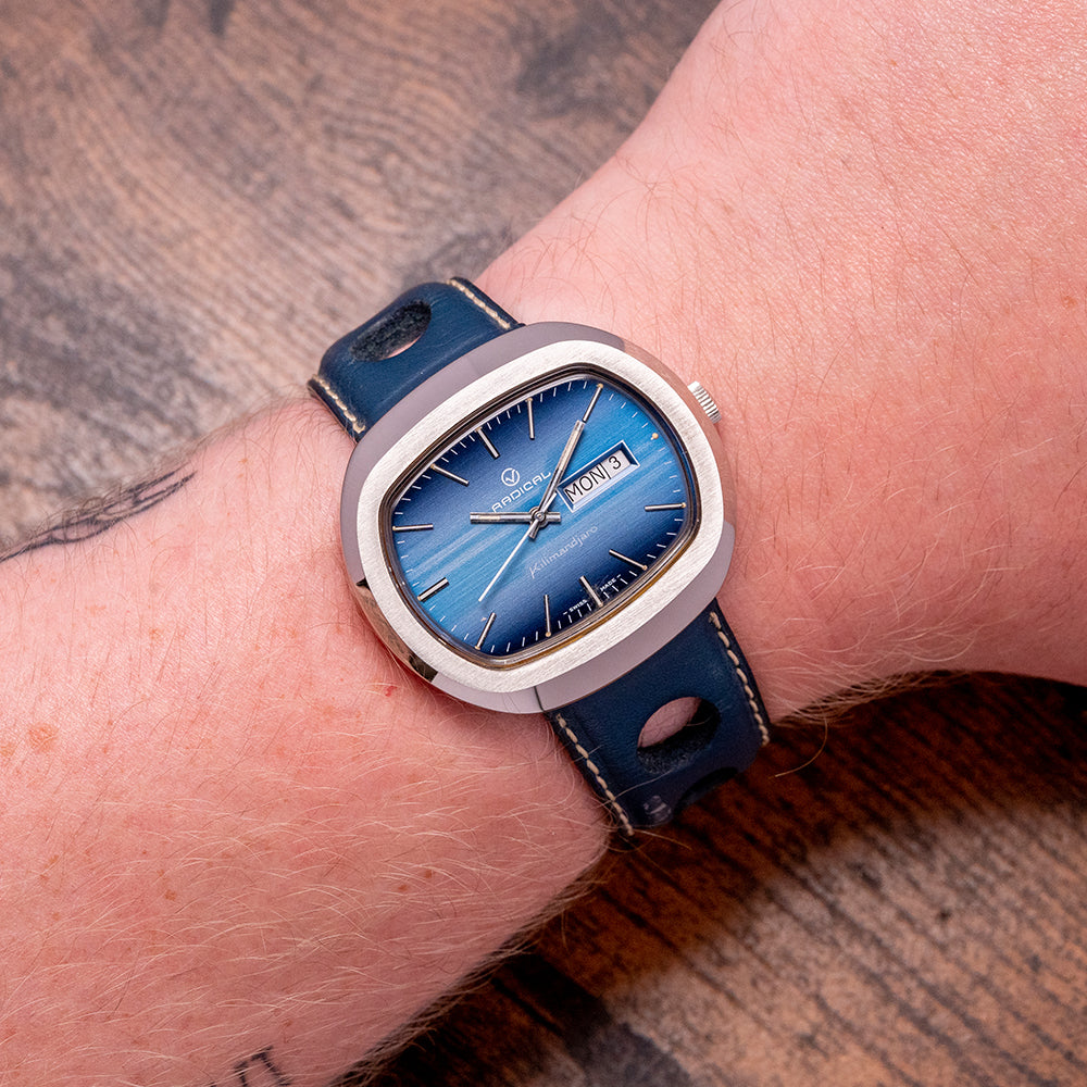 Here, we have a 1970s New Old Stock Radical Kilimandjaro Blue Day/Date with a polished and brushed stainless steel oval-shaped case. The polished flanks lead to covered lugs with a lug-to-lug length of 37mm and a case thickness of 11mm, ensuring a comfortable fit. On the right side is a signed coin-edged push/pull crown. A brushed smooth bezel holds an oval-shaped crystal above a striking horizontal brushed two-tone blue dial, an outer minute track with lume pips and applied baton indexes mark the hours; at 3 o’clock, a framed day/date window, elegant slim baton hands tipped with lume are complemented by a white seconds hand; at 12 o’clock, we have the Radical motif and at 12 o’clock “Kilimandjaro” completes this sophisticated dress watch. On the reverse, a screwed-down case back with its sticker still in place above the engraved details of the watch, inside an automatic ETA Cal. 2789, 25 jewels, beating at 21,600 beats per hour. The watch comes paired with a well-suited blue rally-style leather strap and pin buckle.