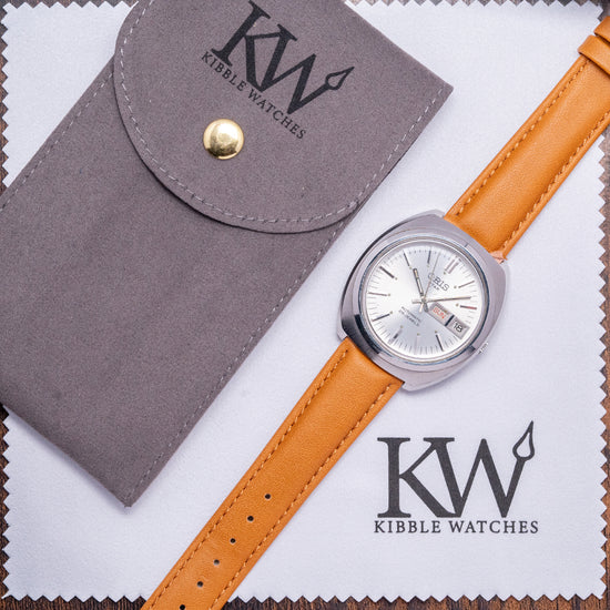 Here we have a classic 1970s Oris Star Automatic Day Date Automatic 648 KIF with a 37mm stainless steel tonneau-shaped case that sits on your wrist like a cushion. Bevel-edged curved flanks lead to flat-ended lugs with a lug-to-lug length of 40mm and a case thickness of 12mm, ensuring a comfortable fit on your wrist. On the right side, there is a coin-edged crown that you push in to change the date. The smooth bezel holds a domed crystal above a sunburst silver dial. An outer minute track has applied facet-edged baton indexes with lume pips marking the hours, at 3 o’clock a red on white background day and black on white background date. Slender steel baton hands filled with lume are complemented by a tapered seconds hand. At noon, we have the Oris ‘Star’ motif, and at 6 o’clock, 'Automatic 25 Jewels’, completing this fun and affordable vintage timepiece. On the reverse, a screw-down solid case back with the details of the watch around its edge and the Oris shield logo in the centre. Inside an automatic Oris Cal. 648 KIF, 25 jewels, beating at a leisurely 18,000 beats per hour, fitted with the KIF shock protection system, which was a direct competitor to the Incabloc protection system. It comes paired with an 18mm well-suited aftermarket quick-release leather strap and pin buckle.