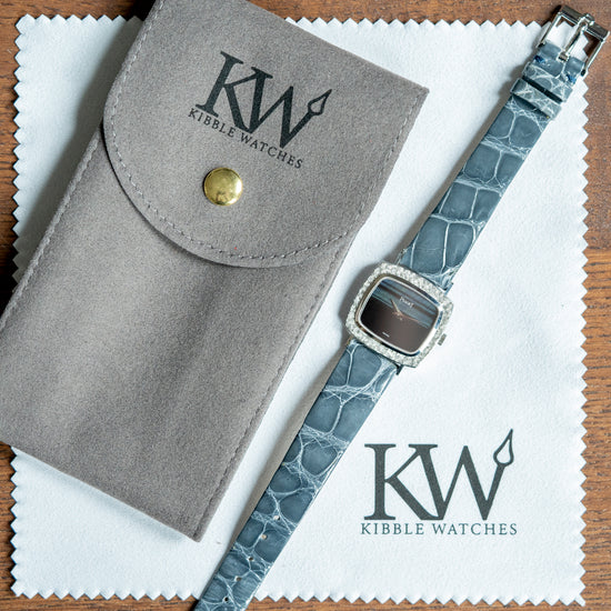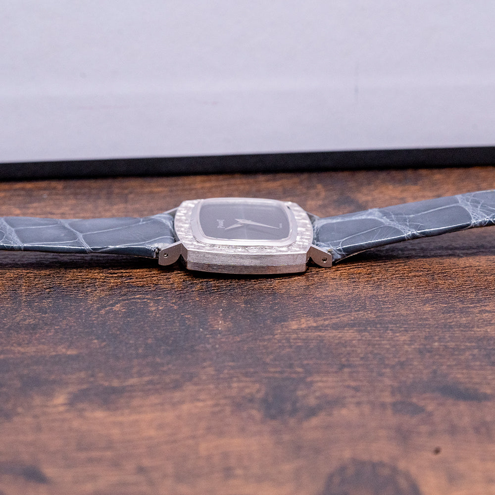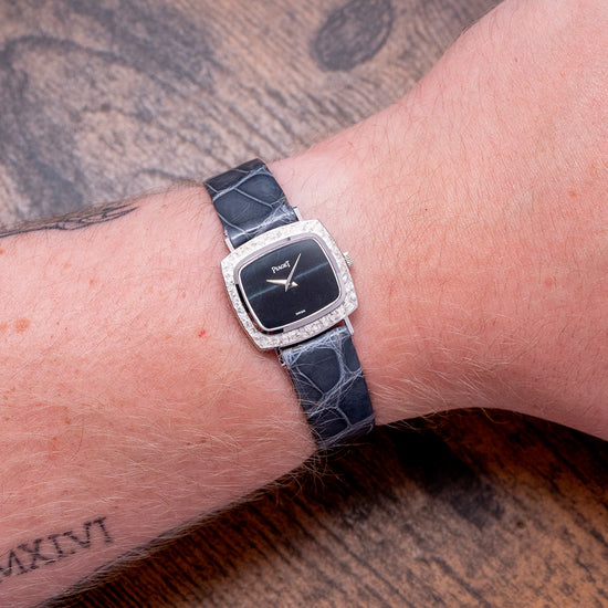 Here we have a 1970s Piaget Black Tie Black Tigers Eye White Gold 9562 with a 24mm square 18ct White Gold case. Elegant chamfered lines lead to straight drilled lugs with a lug-to-lug length of 28mm and a case thickness of just 5mm, ensuring a comfortable cushion fit on your wrist. On the right side is a coin-edge crown. A linen textured top surface has a polished bezel that holds a flat crystal above an unusual and beautiful black Tigers Eye dial; elegant faceted Dauphine Hands sit majestically in the centre of this sterile dial. On the reverse, a screwed-down case back, inside a manually wound Piaget Cal. 9P, 18 jewels, 19,800 beats per hour. This incredibly thin movement at 2mm was launched in 1957 and is still one of the thinnest mechanical movements. The watch comes fitted on a 14mm leather strap with its original Piaget 18ct white gold buckle.