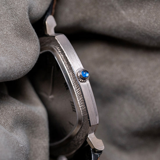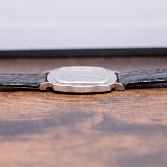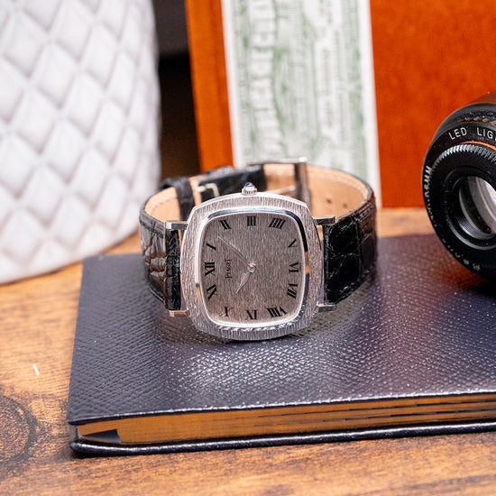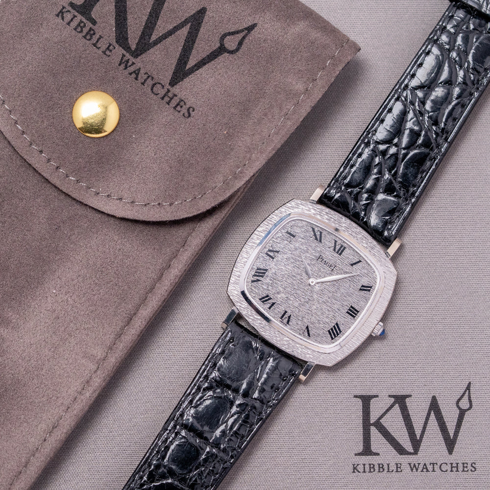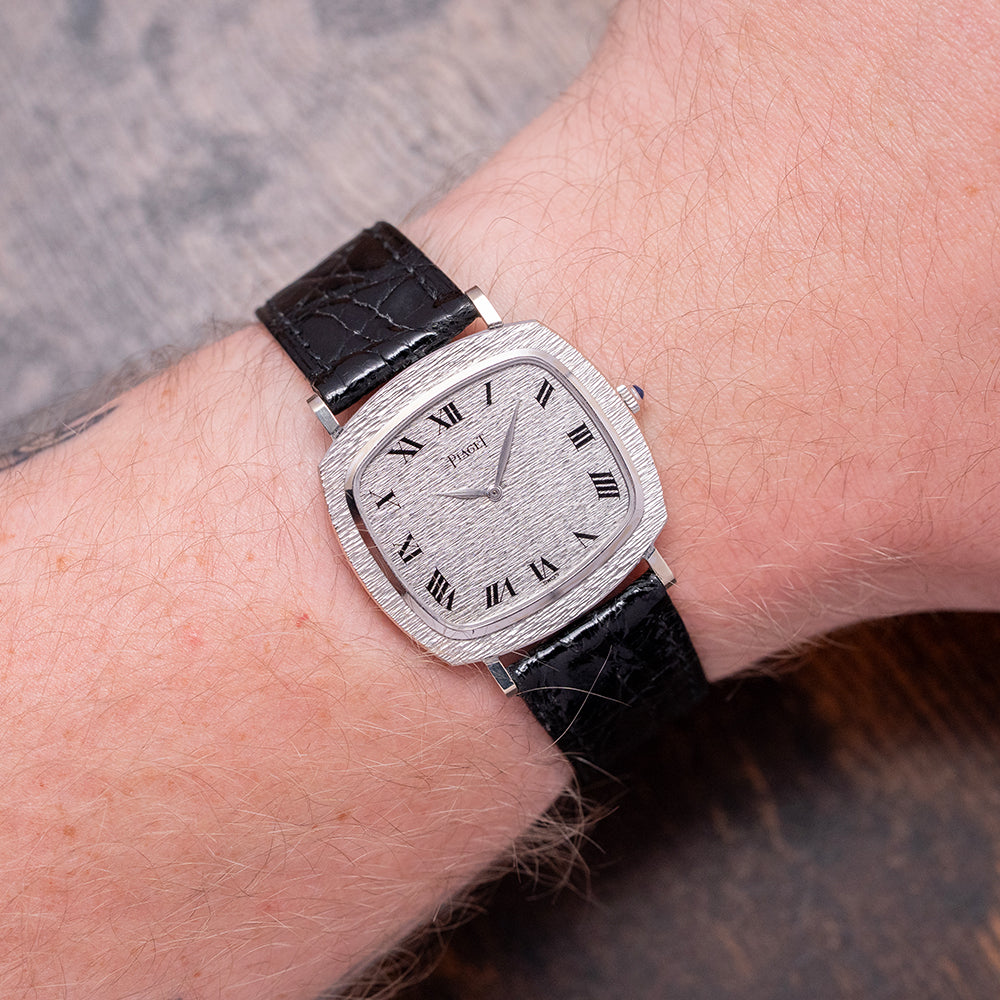 Here we have a 1970s Piaget Black Tie Emperador TV 18ct White Gold 9434, featuring a brushed 32mm square 18ct White Gold TV-shaped case. Elegant chamfered lines lead to straight, flat-ended lugs with a lug-to-lug length of 36.5mm and a case thickness of just 4.5mm, ensuring a comfortable, cushioned fit on your wrist. On the right side is a coin-edge crown capped with a blue cabochon. A decorative, bark-textured top surface features a polished bezel that holds a flat crystal above a stunning bark-textured dial. Black printed Roman numeral indexes mark the hours. Elegant, leaf hands sit majestically in the centre of this desirable dial. On the reverse, a brushed, screwed-down case back, inside a manually wound Piaget Cal. 9P, 18 jewels, 19,800 beats per hour. This incredibly thin movement, at just 2mm, was launched in 1957 and remains one of the thinnest mechanical movements. It comes paired with a well-suited 18mm leather strap and its original hallmarked Piaget 18ct white gold buckle.