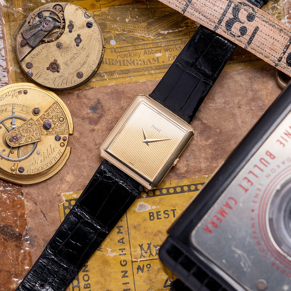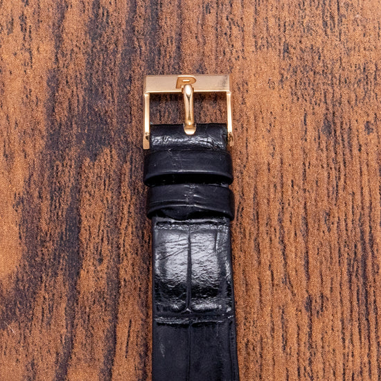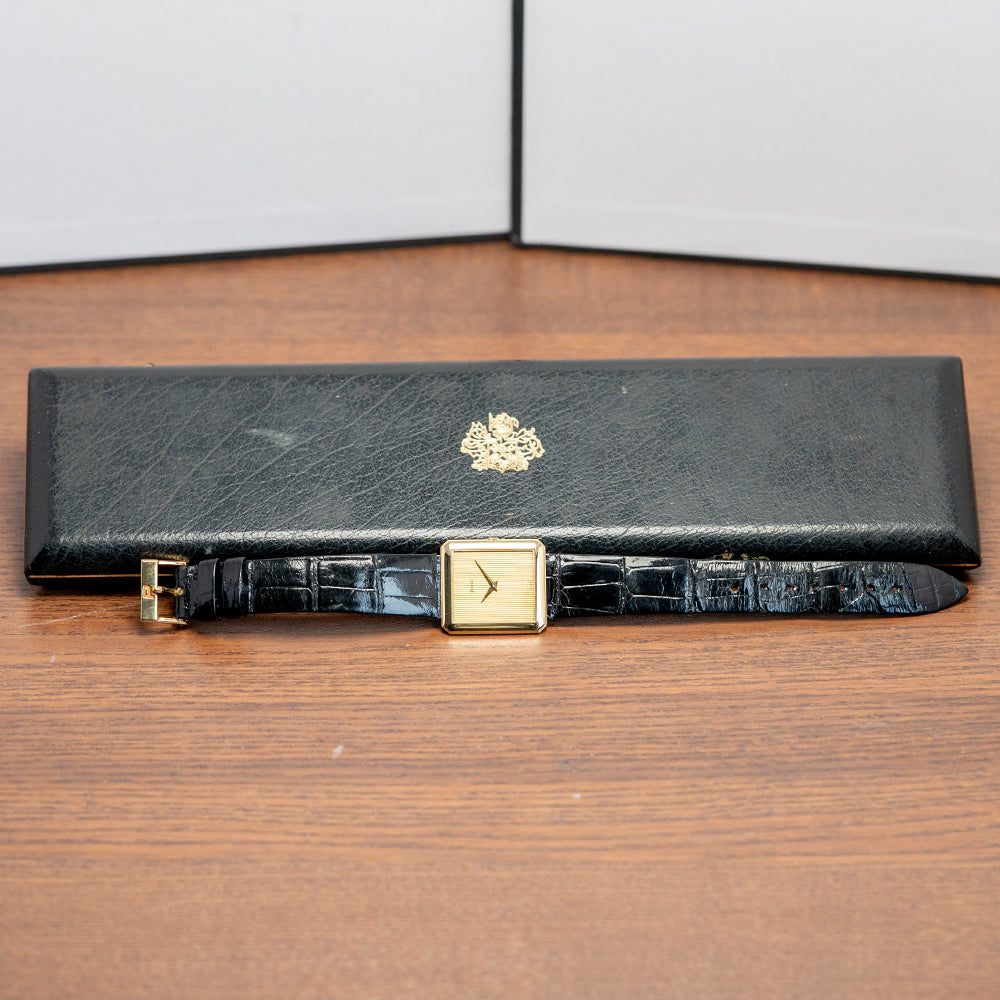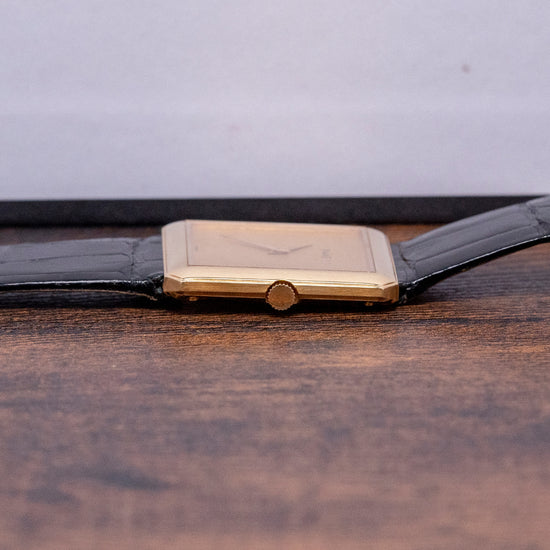 Here, we have a 1970s Piaget Protocole 'Tank' 18ct Yellow Gold 91542 with a 25mm 18ct Yellow Gold rectangular case. Its ultrathin profile is perfect in form and function. The case is machined by a process of hot rolling the Gold into its shape rather than the more typical pressing method. Chamfered corners and recessed lugs with a lug-to-lug length of 27.5mm and a case thickness of just 4.5mm ensure a very comfortable fit on your wrist. On the right side is a crown with a coin edge. The smooth bezel holds a chamfered-edged flat crystal above a rich golden vertical striped dial. Two elegant dauphine hands sit centrally, creating a beautifully balanced timepiece. Piaget sits at 12 o’clock and Swiss at 6 o’clock. On the reverse, a screwed-down case back with Swiss Hallmarks, inside a manually wound Piaget Cal. 9P2, 18 jewels, 19,800 beats per hour. This incredibly thin movement at 2mm was launched in 1957 and still holds the world record for one of the thinnest mechanical movements. It comes paired with its 17mm Piaget leather strap and its original Piaget 18ct gold buckle, complete with Swiss Hallmarks. The watch is sold with its original Piaget presentation box.