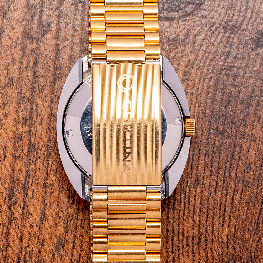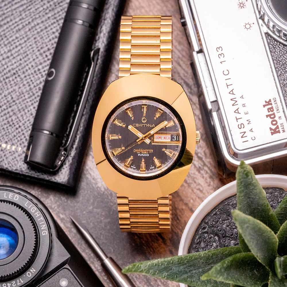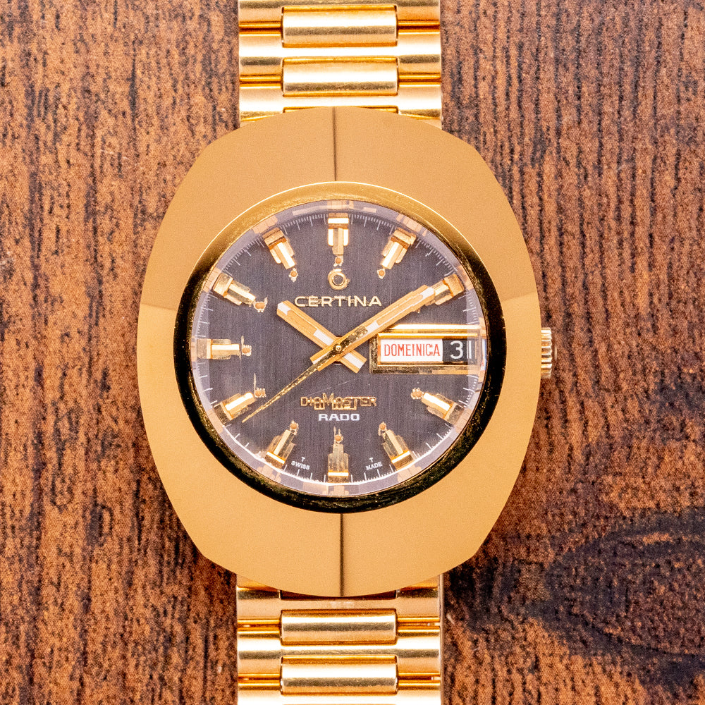 This is without question one of the most intriguing designs I have had in a while and features both Certina & Rado proudly on the dial, a collaboration between the two at a time when the quartz crisis was rampaging through Switzerland, leaving brands like these little choices but to work together to survive! This DiaMaster features a bold gold-plated Tungsten Carbide case, faceted crystal, a Certina signed NSA stretch clasp bracelet and a gold-plated Certina buckle for good measure. I would not hesitate to add this rare gem to your collection.