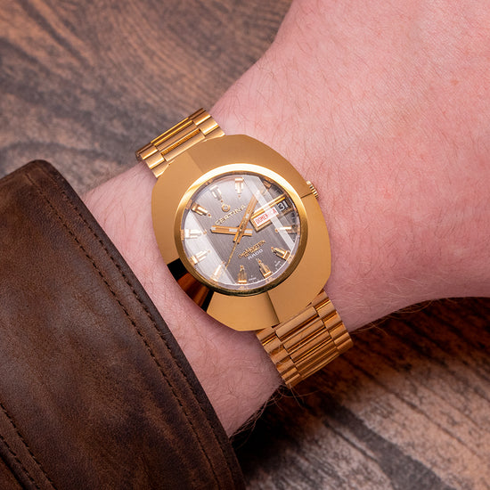 Here we have a 1970s Rare Certina x Rado DiaMaster Day/Date, launched in 1977, the distinctive 35mm Gold plated Tungsten Carbide tonneau-shaped case is made by RADO and was first used on their Diastar watches. The case goes through a process of pressing Tungsten and Cobalt powder under high temperatures up to 1000 degrees C and moulding the blanks into the case shape, then finally heating to 1400 Degrees C to create this incredibly hard scratch-resistant surface and then gold plated. In 1976 Muhammad Ali, the World Heavyweight Champion was picked to be Certina product Ambassador and given a DiaMaster. A lug-to-lug length of 42.5mm and a case thickness of 12.5mm give the watch an impressive wrist presence. On the right is a signed crown, the faceted crystal sits recessed above a vertically brushed grey dial. An outer minute track is precisely executed with applied gold-plated stepped chamfer-edged indexes and Tritium pips marking the hours, at 3 o’clock a day/date framed window, thick gold-plated baton hands filled with Tritium are complemented by a tapered sweeping second hand, at 12 o’clock we have the applied Certina motif and at 6 o’clock “DiaMaster RADO” complete this dynamic dual branded timepiece. Inside an automatic Certina Cal. 25-032, 25 jewels, beating at 28,800 beats per hour, based on the ETA 2789. The watch comes paired with its full-size 18mm gold plated bracelet secured by a folding spring adjusted signed clasp plus an 18mm leather strap with a Certina buckle.