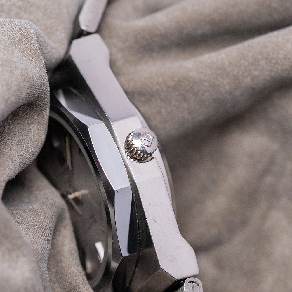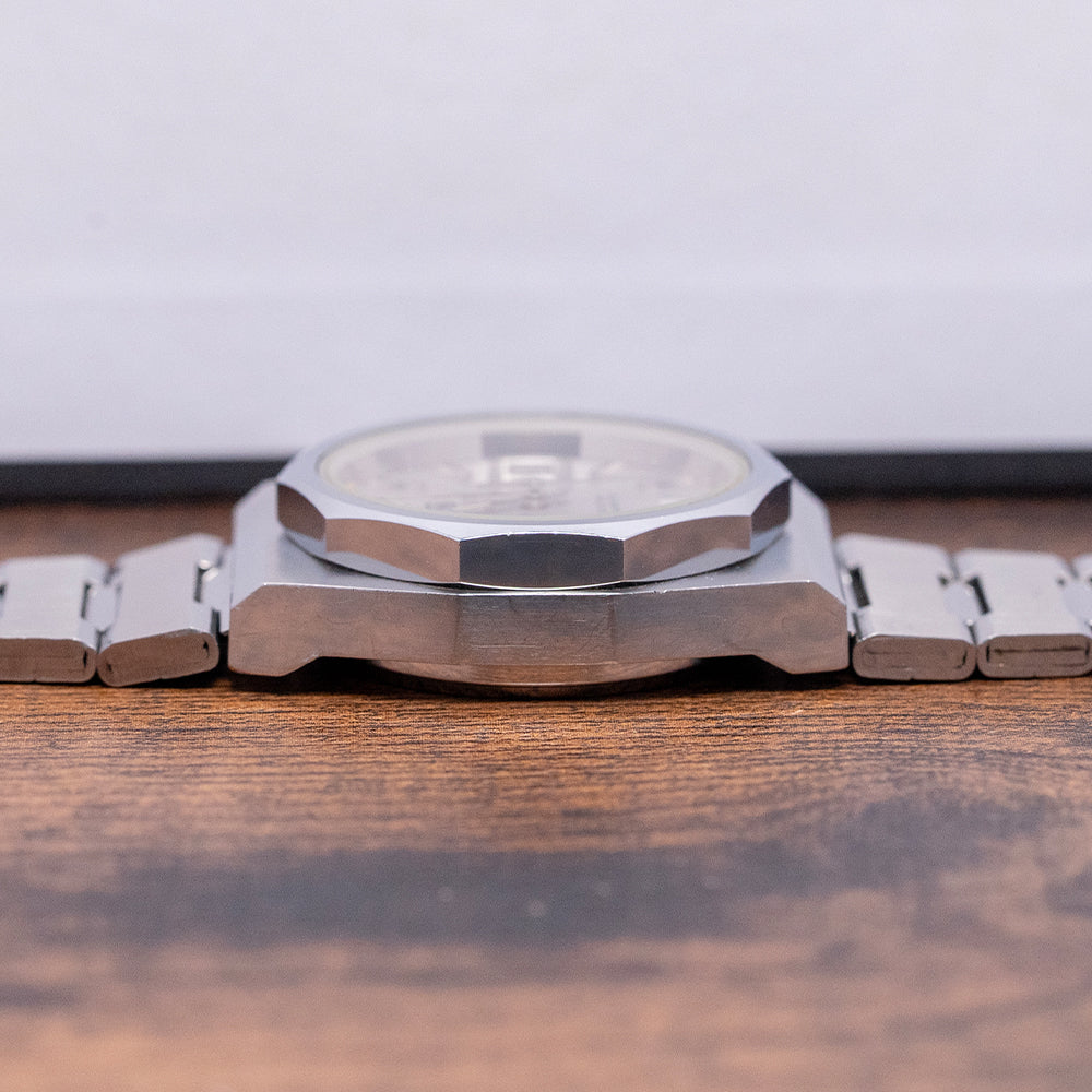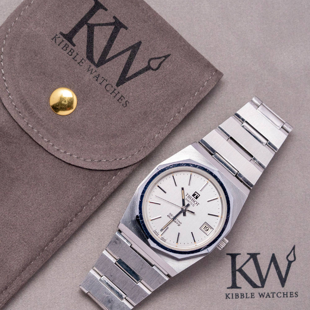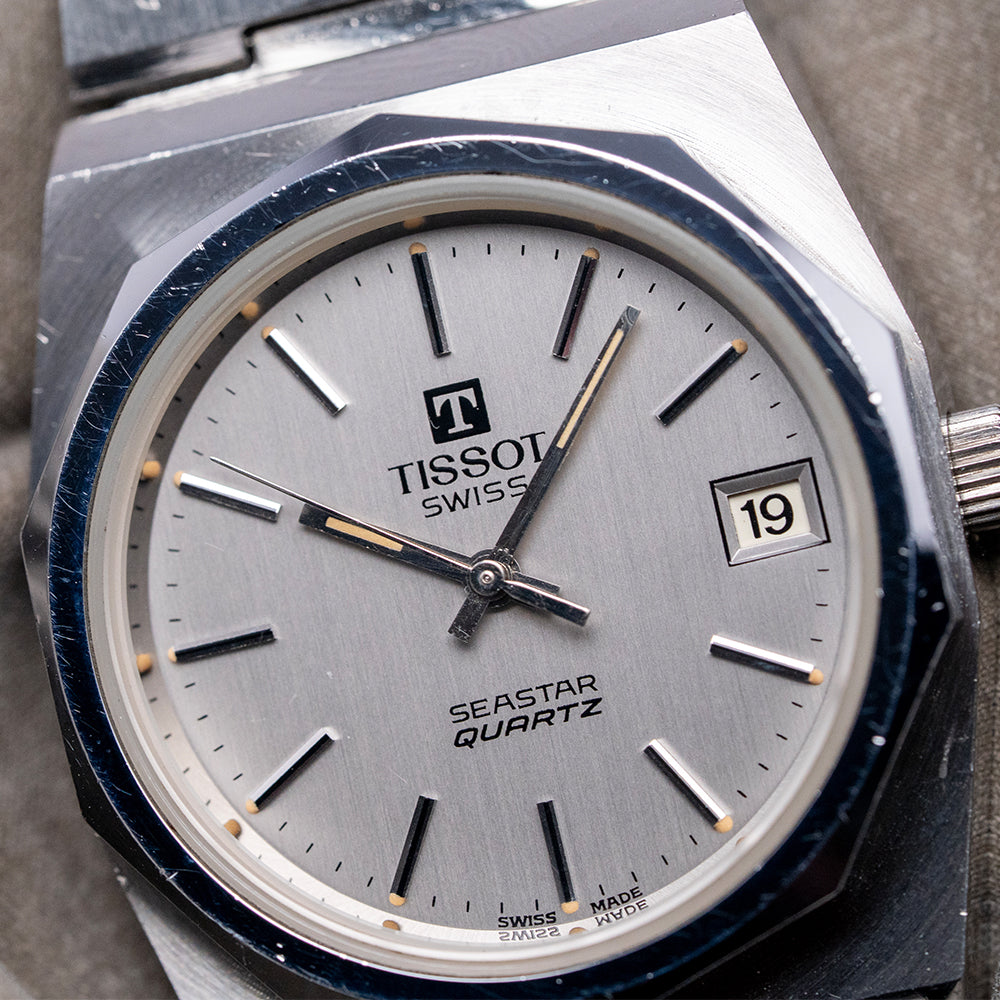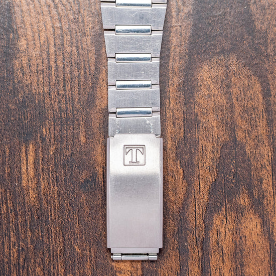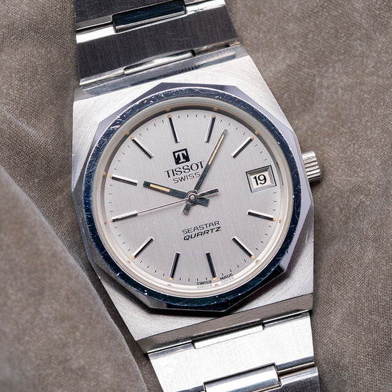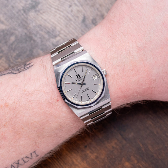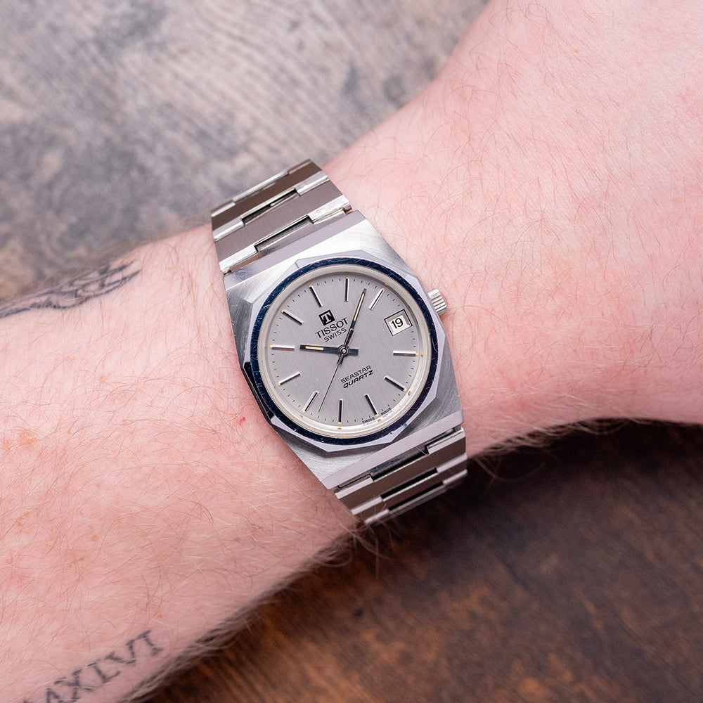 Here we have a classic 1970s Tissot Seastar Quartz 'PRX' on a Bracelet 40641, featuring a brushed and polished 35mm tonneau-shaped stainless steel case that sits comfortably on your wrist, with flat-ended lugs and a flowing, integrated bracelet. This iconic watch design inspired the latest Tissot PRX collection. Polished bevel-edged flanks lead to a lug-to-lug length of 41mm and a case thickness of 12mm. On the right side, a coin-edged crown. The polished, smooth-sloping bezel features a flat crystal above a silver dial. An outer minute track with Tritium pips and thin batons marking the hours, at 3 o’clock, a framed date window. Slim baton hands tipped with Tritium are complemented by a tapered second hand. At noon, we have the applied ‘T’ and ‘Tissot’ printed underneath, at 6 o’clock, ‘Seastar Quartz’ completes this Genta-inspired timepiece. On the reverse, a solid brushed and polished case back, inside a rare Quartz Tissot Cal. 2030, developed in 1976 by SSIH Group. It had a limited production run when it was upgraded to the Calibre 2031 in 1978. To set the minutes, the wearer needs to press the crown for five seconds, release it, and then repress it again to engage the motor. The internal stepping motor would then move the minute and hour hands to the desired position. A useful feature for the traveller was the convenient function that allowed the hour hand to be set independently of the minute hand by pulling the crown. It comes paired with its 22mm integrated stainless steel bracelet secured by an adjustable folding clasp.