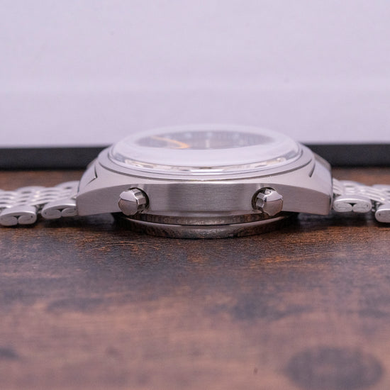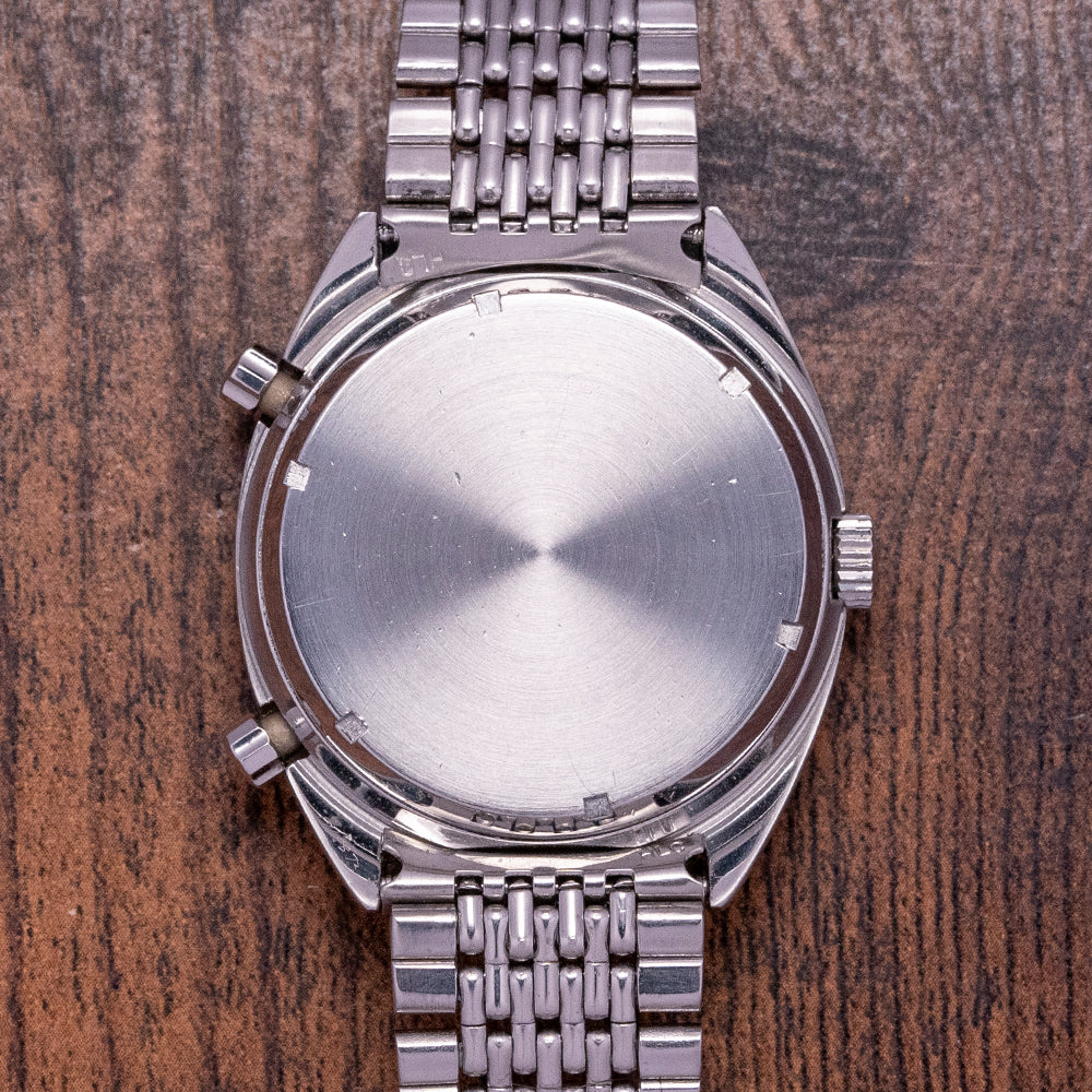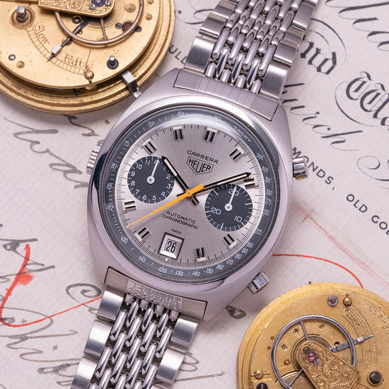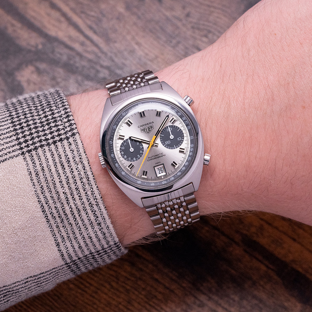 Here we have a 1971 Heuer Carrera Chronograph Cal. 12 on a 19mm Gay Freres BOR 1153 bracelet with a 38mm “C” shaped stainless steel case that curves over your wrist with stubby tapered lugs, a lug-to-lug length of 44mm and a case thickness of 14mm give the watch an impressive wrist presence. Down the right side, we have the piston chronograph pushers and on the left side in the centre a signed crown. A smooth polished bezel holds a domed crystal above a sunburst silver bicompax dial, a black Tachymeter chapter ring surrounds a precise minute track with applied baton indexes marking the hours infilled with lume, at 3 o’clock a black 30-minute register and at 6 o’clock a framed date window and finally at 9 o’clock a black 12-hour register, slender sword hands are complemented by an orange chronograph hand, at 12 o’clock we have the CARRERA HEUER motif and at 6 o’clock “Automatic Chronograph” complete this vintage bicompax chronograph sports watch. On the reverse a screw-down case back, inside an automatic Heuer Cal. 12, 17 jewels, beating at 21,600 beats per hour, this early automatic chronograph was released in 1971 and stayed in production until 1980 and improved on the Heuer Cal. 11 that was jointly developed with the help of Breitling, Hamilton-Buren and Dubois-Depraz in March 1969. The watch comes paired with an original 19mm Gay Freres stainless steel “Beads of Rice” bracelet with a signed folding clasp and fliplock, and the watch comes with a Tag Heuer service case.