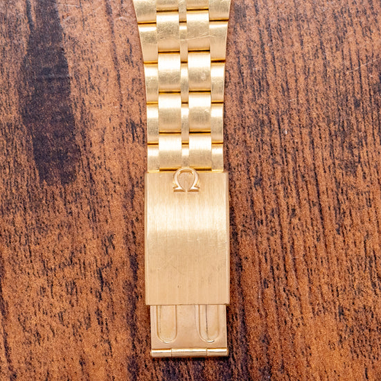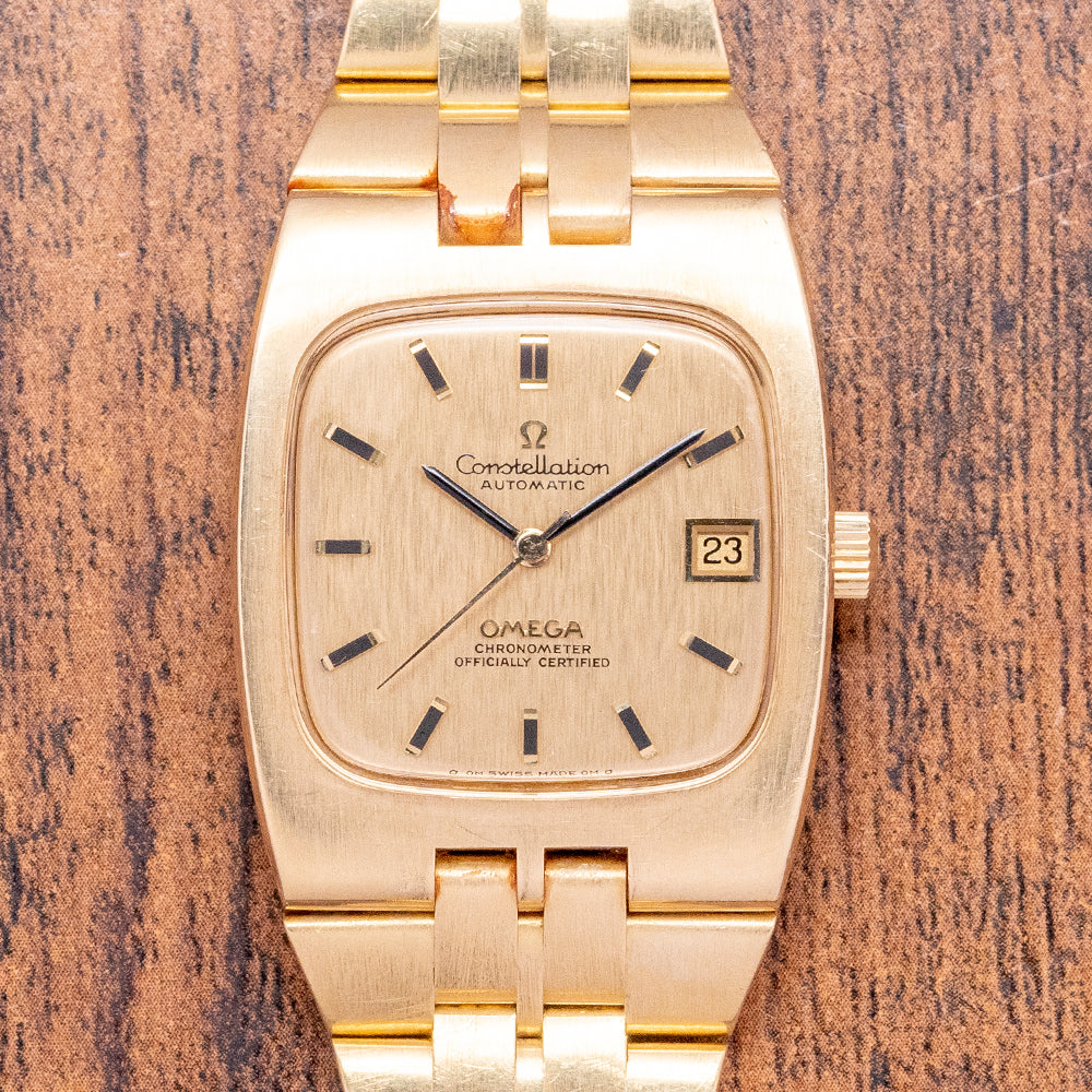 Here we have a rare classic 1971 Omega Constellation Chronometer 18ct Gold 168.047. Omega first introduced the Constellation in 1952. At the time, it was Omega's flagship timepiece. The first models had a Cal. 354 bumper movement in them. Later, in 1955, Omega introduced the Automatic Cal. 50x, followed in 1959 by the Cal.55x (no date) and 56x (date) versions. Many of the Constellations came with pie-pan dials, diamond indexes, and fancy lug configurations. All the gold Constellations of that time have the Observatory of Geneva hand engraved on the back. The stainless steel and stainless steel/gold versions had a gold medallion on the back with the Observatory of Geneva. The eight stars above the Observatory stand for the many exploits of Omega in the world Chronometer competition. Celebrating the fact that all Constellations are Chronometer Certified. It has a 33mm 18ct Yellow Gold tonneau-shaped case with satin-brushed finished drilled lugs that flow into the integrated bracelet, its design is unapologetically 1970s. The chamfered edge creates a seamless flank profile that leads to a lug-to-lug length of 39mm and a case thickness of 9mm, ensuring a comfortable fit on your wrist. On the right side sits a signed crown. The raised flat 1970s TV-shaped crystal protects a textured solid gold dial. The applied baton indexes filled in black mark the hours. Slim black baton hands are complemented with an 18ct Yellow Gold tapered sweeping seconds hand. At 3 o’clock, a date window. At noon, we have an 18ct Yellow Gold Omega, “Constellation Automatic,” printed underneath, and at 6 o’clock, an 18ct Yellow Gold Omega motif, "Chronometer Officially Certified" on the bottom edge, we have “OM SWISS MADE OM” which stands for Or Massif or “Solid Gold” in French, completes this sophisticated dress watch. On the reverse, a screwed-down 18ct Yellow Gold case back with an embossed Observatory and eight stars, inside, we have an automatic Omega Cal. 1001, 20 jewels, 28,800 beats per hour, and features hacking and quick set date functions for your convenience. It comes paired with its original 26.5mm integrated Omega 18ct Yellow Gold bracelet with a satin-brushed finish and a signed folding clasp with micro-adjustments and will fit up to a 7-inch wrist.