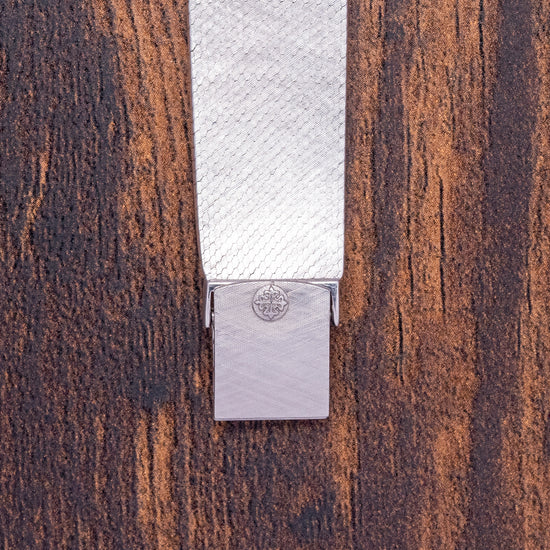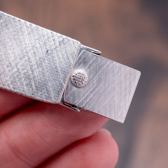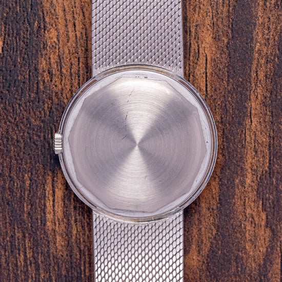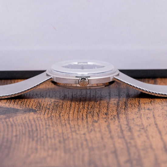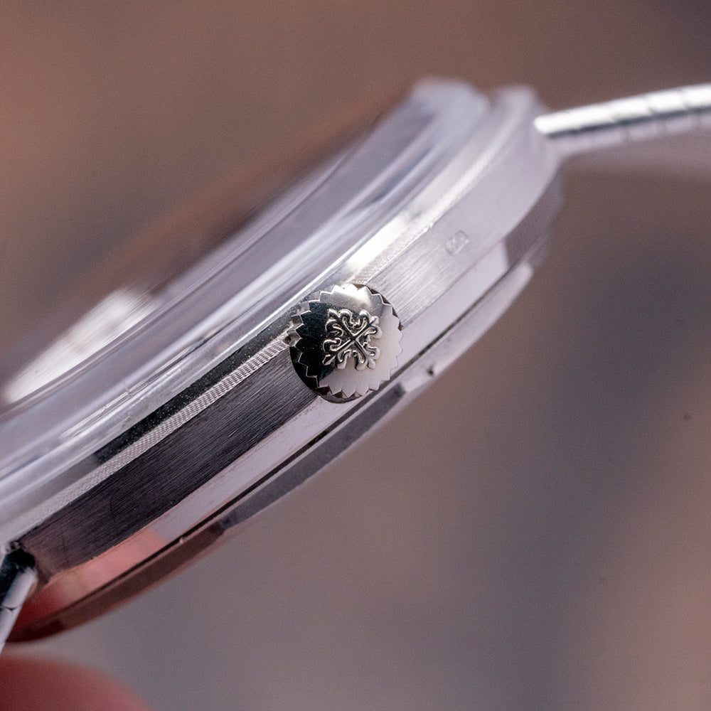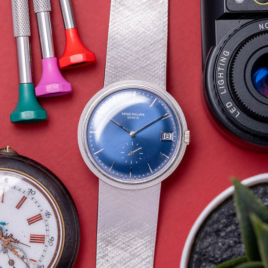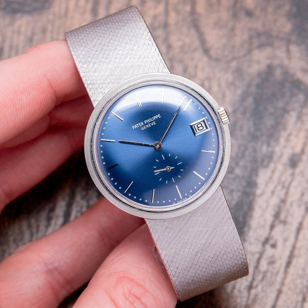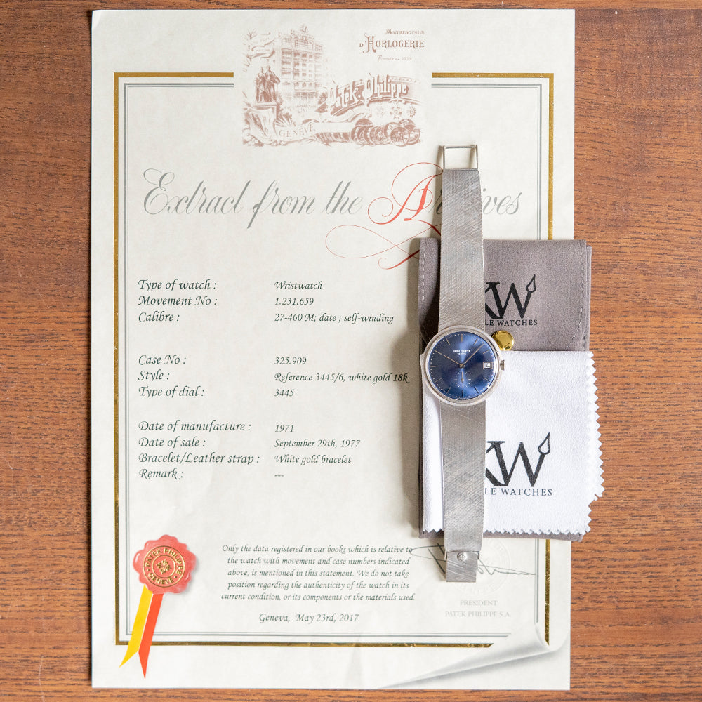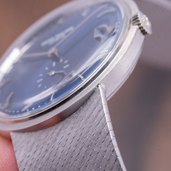 Here we have a rare classic 1971 Patek Philippe Calatrava Blue Sigma Dial White Gold 3445/6 with a beautifully sculpted 35mm 18ct White Gold case that gently flows over your wrist thanks to a smooth snakeskin patterned integrated bracelet. In 1961, Patek Philippe introduced this 3445/6, which was available in four exquisite metal variations: yellow gold, white gold, pink gold, and platinum. Each metal option had its own unique aesthetic, with yellow gold exuding warmth and luxury, white gold offering understated elegance, pink gold showcasing a romantic and timeless appeal, and platinum radiating a cool and sophisticated charm. The lug-to-lug length of 35mm and a case thickness of just 9.5mm ensures a comfortable fit. On the right side is a signed crown recessed into the case for protection. A textured bezel holds a domed crystal above the star of the show, a sunburst Calatrava blue Sigma dial, so named due to the sigma σ from the Greek alphabet at 6 o'clock. The Calatrava dial launched in 1932 was created by David Penney who took inspiration from the Bauhaus movement and its simple functional artistic form. An outer minute track has 18ct White Gold baton indexes marking the hours, at 3 o’clock a framed date window, and elegant 18ct White Gold stick hands complemented by sub-seconds at 6 o’clock that perfectly balance this sophisticated dial, and at 12 o’clock we have the Patek Philippe motif. On the reverse a screw-down case back with the Swiss Hallmarks stamped, inside an automatic Patek Philippe Cal. 27-460M, 30 jewels, beating at 19,800 beats per hour, introduced in 1961 and remained in production until 1986, this high-grade movement is just 5.35mm thick, complete with an 18ct Gold rotor engraved with the Patek Philippe Calatrava Cross and beautifully decorated. The watch comes paired with its full-length integrated 19.5mm 18ct White Gold textured bracelet and a signed folding jewellery clasp, and the watch comes with its Patek Philippe Archive Extract.