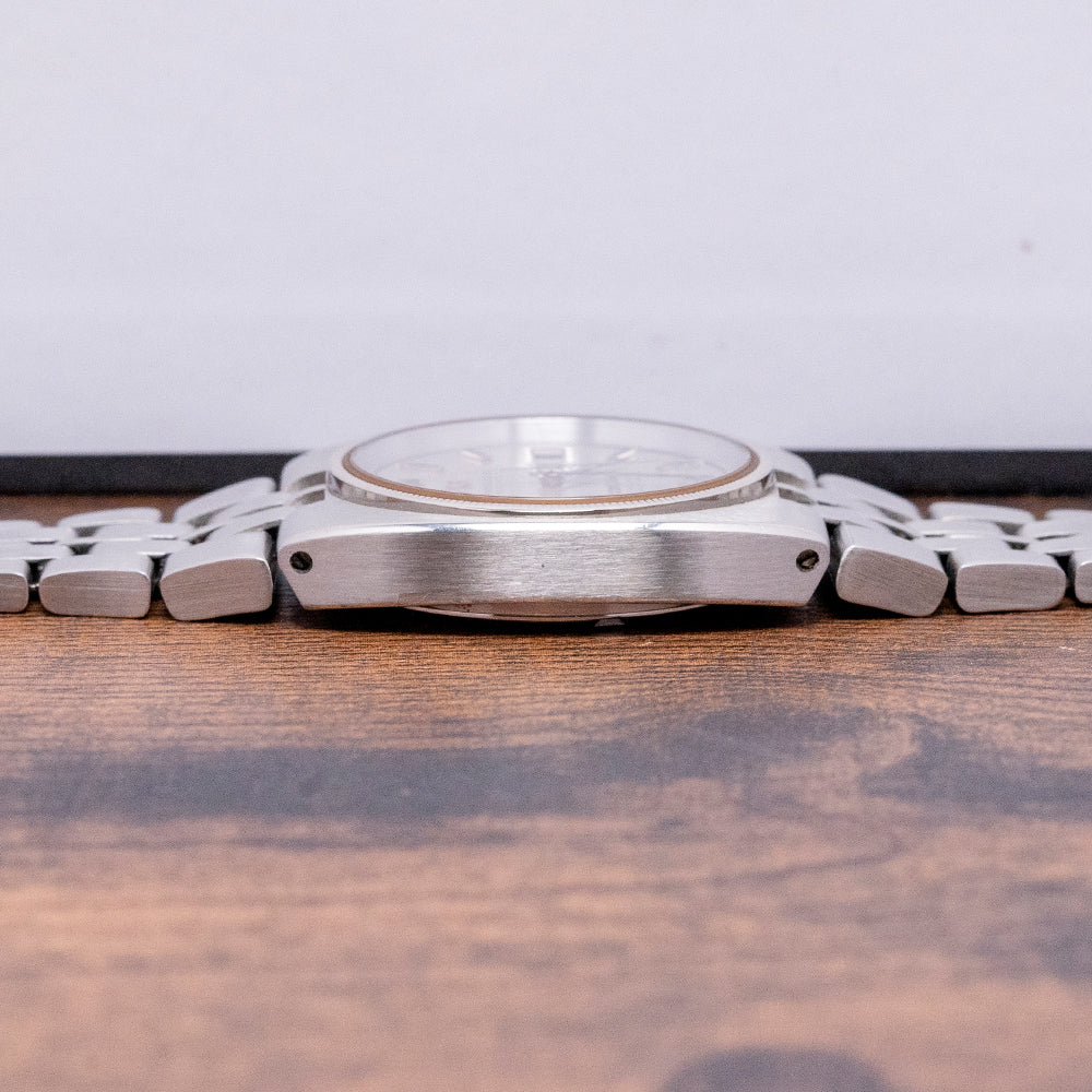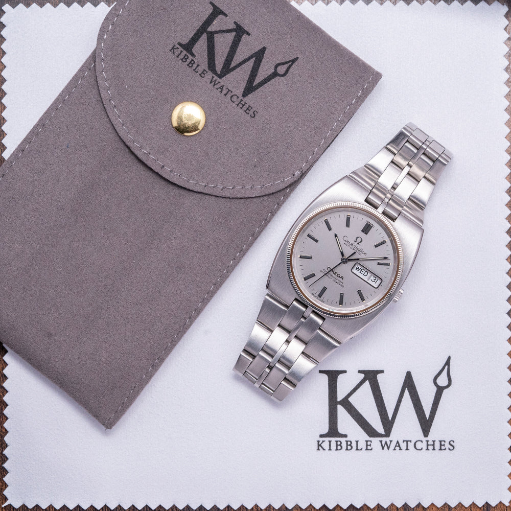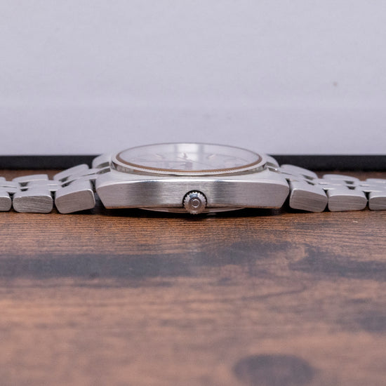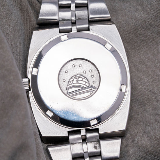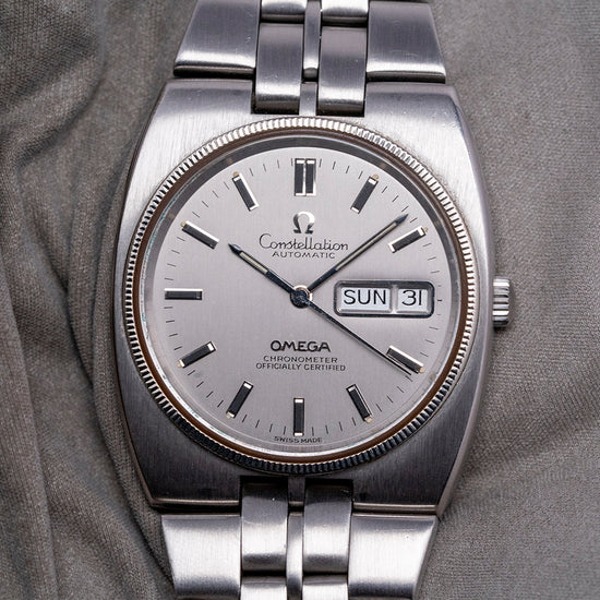 Here we have a classic 1972 Omega Constellation Automatic 168.0054. Omega first introduced the Constellation in 1952. At the time, it was Omega's flagship timepiece. The first models had a Cal. 354 bumper movement in them. Later, in 1955, Omega introduced the Automatic Cal. 50x, followed in 1959 by the Cal.55x (no date) and 56x (date) versions. Many of the Constellations came with pie-pan dials, diamond indexes, and fancy lug configurations. All the gold Constellations of that time have the Observatory of Geneva hand-engraved on the back. The eight stars above the Observatory represent the numerous achievements of Omega in the world Chronometer competition. Celebrating the fact that all Constellations are Chronometer Certified. It features a 36mm stainless steel tonneau-shaped case, satin-brushed, with drilled and screwed lugs on the left side that seamlessly flow into the integrated bracelet; its distinctive design is unapologetically 1970s. The polished chamfered edge creates a sophisticated flank profile, resulting in a lug-to-lug length of 40.5mm and a case thickness of 10mm, ensuring a comfortable fit on your wrist. On the right side sits a signed crown. The white gold fluted bezel holds a domed plexiglass crystal that protects a silver dial. An outer minute track has applied polished baton indexes that mark the hours. Slim sword hands are complemented with a tapered sweeping seconds hand. At 3 o’clock, a framed colour-matched day/date window. At noon, we have an Omega motif, ‘Constellation Automatic,’ printed underneath. At 6 o’clock, an applied Omega, ‘Chronometer Officially Certified’ printed underneath, completes this sophisticated, versatile watch. On the reverse, a screwed-down stainless steel case back features an embossed Observatory and eight stars. Inside, we have an Automatic Omega Cal. 1021, 23 jewels, beating at 28,800 beats per hour, with a quick-set date and quick-set day in the time-setting position that can be adjusted going backwards. It comes paired with its original 26mm integrated Omega stainless steel bracelet, featuring a satin-brushed finish, and a signed folding clasp with micro-adjustments, which will fit wrists up to 7.2 inches. This watch is sold with an original Omega box.