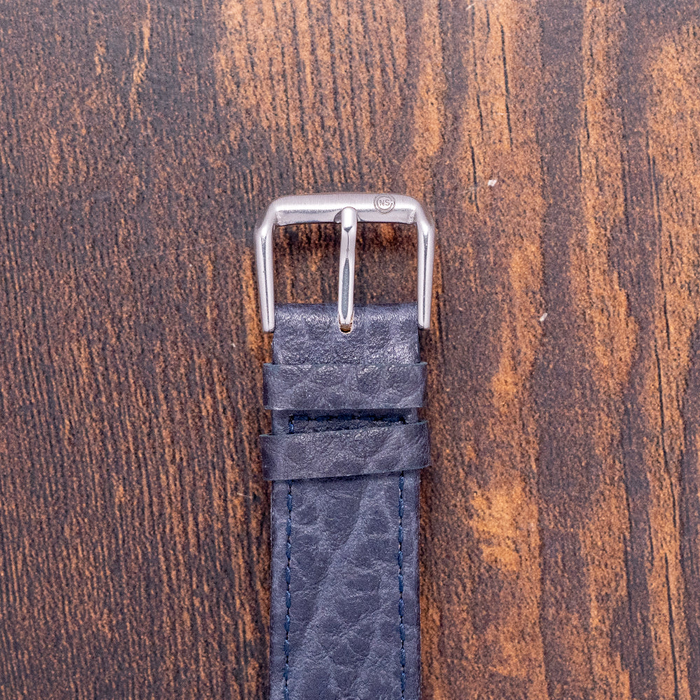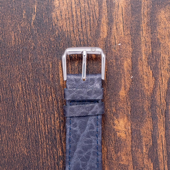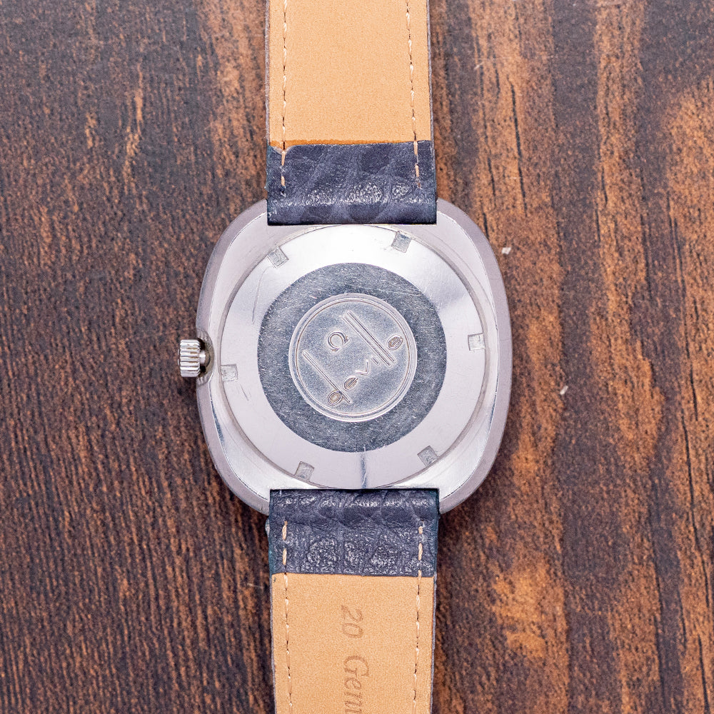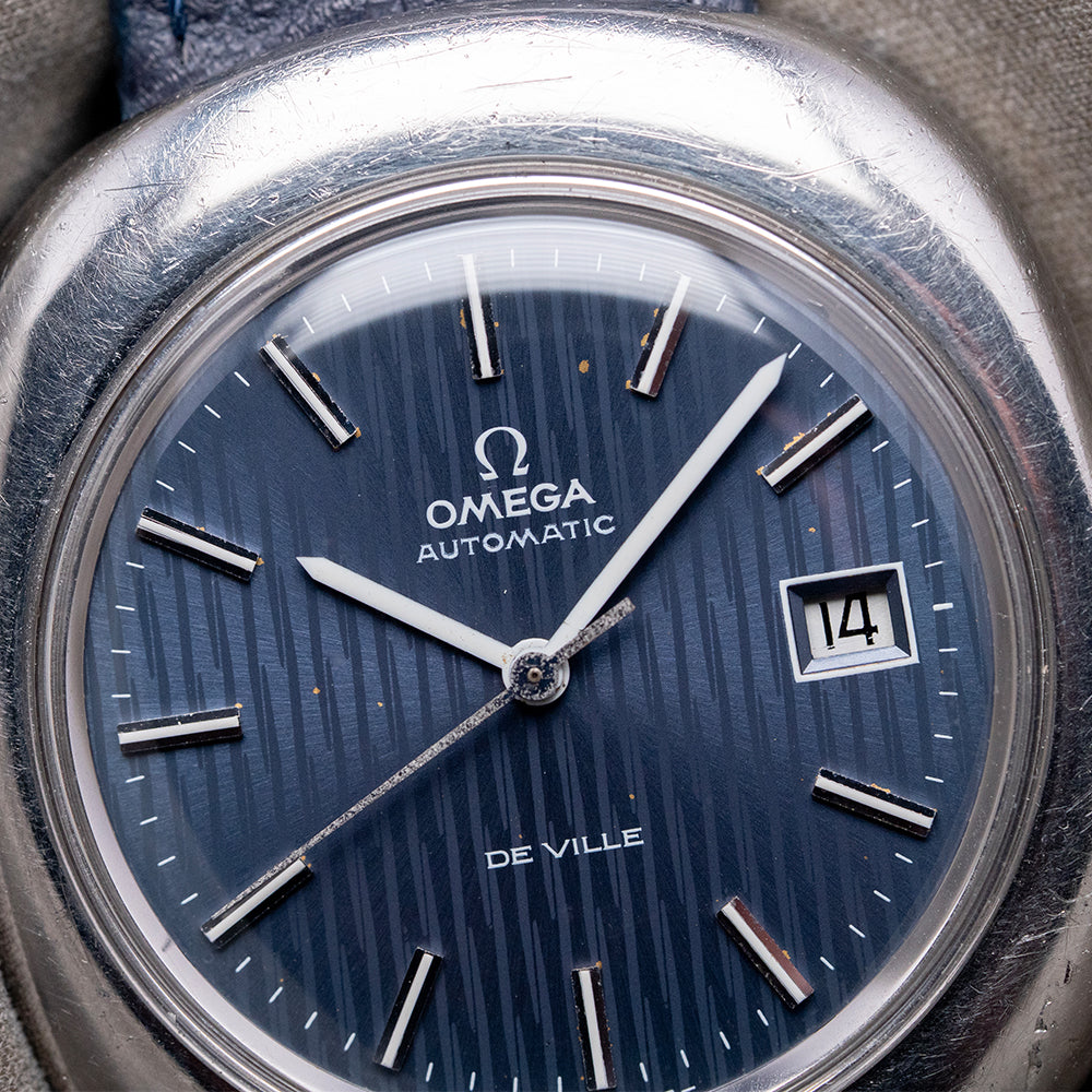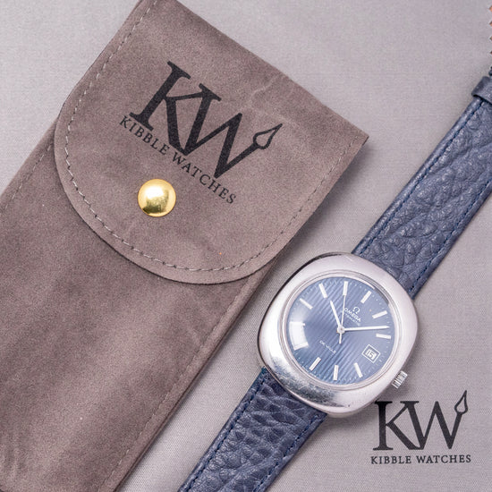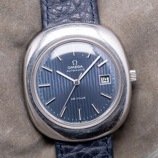 Here we have a rare 1972 Omega De Ville Automatic 'UFO' Pebble 166.155 launched originally as a Japanese special edition for the Japanese market, featuring a 38mm 'UFO' Pebble-shaped stainless steel case that sits comfortably on your wrist with hooded lugs. Its soft, rounded flanks lead to a lug-to-lug length of 42mm and a case thickness of 12mm. On the right side, a signed recessed crown. A domed crystal sits above an attractive, vertically striped, metallic blue bamboo-textured dial. An outer minute track has applied steel baton indexes marking the hours; at 3 o’clock, a framed date window; and slender steel hands are complemented by a tapered, sweeping second hand. At noon, we have the painted Omega Automatic motif, and at 6 o’clock, ‘De Ville’ completes this distinctive dress watch. On the reverse, a screw-down solid case back with De Ville in relief in the centre. Inside an automatic Omega Cal. 1481, 21 jewels, beating at 21,600 beats per hour. It comes paired with a well-suited 20mm leather strap and pin buckle.