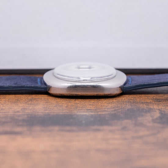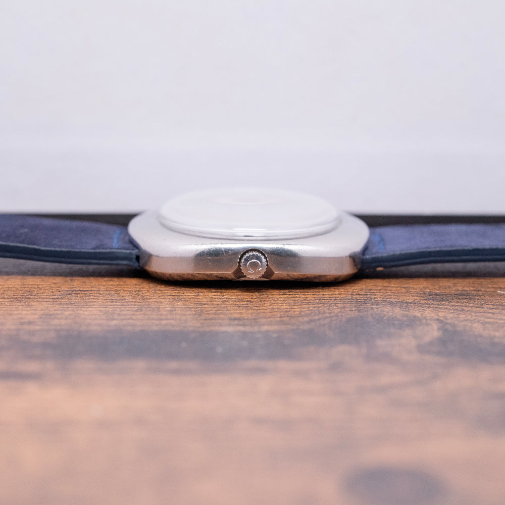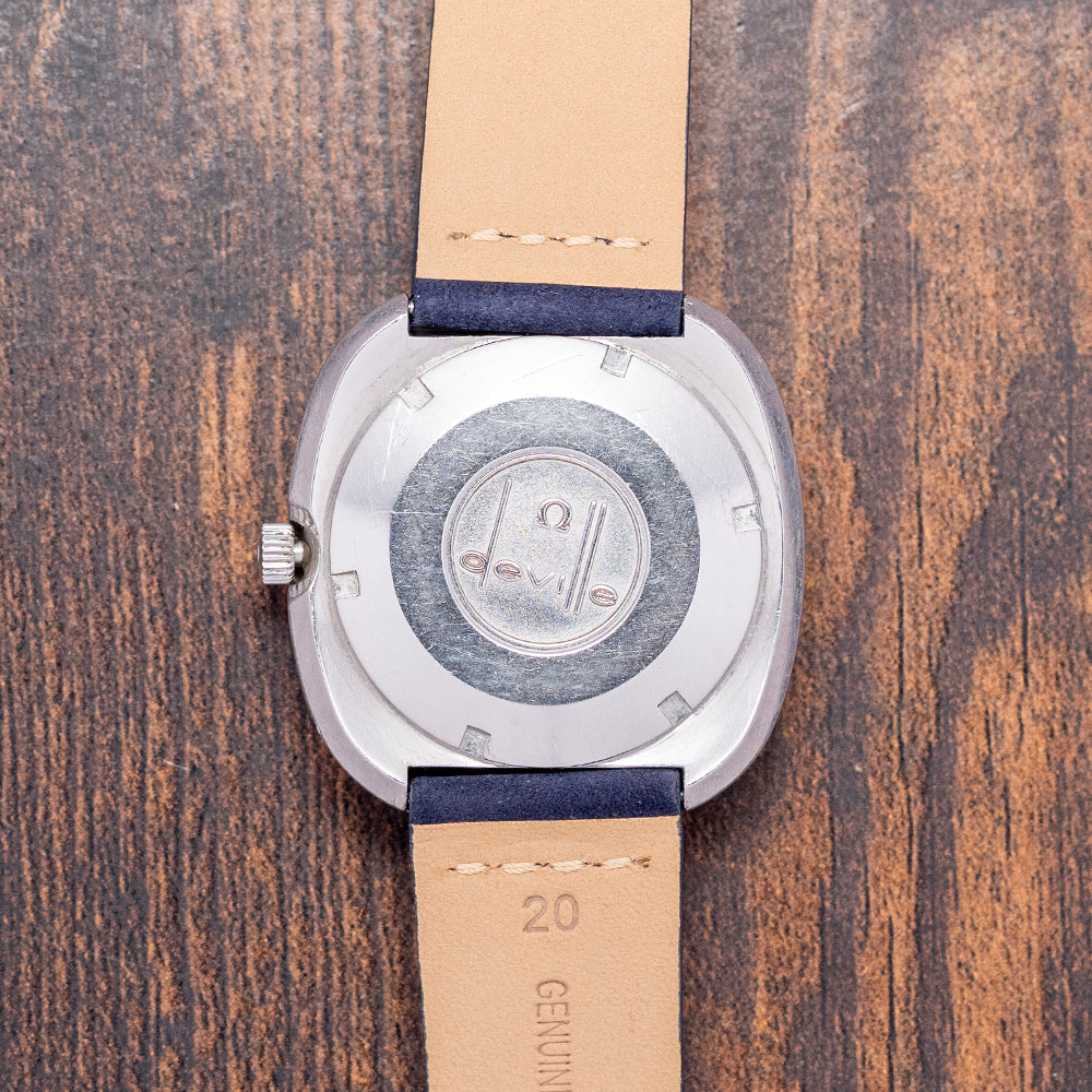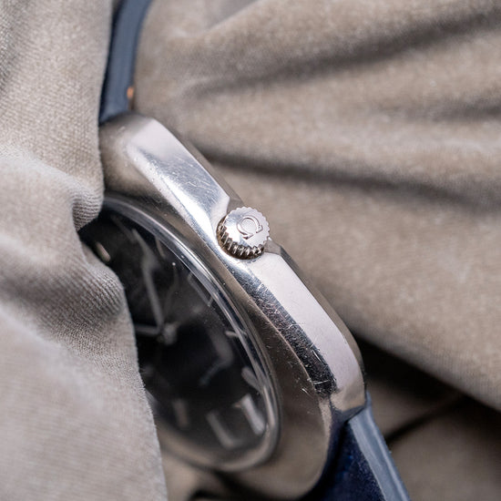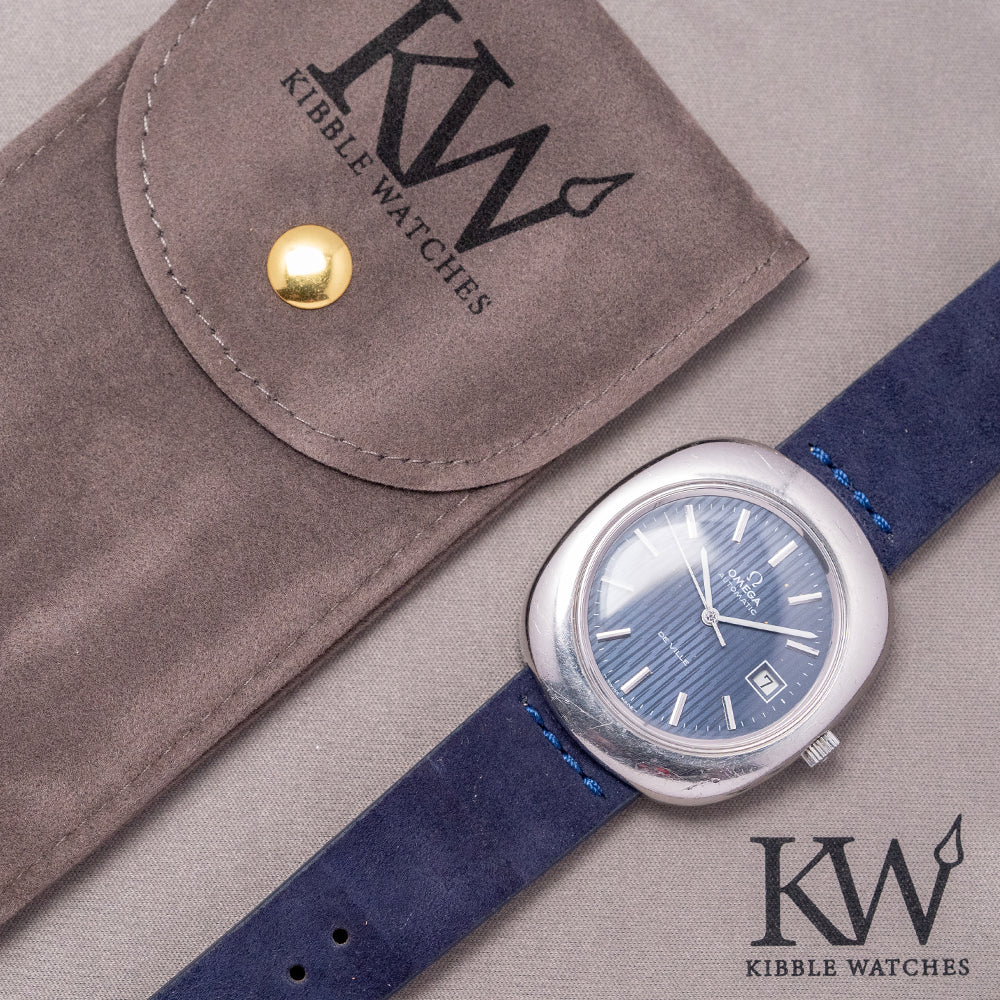Here we have a rare 1972 Omega De Ville Automatic 'UFO' Pebble 166.155 launched originally as a Japanese special edition for the Japanese market, featuring a 38mm 'UFO' Pebble-shaped stainless steel case that sits comfortably on your wrist with hooded lugs. Its soft, rounded flanks lead to a lug-to-lug length of 42mm and a case thickness of 12mm. On the right side, a signed recessed crown. A domed crystal sits above an attractive, vertically striped, metallic blue bamboo-textured dial. An outer minute track has applied steel baton indexes marking the hours; at 3 o’clock, a framed date window; and slender steel hands are complemented by a tapered, sweeping second hand. At noon, we have the painted Omega Automatic motif, and at 6 o’clock, ‘De Ville’ completes this distinctive dress watch. On the reverse, a screw-down solid case back with De Ville in relief in the centre. Inside an automatic Omega Cal. 1481, 21 jewels, beating at 21,600 beats per hour. It comes paired with a well-suited 20mm leather strap and pin buckle.