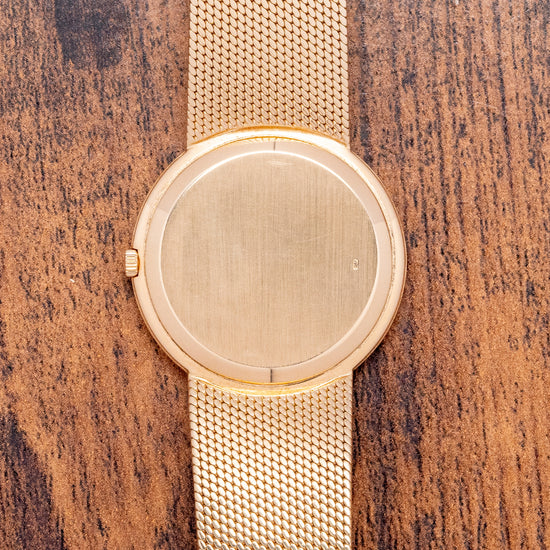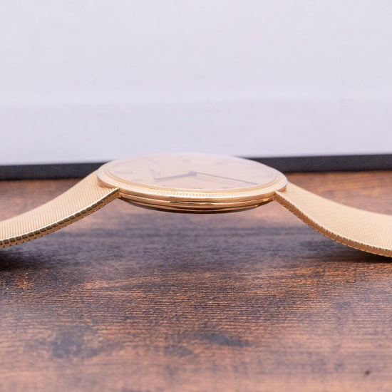 Here we have a classic 1973/4 Patek Philippe Calatrava 18ct Gold Roman Dial 3588/1 with a beautifully sculpted 35mm 18ct Yellow Gold round case that gently flows over your wrist thanks to a smooth patterned integrated bracelet. In 1970, Patek Philippe introduced this 3588/1, remaining in production until 1980. The lug-to-lug length of 35mm and a case thickness of just 6mm ensures a comfortable fit. On the right side is a signed crown recessed into the case for protection. An attractive guilloché hobnail patterned bezel holds a domed crystal above the star of the show, a champagne golden hue dial. The Calatrava dial launched in 1932 was created by David Penney, who took inspiration from the Bauhaus movement and its simple, functional artistic form. Elegant Roman numeral indices mark the hours, slender sword hands sit majestically in the centre, perfectly balancing this sophisticated dial, and at 12 o’clock, we have the Patek Philippe motif. On the reverse, a snap-off case back with the Swiss Hallmarks stamped, inside an Automatic Patek Philippe Cal. 28-255, 36 jewels, beating at 19,800 Beats per hour, based on the JLC 920 ebauche, released in 1967; this incredibly thin movement was never used by JLC but was also supplied to Audemars Piguet and Vacheron Constantin and was a perfect fit for this Calatrava, and later the iconic Patek Philippe Nautilus 3700, complete with a 21ct Gold edged rotor engraved with the Patek Philippe Calatrava Cross and beautifully decorated. The watch comes paired with its intricate flowing integrated 20mm 18ct Yellow Gold smooth patterned bracelet secured by a signed folding jewellery clasp, 197mm bracelet length, and the watch comes with its Patek Philippe presentation box and 2010 Full-Service paperwork.