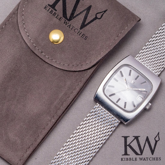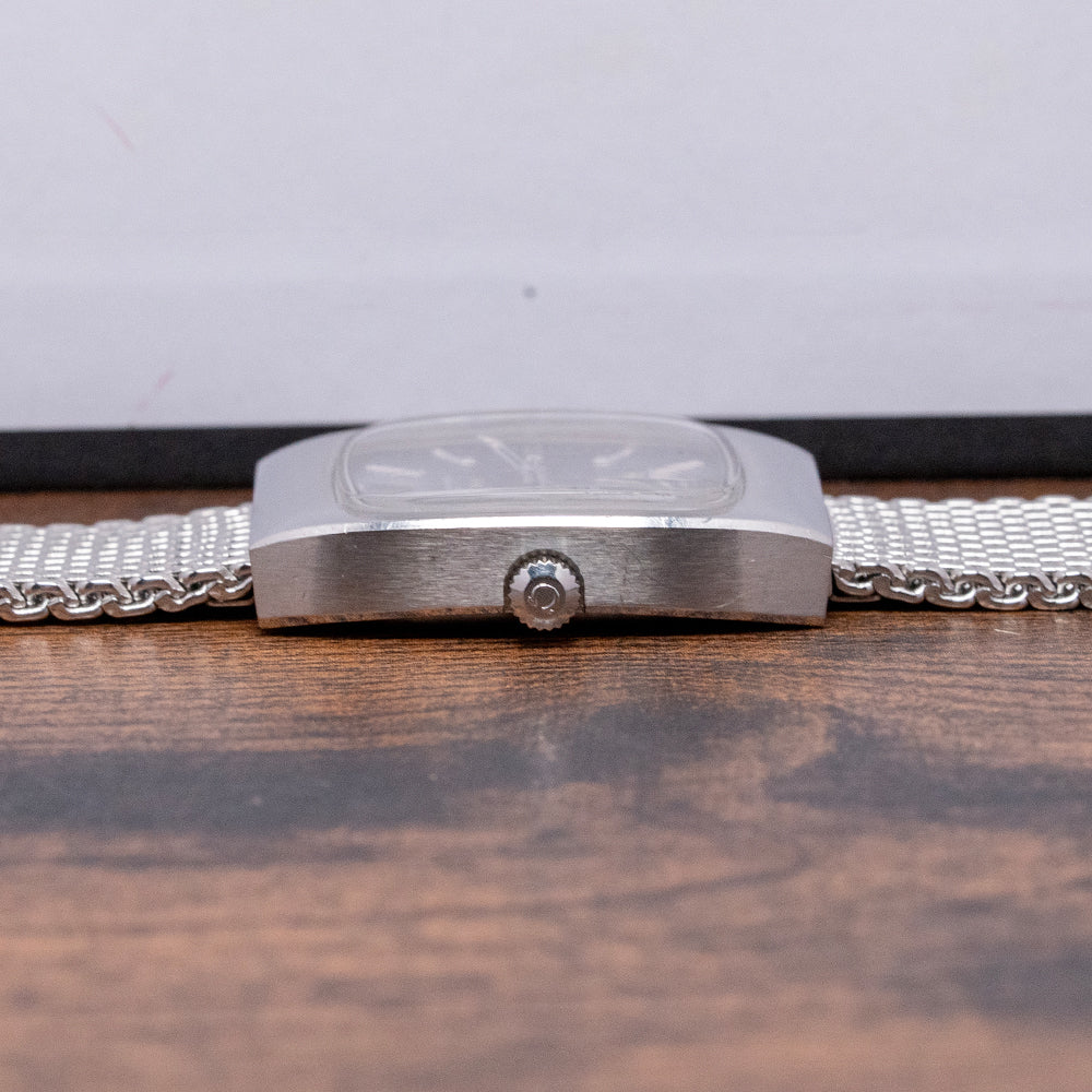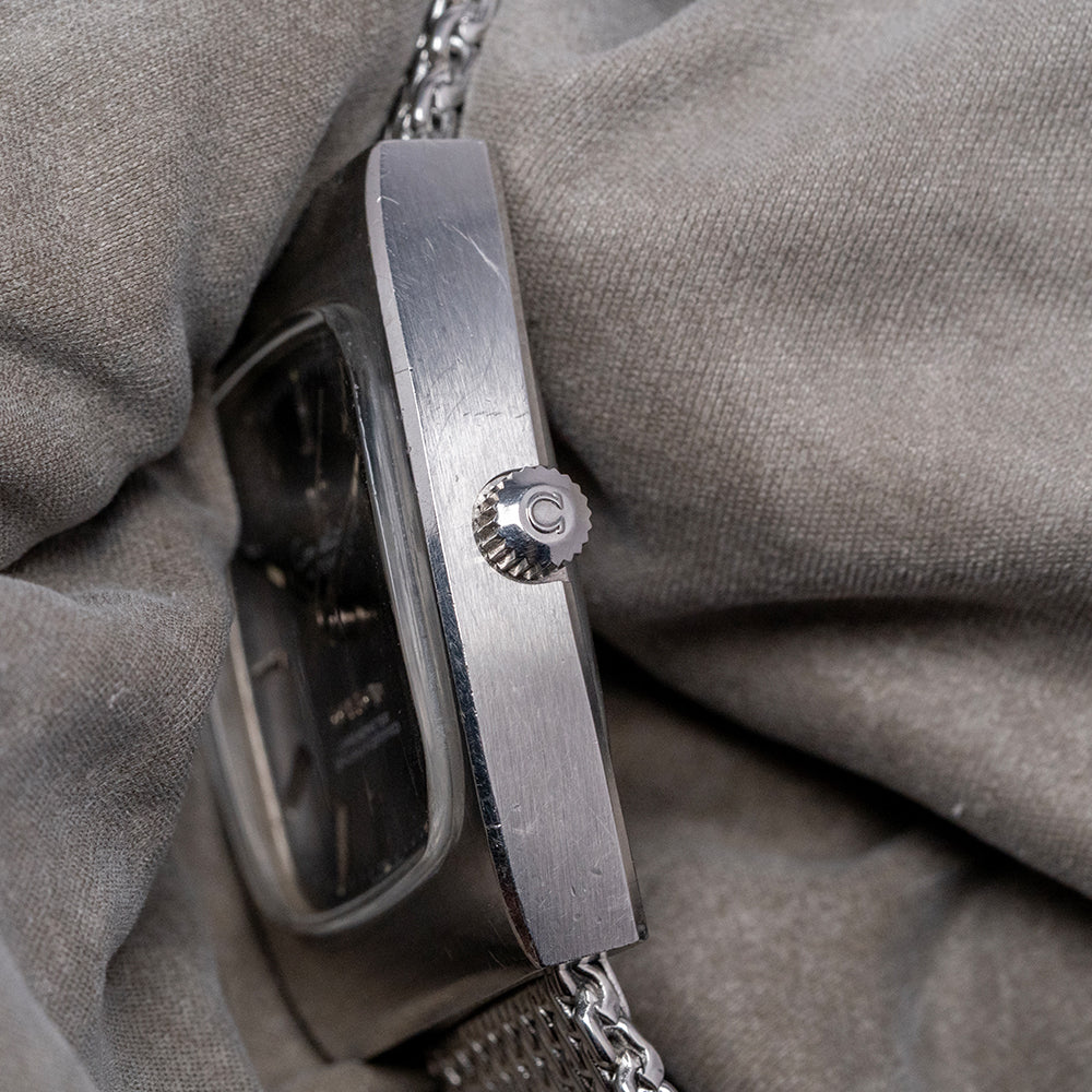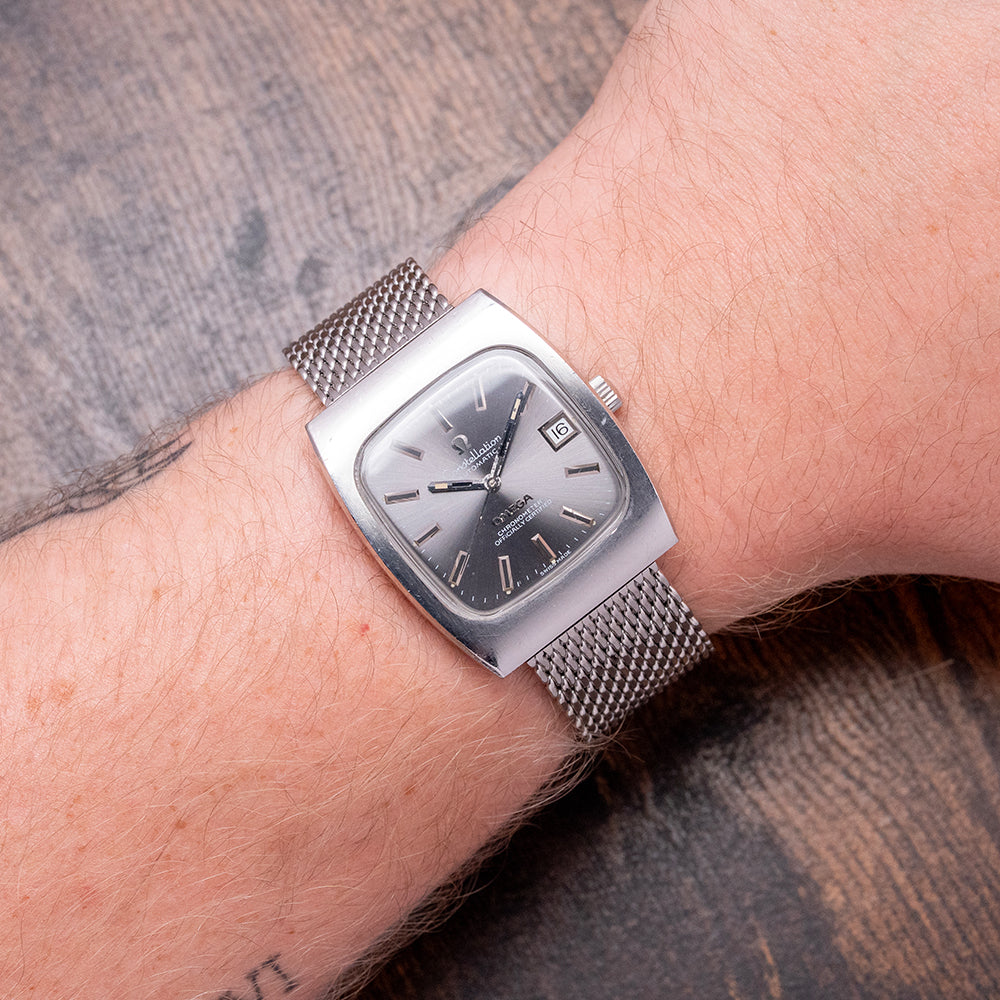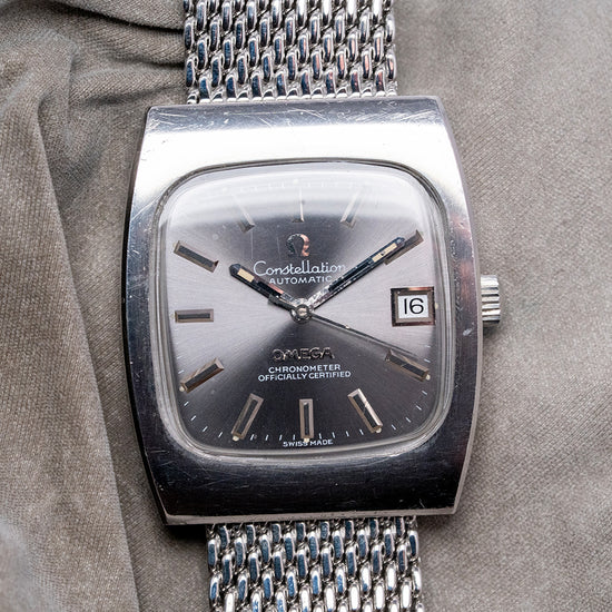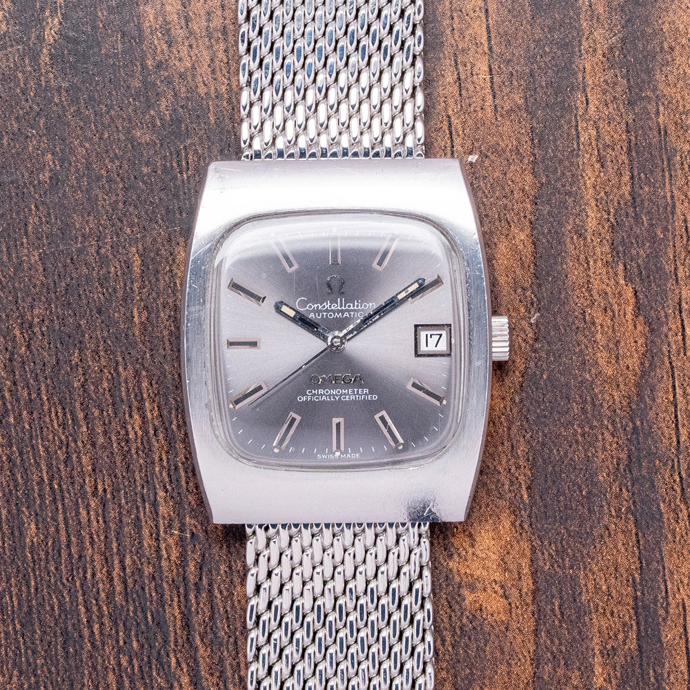 Here we have a rare classic 1973 Omega Constellation 'Chronometer' Auto 33mm 168.0058. Omega first introduced the Constellation in 1952. At the time, it was Omega's flagship timepiece. The first models had a Cal. 354 bumper movement in them. Later, in 1955, Omega introduced the Automatic Cal. 50x, followed in 1959 by the Cal.55x (no date) and 56x (date) versions. Many of the Constellations came with pie-pan dials, diamond indexes, and fancy lug configurations. The eight stars above the Observatory stand for the many exploits of Omega in the world Chronometer competition. Celebrating the fact that all Constellations are Chronometer Certified. Featuring a 33mm stainless steel tonneau-shaped case with hidden lugs that flow into the mesh bracelet, its design is unapologetically 1970s. The curved, seamless flanks lead to a lug-to-lug length of 38.5mm and a case thickness of 9mm, ensuring a comfortable fit on your wrist. On the right side sits a signed crown. The raised flat 1970s TV-shaped crystal protects a sunburst grey dial. The outer minute track features Tritium pips above applied facet-edged baton indexes filled in black to mark the hours. Slim steel stick hands tipped in tritium are complemented with a tapered sweeping seconds hand. At 3 o’clock, a framed date window. At noon, we have Omega, “Constellation Automatic,” printed underneath, and at 6 o’clock, an applied Omega motif, "Chronometer Officially Certified". On the reverse, a screwed-down solid case back features an embossed Geneva Observatory and eight stars. Inside, we find an Automatic Omega Cal. 1012, with 23 jewels and a frequency of 28,800 beats per hour. It has a quick-set date and hacking seconds for your convenience, produced from 1972 to 1984. It comes paired with its 20mm generic mesh bracelet secured by a folding clasp.