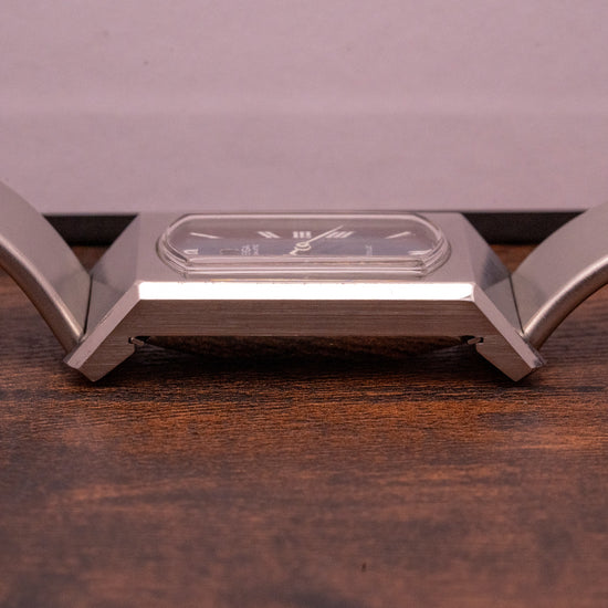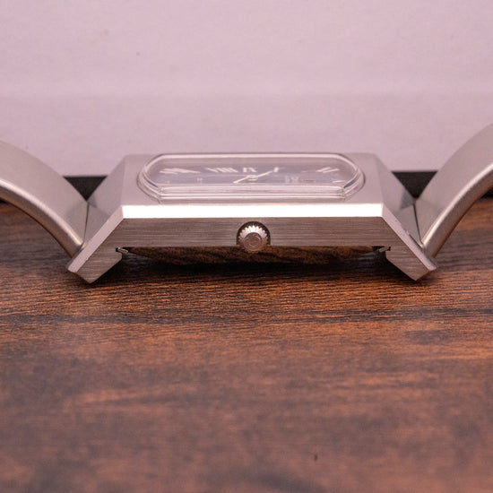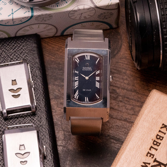 Here we have a 1973 Omega De Ville Automatic Rare Oversized Blue 155.006 with a 27mm tank-shaped stainless steel case that comfortably sits on your wrist with chamfered angled covered lugs, a lug-to-lug length of 50mm and a case thickness of 10.5mm sits on that sweet spot of wrist ergonomics. On the right side is a recessed signed push/pull crown. Brushed and unpolished surfaces flow over the chamfered edges for a very distinctive look, a rectangular-shaped crystal has bevel edges and a rounded top and bottom sitting above a striking electric blue dial which has a bleeding patina around the edges showing a shade of dark purple. Elegant printed white Roman numerals radiate around the edge expanding in size towards the corners, curvaceous leaf hands hit their mark on this sophisticated two-hand dial. At 12 o’clock we have the applied Omega motif “Automatic” printed underneath and at 6 o’clock “De Ville”. On the reverse, case back with “De Ville” embossed in the centre, inside an automatic Omega Cal. 684, 24 jewels, beating at 21,600 beats per hour. The watch comes paired with an interesting Omega bangle-style solid stainless steel bracelet with a signed folding clasp.