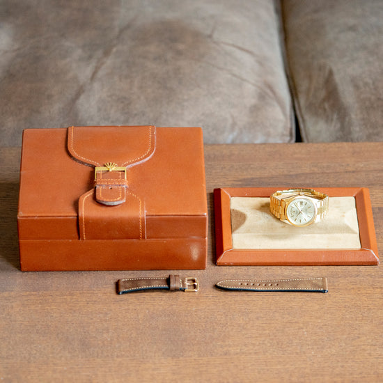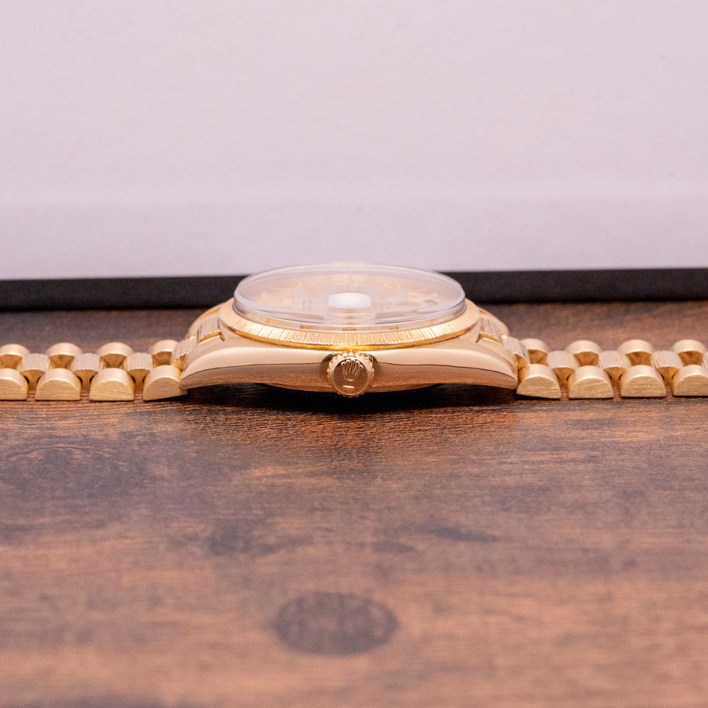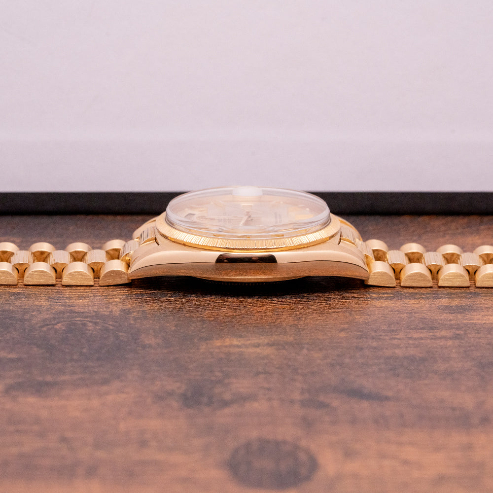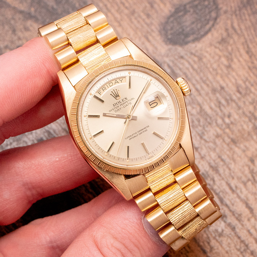 There will forever be something mesmerising and alluring about a Rolex Day-Date, whether it be the fact it's all gold, the weight, the design or the overall fit and feel, they are perfection on and off the wrist! This "Bark" finish 1807 elevates that for me personally, for a small premium on a non-bark model I feel this is worth every penny! Plus, if this feels too flashy on the bracelet, a nice brown strap instead tones it right down and makes it perfectly wearable for those who don't want all gold on their wrist.