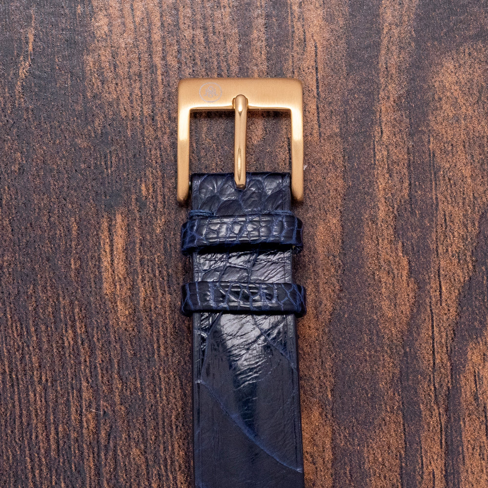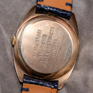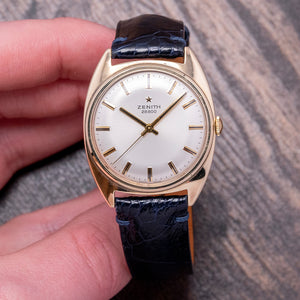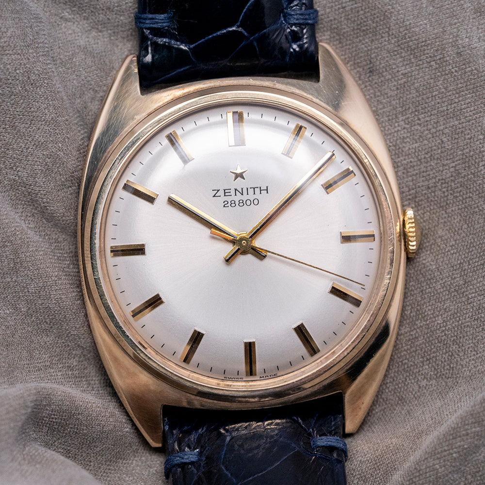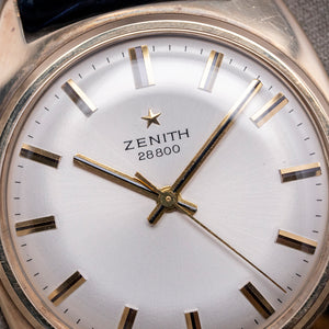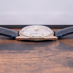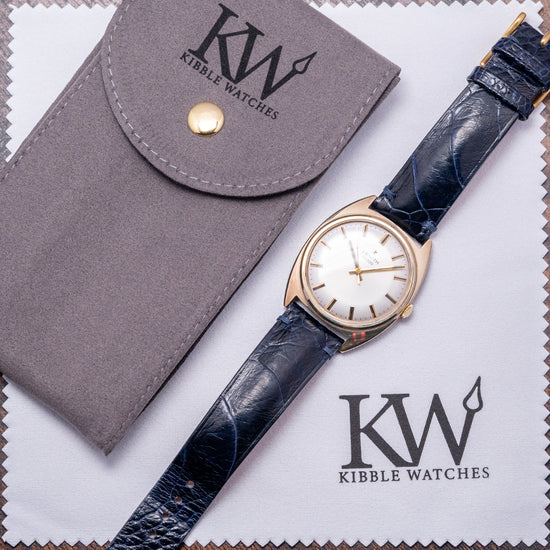 Here we have a classic 1973 Zenith 28,800 9ct Gold Presentation Watch that has a 33mm 9ct Yellow Gold C-shaped case. The curve of the case leads your eye to the stubby, flat-ended lugs. A lug-to-lug length of 39.5mm and a thickness of 9mm ensures a comfortable fit on your wrist. A slim bezel holds a domed crystal above a white dial. An outer minute track has applied baton indexes with chamfered edges, gold accents and black-painted centres. Slender sword hands have the same gold and black combination for a sophisticated yet simple design. A tapered sweeping second hand completes the dial. The text is minimalist with the applied gold Zenith star and “Zenith 28800” printed underneath at 12 o’clock. On the reverse, a snap-off case back with the inscription “M. Guernari 1950-1975 Moler Products Limited” was engraved into it. Moler Products, based in Hythe near Colchester, produced Moler bricks used in industry to line hot surfaces in furnaces and kilns. The company was founded in 1919 and dissolved in the 1970s. Inside, we have a Manually Wound Zenith Cal. 2562 C, 17 jewels, 28,800 beats per hour. The watch comes fitted on an 18mm Strap Tailor leather strap.