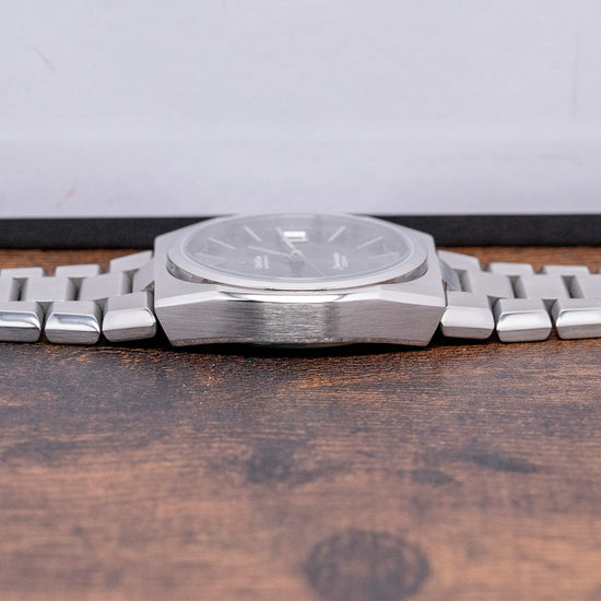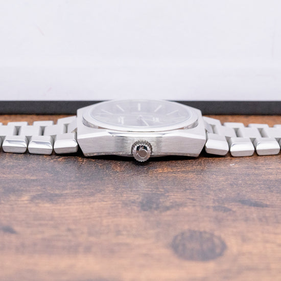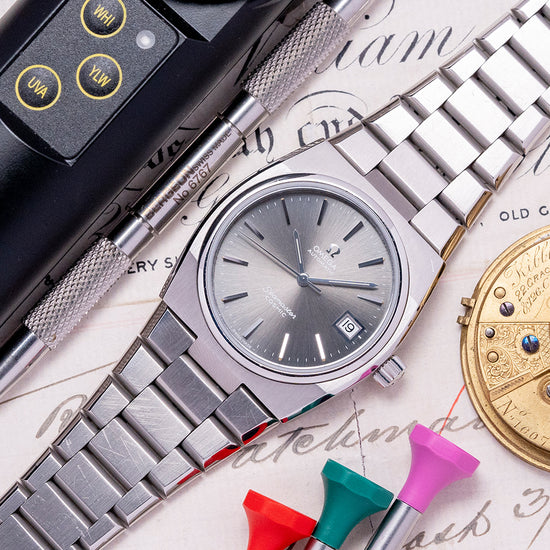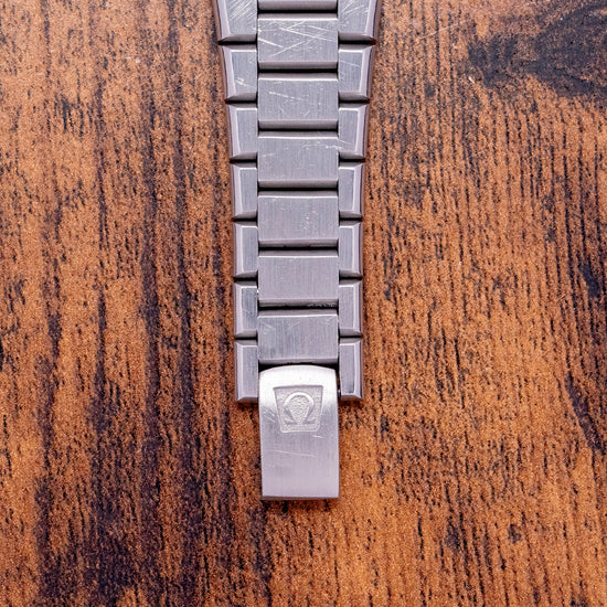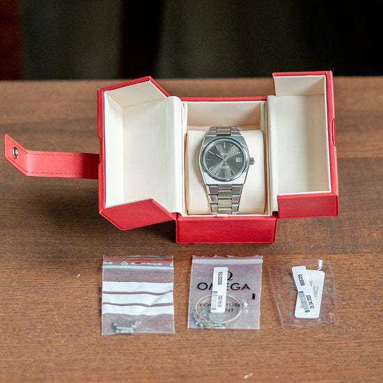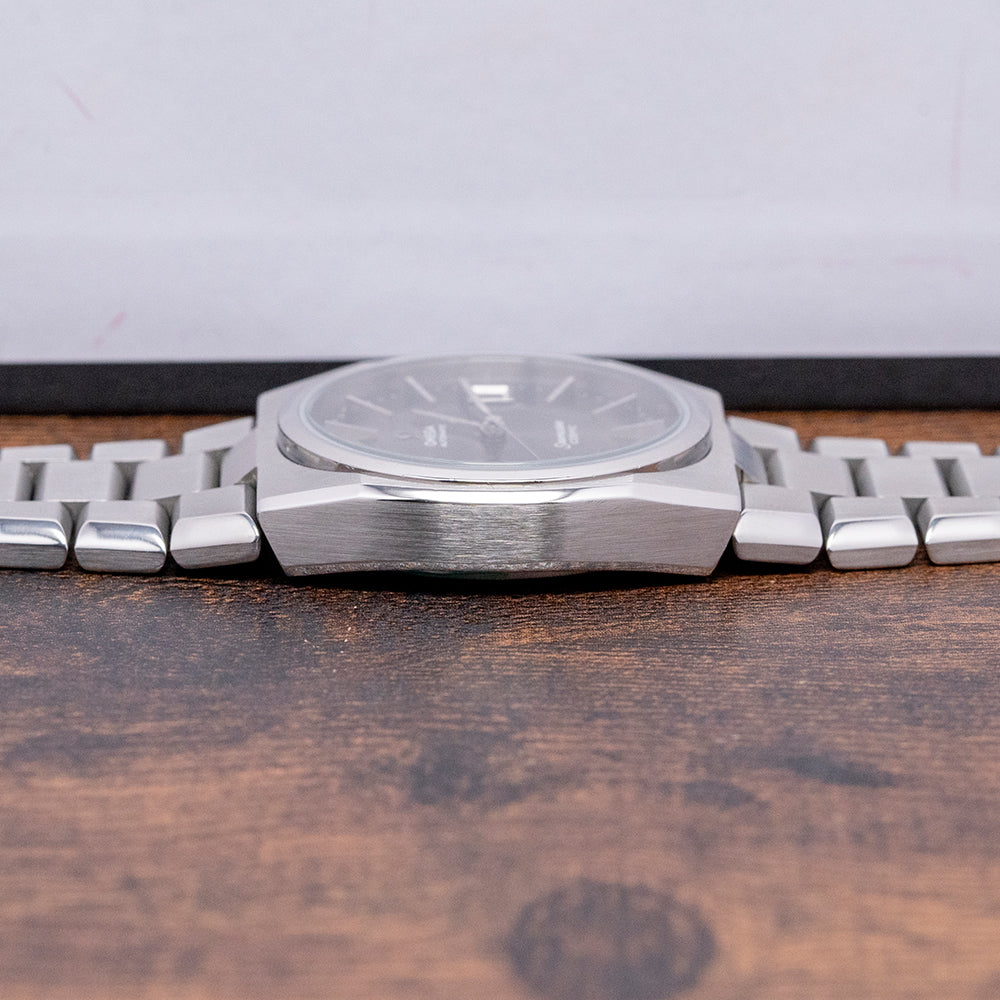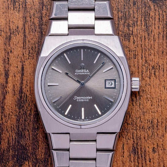 Here we have a 1974 Omega Seamaster Cosmic 166.0195 that has a 37mm stainless steel tonneau-shaped case polished and brushed finished with integrated lugs that fit the integrated bracelet perfectly, a lug-to-lug length of 41.5mm and a case thickness of just 9mm, giving the watch an impressive wrist presence. On the right side sits a signed crown; the polished bezel holds a raised acrylic crystal, protecting a stunning sunburst anthracite grey dial. The applied baton indexes have a lume pip indicating the hours, at 3 o’clock, a framed date window, and elegant slim Service sword hands with LumiNova infill complemented by a needle-sweeping seconds hand. At 12 o’clock, we have an applied Omega, with Automatic printed underneath, and at 6 o’clock, “Seamaster Cosmic ''. On the reverse, a pressure-fit case back with the embossed Hippocampus along with Seamaster, the seahorse on the case back represents Neptune, the God of the sea. Pierre Borie conceived it after seeing a picture of Neptune riding a chariot pulled by seahorses, which is why the seahorses are wearing a bridle. Inside, we have an automatic Omega Cal. 1012, 23 jewels, 28,800 beats per hour, and hacking and quick set-date functions for your convenience. Fitted on its original chunky integrated Omega bracelet with a satin-brushed finish and a signed folding jewellery clasp, the watch comes with an Omega Service box.
