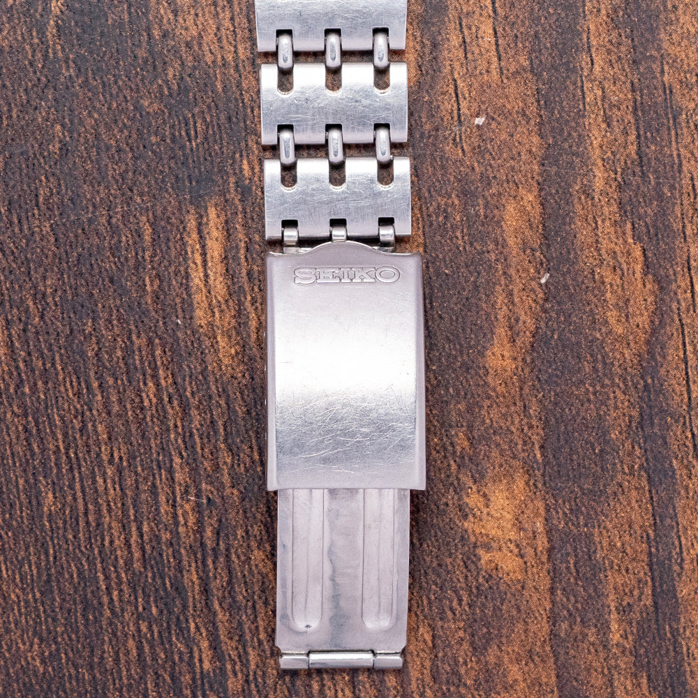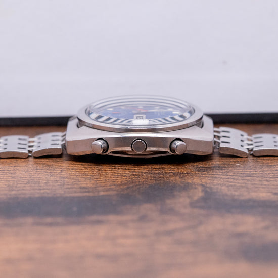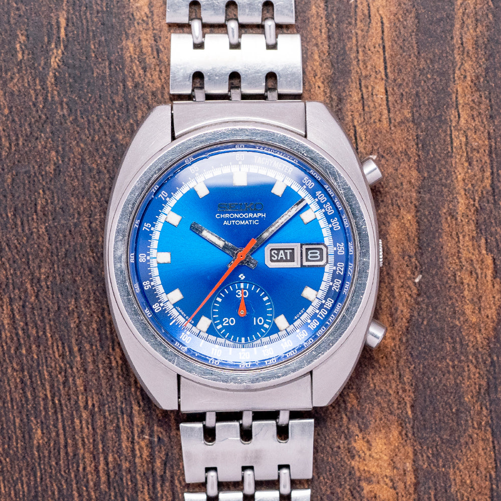 Here we have a 1974 Seiko Automatic Chronograph 'Bruce Lee' Blue 6139-6012. The 6139-6010 black dial variant was often seen on the wrist of the martial arts master and actor Bruce Lee in the 1970s. In May 1969, Seiko introduced the 6139, one of the world's first automatic chronographs, alongside the Zenith El Primero, which launched that year. Featuring a ‘C’ shaped stainless steel cushion case that sits comfortably on your wrist with tapered, flat-ended drilled lugs. Its broad flanks have a chamfered edge flowing across the case towards a lug-to-lug length of 43mm and a case thickness of 13mm. On the right, we have the chronograph pushers and a recessed crown in the centre. A smooth chamfered-edged bezel holds a domed crystal above a vibrant sunburst cobalt blue dial. An outer Tachymetre scale chapter ring surrounds a white minute track, precisely executed above lumed blocks marking the hours. At 3 o’clock, a framed Day/Date window. To change the day, push the crown all the way in; to change the date, push it in slightly. Steel baton hands filled with lume are complemented by a tapered red chronograph hand, and at 6 o’clock, a recessed 30-minute register. At noon, we have the applied Seiko motif with ‘Chronograph Automatic’ printed underneath. On the reverse, a screw-down solid case back is engraved with the watch details. Inside an automatic Seiko Cal. 6139, 17 jewels, beating at 21,600 beats per hour. Featuring a column wheel, vertical clutch and a quick-set date. Designed at the Suwa factory by Toshihiko Ohki. It comes paired with its original 19mm Seiko stainless steel bracelet and signed folding clasp and will fit up to a 7-inch wrist.