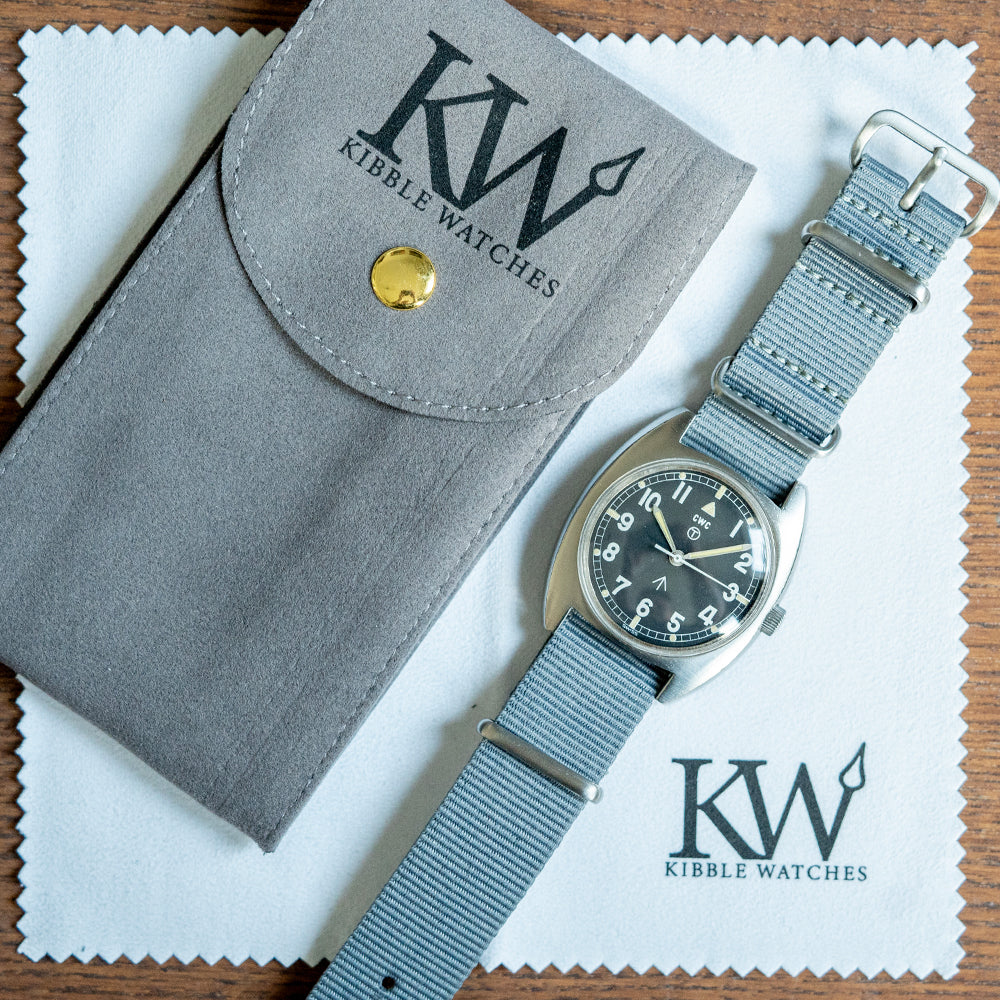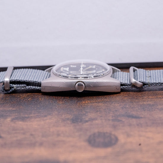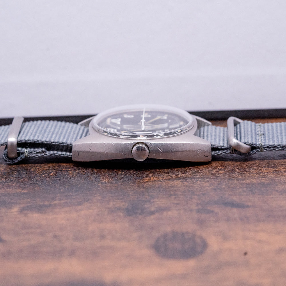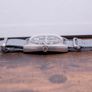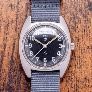Here we have the "1975" CWC W10 Military / Hamilton W10 Case from 1975. It is a 35mm tonneau Monocoque (monocoque in French means hull or single shell) stainless steel cushion case with a curve that ends with stubby flat-ended lugs and the characteristic fixed spring bars perfect for NATO straps, and a lug-to-lug length of 41mm and a case thickness of 10mm ensure a comfortable fit on your wrist. On the right side is a recessed coin-edged crown. A slim, smooth bezel holds a domed crystal and sits above a matte black dial. The outer minute track has Tritium lumed batons and pips at the hours, with Arabic numerals marking the hours. Long sword hands coated in lume are complemented by a tapered second hand. Text is minimal with “CWC” and a “T” in a circle, indicating the lume is Tritium. The Broad Arrow {pheon} has been used to mark the government's or Crown's property since the 17th century, sitting at the 6 o’clock position, signifying its Military DNA. On the reverse a case back with the reference codes: W10 British Army. The 13-digit number is the NATO Stock Number (NSN). 66 refers to Instruments and Laboratory equipment, and 45 refines that to Time Measuring Instruments. The following 9-digit number makes up the NATO Item Identification Number (NIIN). 523-8290 refers specifically to the manually wound-powered general service issue watch. The final two digits refer to the date of issue, this one was issued in 1975. Inside is a manually wound ETA 2750, 17 jewels, beating at 21,600 beats per hour. The watch comes paired with a well-suited 19mm NATO strap and pin buckle.