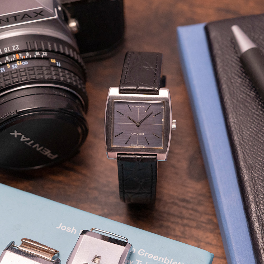 Here we have a 1975 Longines Conquest Cal. L847.3 with a 30mm Square Case that has chamfered edges leading to stubby flat-ended lugs, the slim profile and sloping sides of the case lead to a lug-to-lug length of 32.5mm and a case thickness of only 6.5mm ensures a comfortable fit on your wrist. On the right side is a signed push/pull crown. A square acrylic crystal sits above a horizontal brushed textured Blue Crosshair Dial with applied steel slim baton indexes marking the hours. Elegant steel baton hands perfectly balance this sophisticated vintage dress watch. At 12 o’clock we have the Longines motif and at 6 o’clock “Conquest”, this line of sporty dress watches was first introduced in 1954. On the reverse a snap-off case back, inside a manually wound Longines Cal. L847.3, 17 jewels, beating at 21,600 beats per hour. The watch comes paired with its Longines leather strap and Longines buckle.