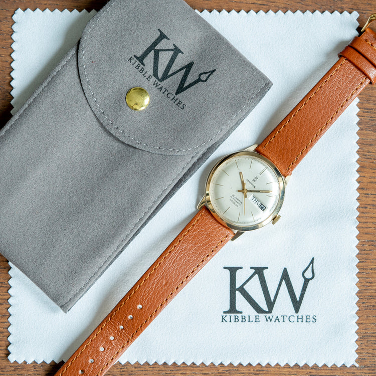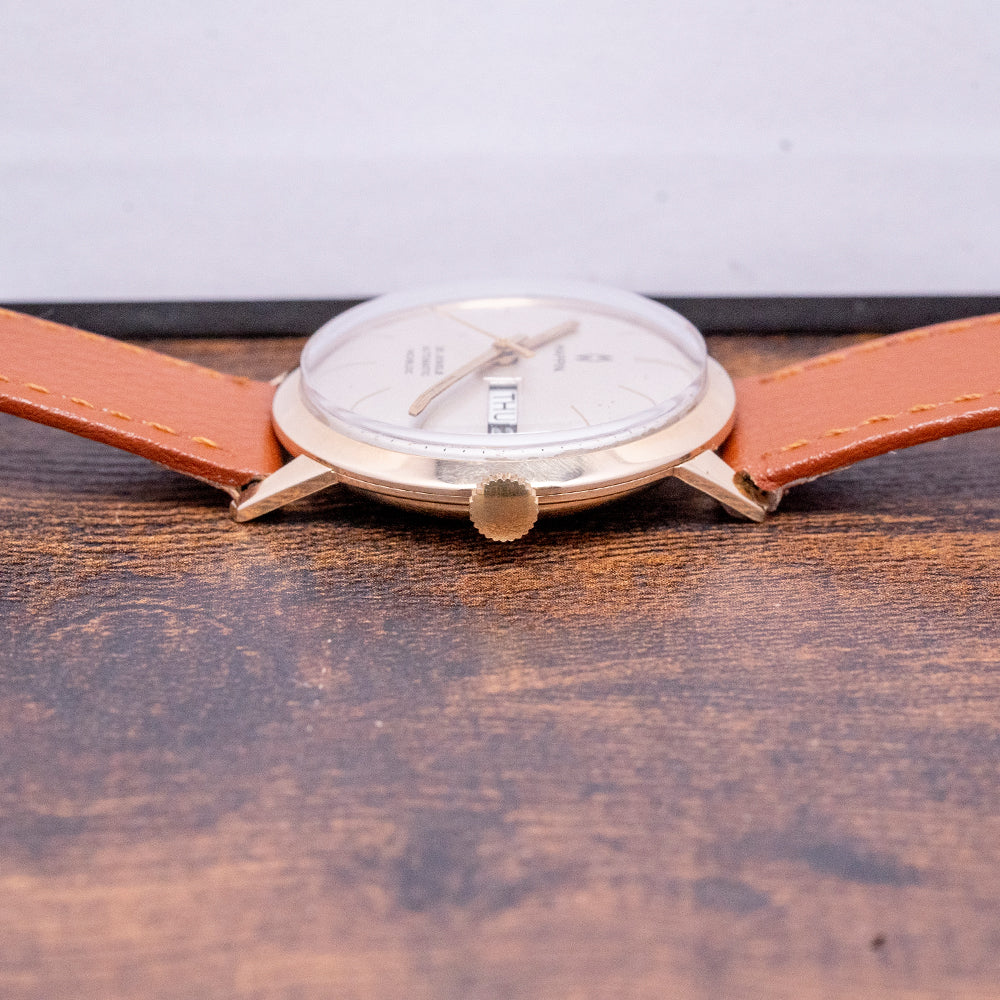 Here we have a 1975 Mappin Day/Date Automatic ETA 2789 with a curvaceous 34mm 9ct Yellow Gold case, elegant tapered lugs lead to a lug-to-lug length of 39mm and a case thickness of 10mm, ensuring a comfortable fit on your wrist. On the right side is a coin-edged crown. The slim, smooth bezel holds a domed crystal above a domed white dial, an outer minute track surrounds gold stick indices marking the hours; at 3 o’clock, a day/date window, gold baton hands tipped with Tritium are complemented by a tapered second hand. At 12 o’clock, we have the Mappin motif, and at 6 o’clock, “25 Jewels Automatic Incabloc” completes this sophisticated dress watch. On the reverse, a 9ct yellow gold snap-off case back, inside an automatic ETA Cal. 2789, 17 jewels, beating at 21,600 beats per hour, this quality movement released in 1969 until 1976 has a quick-set day/date. The watch comes paired with a well-suited aftermarket 18mm leather strap and pin buckle.