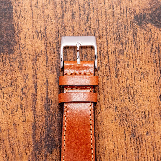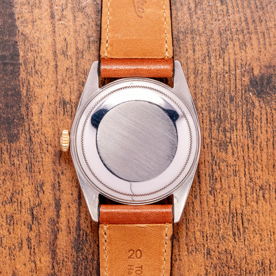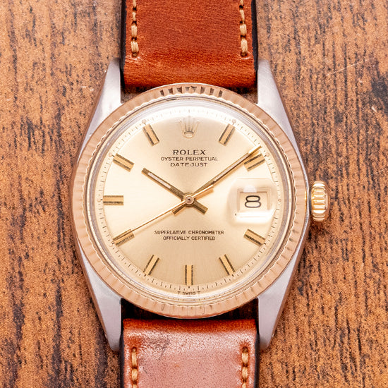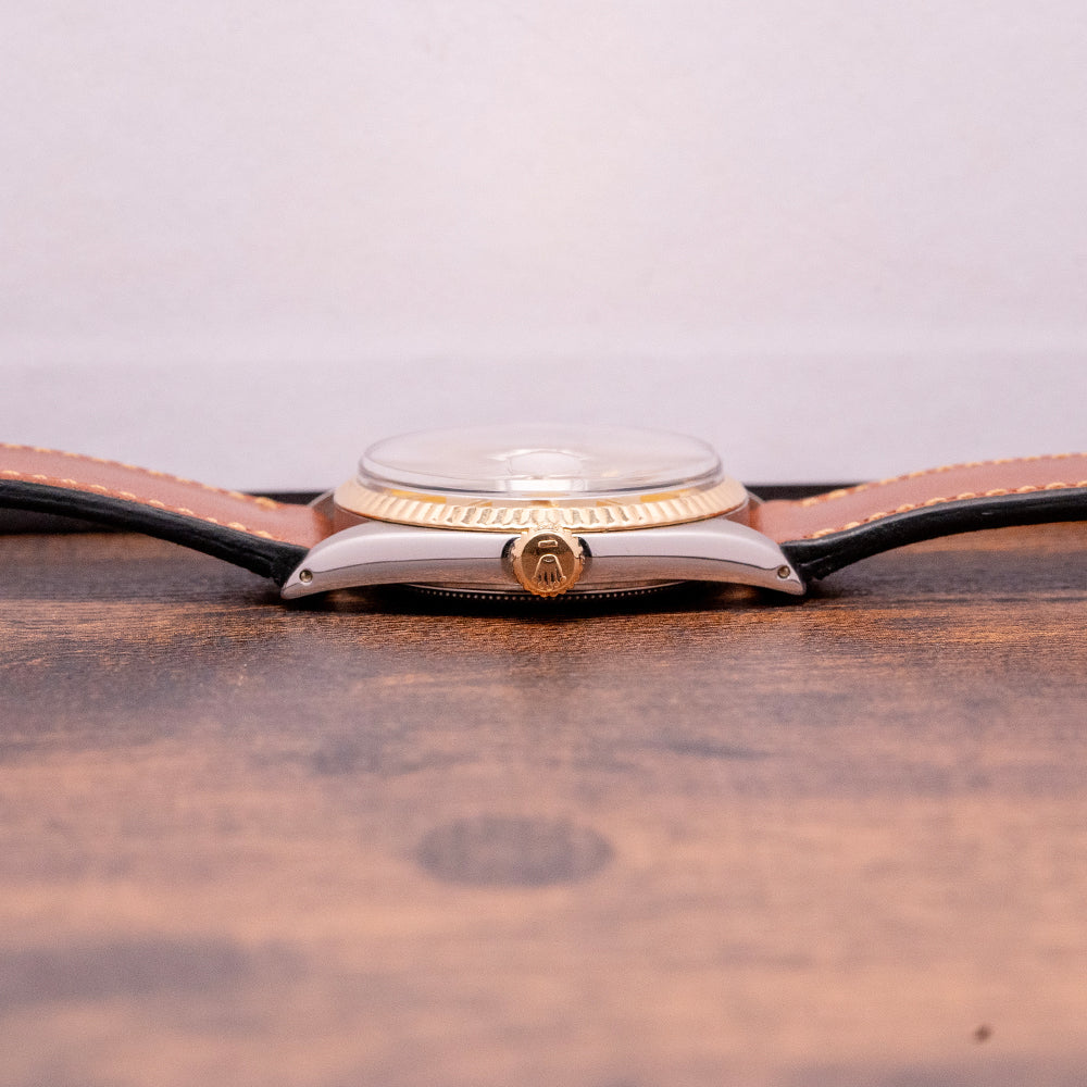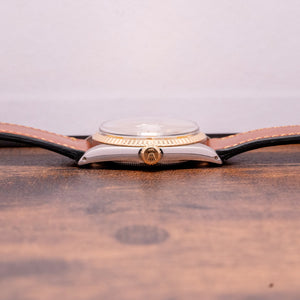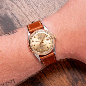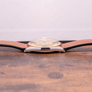 Here we have a 1975 Rolex Datejust Steel & 18ct Yellow Gold Champagne Dial 1601 with a curvaceous 36mm stainless steel Oyster case that curves in all the right places, and the tapered drilled lugs make strap changing a breeze. Rolex introduced the Datejust in 1945 to commemorate the company’s 40th anniversary. The Rolex Datejust first appeared as the reference 4467, and upon its initial release, it was only available in solid 18k yellow gold. It wasn’t until the 1950s, with the introduction of the reference 5030 and reference 5031 Datejust, that stainless steel and Rolesor (two-tone) versions became available, and the “Datejust” name started to appear on the dial. A 43mm lug-to-lug length and a case thickness of 11.5mm will ensure a comfortable fit on your wrist, polished and brushed surfaces transition with crisp lines. On the right side, a large 18ct yellow gold signed screw-down crown, making adjustments hassle-free. An 18ct Yellow gold-fluted bezel supports a flat acrylic crystal that sits proudly above the bezel. The stunning sunburst Champagne dial has an outer minute chapter ring with Tritium pips surrounding applied gold baton indexes filled with Tritium to mark the hours. Long Gold baton Service hands are complemented by a Gold tapered centre second hand. At 3 o’clock, there is a date window with Cyclops magnification above the crystal. At noon, we have the Rolex coronet “Oyster Perpetual Datejust”, and at 6 o’clock “, Superlative Chronometer Officially Certified “ completes this striking vintage timepiece. On the reverse, a coin-edged screw-down case back, inside an automatic Rolex Cal.1570, 26 jewels, 19,800 beats per hour. The watch comes paired with a well-suited aftermarket 20mm leather strap and pin buckle.