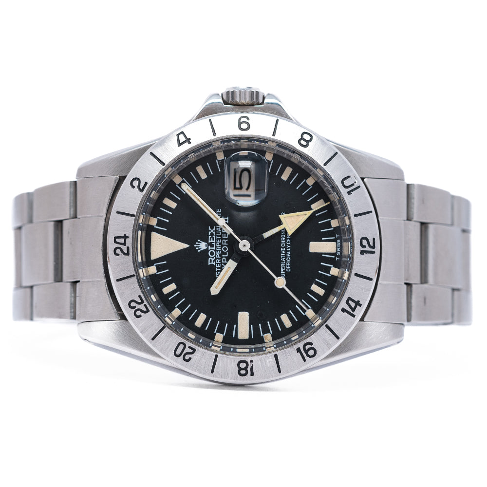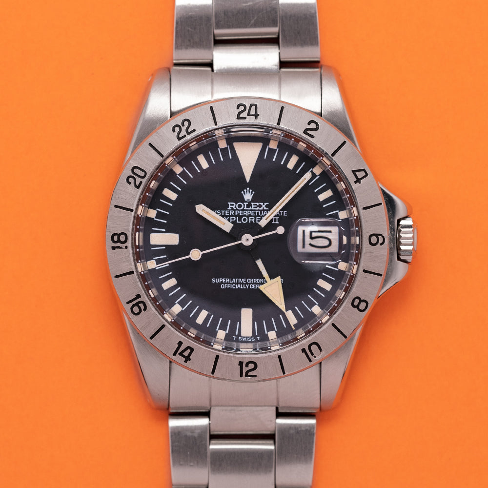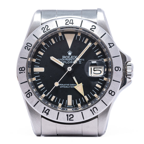 Here we have a 1975 Rolex Explorer II "Freccione" 1655 "Albino" MK2 so named in Italy where “Freccione” means Arrow in reference to its orange GMT hand. The 40mm polished and brushed stainless steel Oyster case curves over your wrist with thick tapered lugs, a lug-to-lug length of 46mm and a case thickness of 13mm giving the watch an impressive wrist presence. On the right side at 3 o’clock a signed screw-down crown protected by crown guards. The stainless steel MK2 bezel has large 24-hour numerals engraved into it painted black holding a flat plexiglass crystal above a black MK2 dial. Squares of Tritium mark the 24 hours while baton indexes coated in Tritium mark the hours, at 3 o’clock a date window with cyclops magnification on the plexiglass. At 12 o’clock an inverted triangle coated in Tritium, slender sword minute and hour hands are infilled with Tritium, and a large triangular tipped 24-hour GMT hand hits the square marker precisely, over time the orange hand has turned a yellow/white hence “Albino”, complemented by a lollipop counterweighted sweeping second hand. At 12 o’clock we have the Rolex motif with “Rolex Oyster Perpetual Date Explorer II” printed underneath, and at 6 o’clock “Superlative Chronometer Officially Certified” completes this rugged travel companion. On the reverse, a screw-down coin-edged case back, inside an automatic Rolex Cal. 1575, 25 jewels, 19,800 beats per hour, this quality movement was introduced in 1965. The watch comes fitted on its 20mm Rolex Oyster stainless steel bracelet ref. 78360, 580 end links and a signed folded clasp ref. 62570H, Circa. 1976 - the bracelet has 12 links in total.