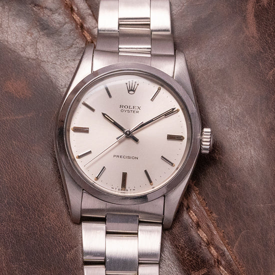 Here we have a 1975 Rolex Oyster Precision 6426 Manually Wound with a 34mm stainless steel Oyster case, the slender case has a subtle curve towards the satin-finished drilled lugs with a lug-to-lug length of 41.5mm and a thickness of 9mm ensuring a comfortable fit on your wrist. On the right side, is a signed screw-down crown. The polished chamfered bezel holds a domed crystal above a sunburst silver dial, an outer minute track with Tritium lume pips and applied bevel-edged baton indexes marking the hours, slender sword hands infilled with Tritium are complemented by a tapered centre second hand. Text is precisely printed with “Rolex Oyster” underneath the applied Rolex crown, at 6 o’clock you find printed “Precision”. On the reverse, a coin-edged screw-down case back, inside a manually wound Rolex Cal. 1225, 17 jewels, 21,600 beats per hour. The watch comes fitted on its original 19mm Oyster bracelet with a signed folding clasp.
